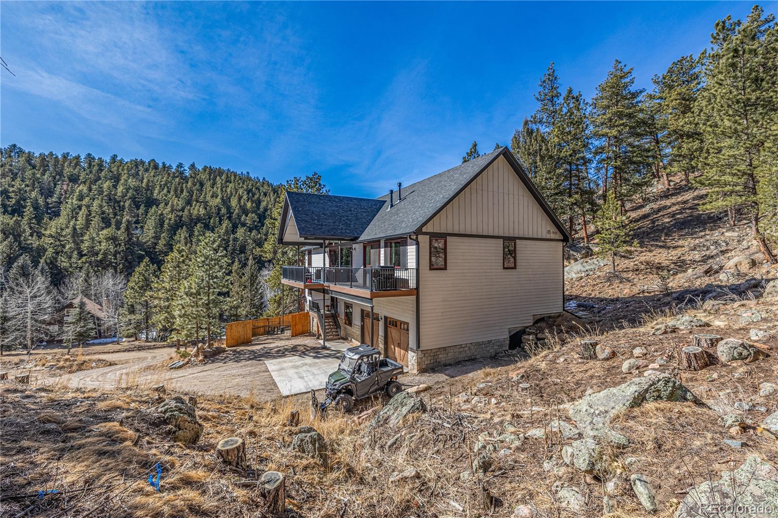 Prepare to be amazed! This luxurious custom mountain retreat is surrounded by awe-inspiring views! The home itself boasts a modern mountain lifestyle where soaring ceilings include wood accents and dazzling light fixtures. The chic black steel handrails will lead you through the impressive open floorplan where plenty of windows flood the home with natural light and gorgeous scenery! The chef's kitchen is equipped with ample cabinetry, quartz countertops, subway tile backsplash, a pantry, stainless steel appliances such as dual wall ovens, and a center island. You'll love the grand primary suite showcasing a 2nd fireplace, direct outdoor access, a walk-in closet for all your belongings, sliding barn doors, and a lavish ensuite that includes a soaking tub and generous walk in shower. On this level you will also find access to the spacious loft with skylights great for a recreation room and 2 additional bedrooms, one with an ensuite. The lower level includes a cozy den ideal for an office that attaches to a separate living space, great for a home business or could make a great multi-generational layout. Don't forget the home theater, work out room, studio suite with attached additional living space and outdoor access with a fenced dog run. Stairs won't be a problem in the future as the elevator is already framed in. No need to store your RV/camper, this lot includes it's parking space with 200 amp service. The lot provides tons of possibilities for recreational activities and includes an additional parcel with 15.29 acres for a total of "18.02 acres!" Zoned to allow business you can live and locate your business here, use a portion as a vacation rental, the possibilities are endless! Located in beautiful Roland Valley and just 6 minutes to US-285 you can feel secluded with an easy commute. The home of your dreams is here, book your private showing before it is gone!
