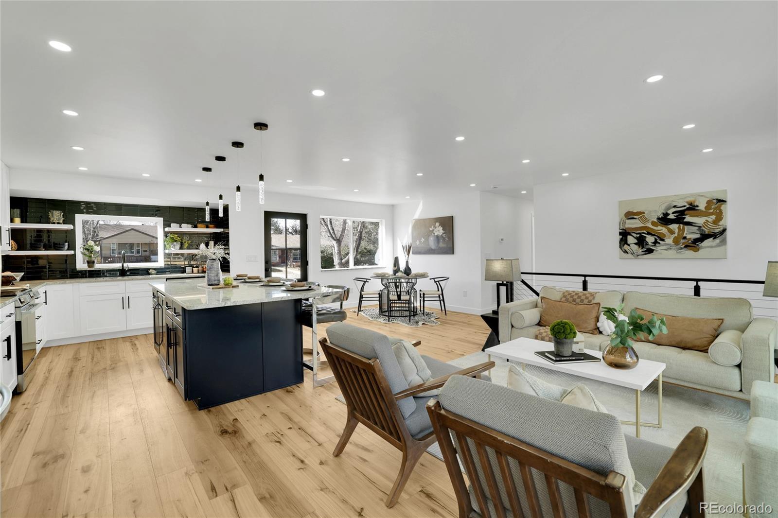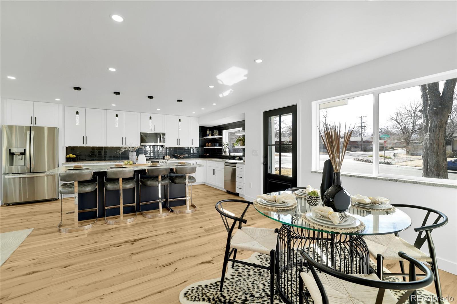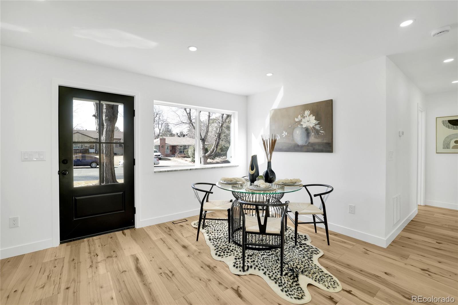 Welcome home! This fully renovated Virginia Village gem combines modern style with comfort and everyday living. From the moment you walk in, you’ll notice the bright, open-concept layout, wide-plank hardwood floors, and recessed lighting. The kitchen truly defines the home, featuring crisp white cabinetry, stainless steel appliances, granite countertops, a bold tile backsplash, and a large island with seating; perfect for hosting friends or casual weeknight dinners. It flows seamlessly into the dining area and living room, where oversized windows and sliding glass doors fill the space with natural light and connect you to the backyard. The bedrooms are well-sized and versatile, ideal for guests, a home office, or growing needs. Bathrooms have been thoughtfully updated with modern tile, sleek vanities, and quality fixtures. Stylish details like glass pantry doors, contemporary railings, and curated finishes throughout add character without sacrificing function. Step outside to a private, fully fenced yard with space to entertain, relax or let pets roam wild. Located close to parks, Cherry Creek, shopping, dining, and with easy access to I-25 and downtown Denver, this move-in-ready home offers the perfect blend of style, comfort, and convenience.