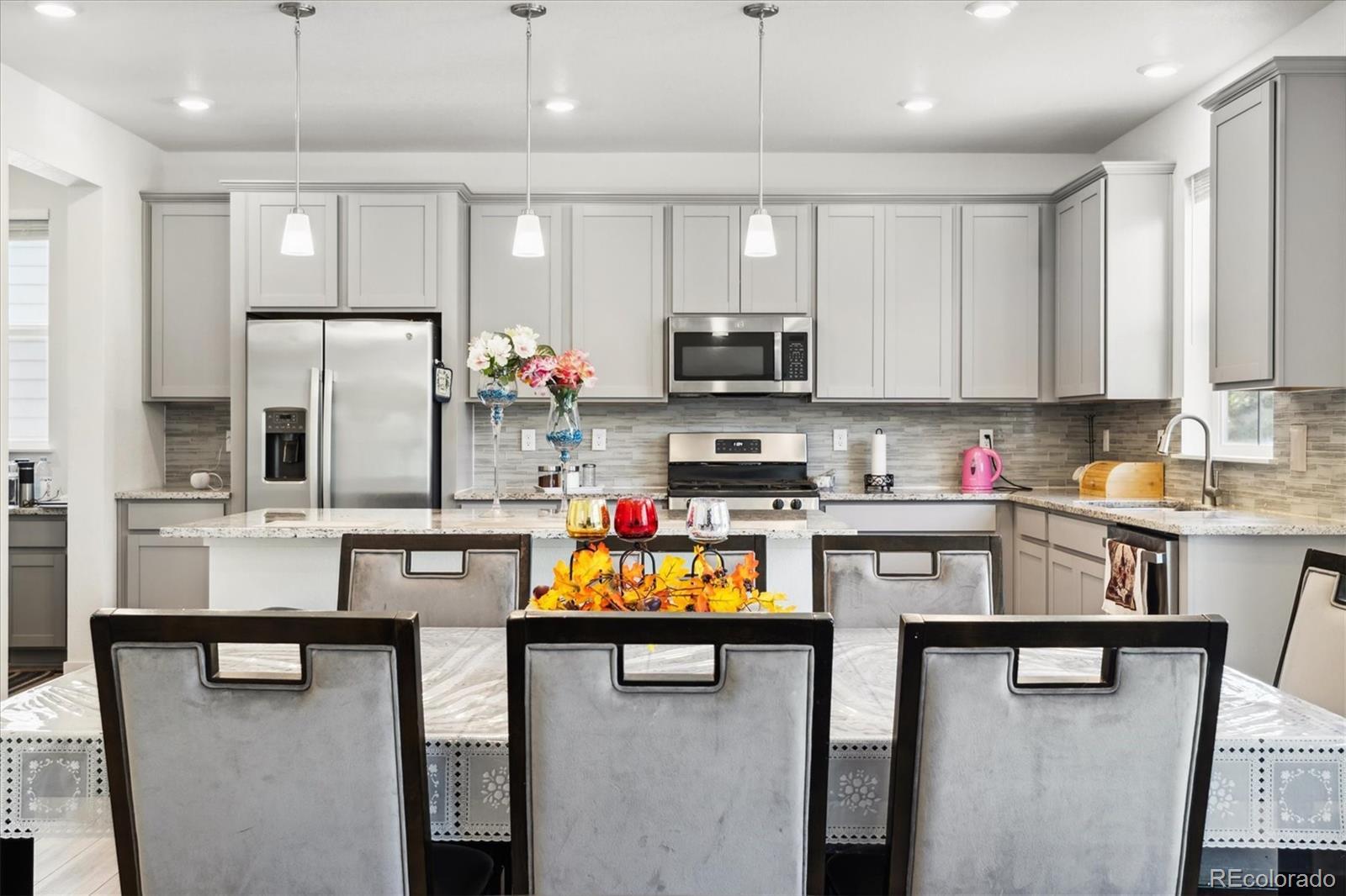 Welcome to 10983 Uvalda Street—where comfort, style, and convenience come together in the desirable Turnberry community. This recently constructed, like-new home features 4 spacious bedrooms, 2.5 bathrooms, and a thoughtfully designed open floor plan ideal for modern living. The heart of the home is the expansive kitchen, complete with granite countertops, stainless steel appliances, a gas range, large island with seating, and ample cabinet space. A versatile pocket office or butler’s pantry adds extra function and flexibility. The kitchen and dining areas flow seamlessly into the sun-filled great room, highlighted by vinyl flooring throughout, abundant windows, and direct access to the backyard patio. Upstairs, the oversized primary suite is a true retreat, boasting tray ceilings and an upgraded en suite bath with dual granite vanities, a tiled walk-in shower, and coordinating tile flooring. The fenced and landscaped yard offers outdoor enjoyment and privacy, while the unfinished basement presents an opportunity for future expansion, the possibilities are endless! A 2-car garage and attractive curb appeal complete this beautiful home. Throughout the property, you’ll find tasteful upgrades and finishes along with the latest in energy-efficient systems. Located just minutes from shopping, dining, and entertainment, Turnberry also offers easy access to DIA, Downtown Denver, Golden, Boulder, and more—making this home the perfect blend of comfort and convenience.