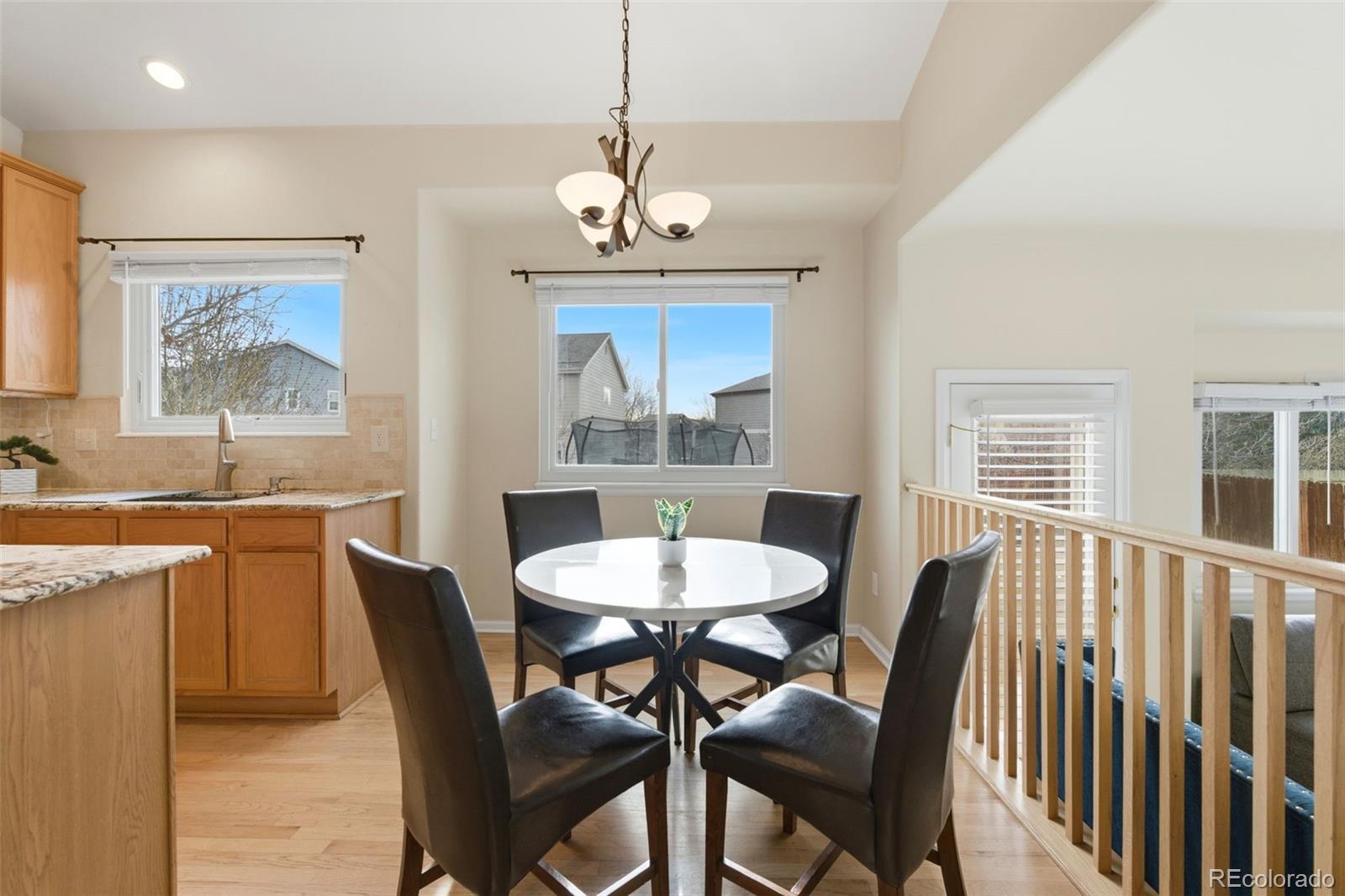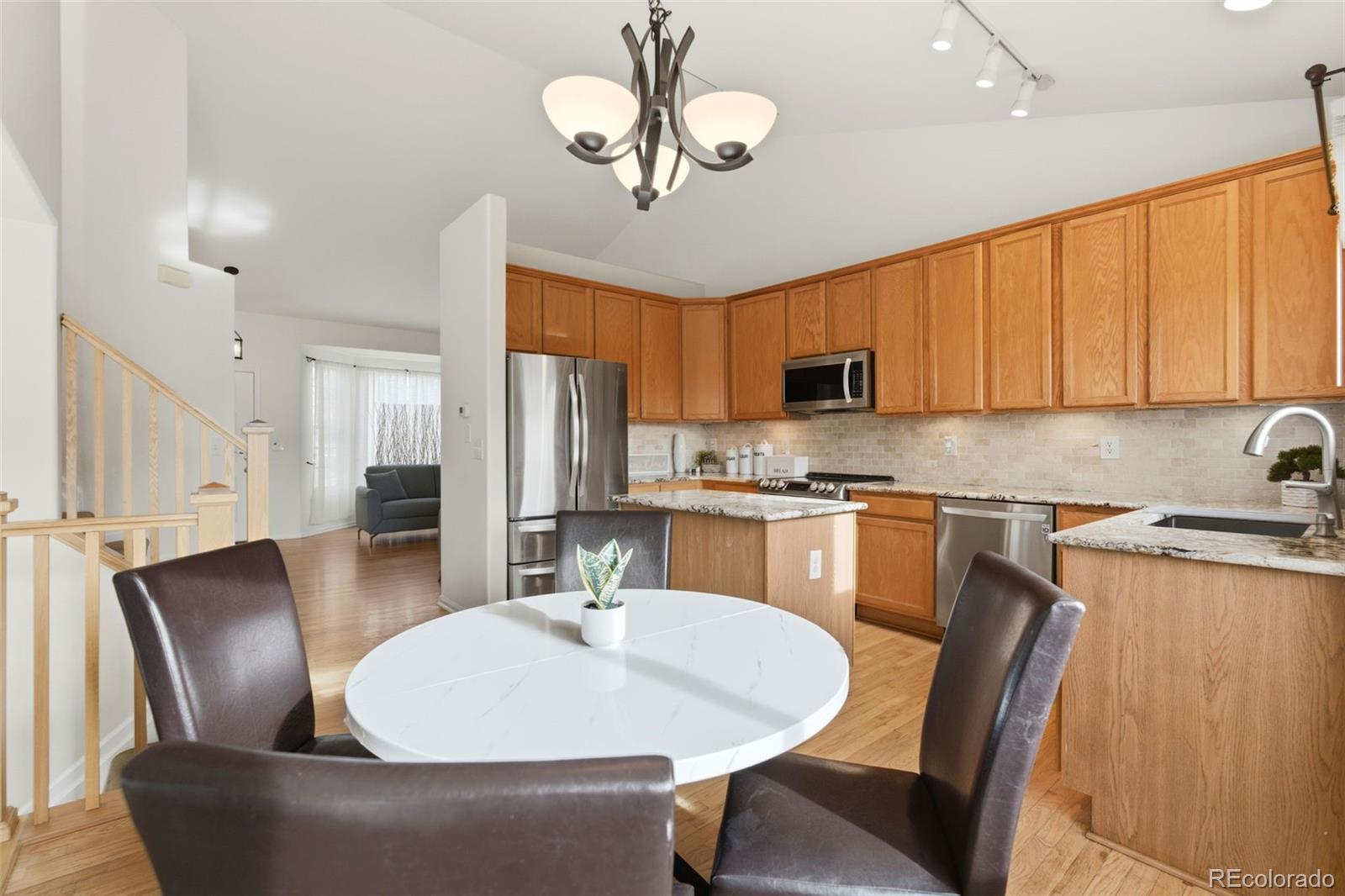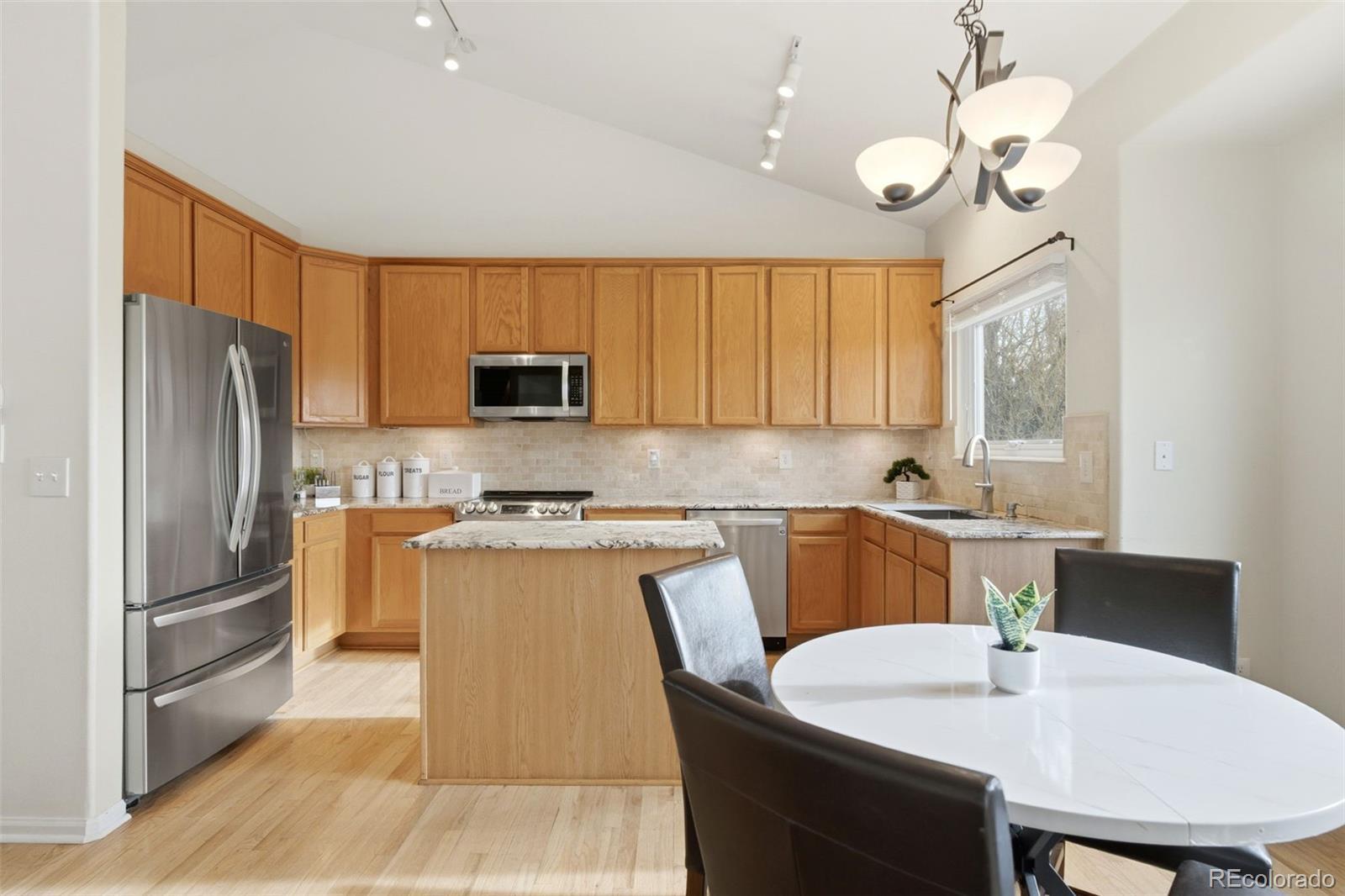 This beautifully maintained 3-bedroom, 2.5-bath home is located in the desirable Tuscany neighborhood, within the highly sought-after Cherry Creek School District, feeding into Grandview High School. From the moment you arrive, you’ll notice the inviting curb appeal highlighted by professional landscaping and a welcoming front patio. Inside, the home offers a bright and open living space featuring vaulted ceilings and a bay window that flows seamlessly into the updated eat-in kitchen. The kitchen is well-appointed with granite countertops, a travertine backsplash, stainless steel appliances, and updated fixtures, making it both functional and stylish. Just off the kitchen, the spacious family room provides a comfortable gathering space with a cozy gas fireplace. The primary suite offers a private retreat with a generous layout and a five-piece bathroom. Additional living space is found in the finished basement, completed in 2020, offering flexibility for a media room, home office, or recreation area. Step outside to a backyard designed for relaxation and entertaining, featuring a manicured lawn and mature trees that create a peaceful, park-like setting. This home has seen extensive updates in recent years, including newer windows, roof, furnace, air conditioning, kitchen appliances, flooring throughout the upper level, fresh interior and exterior paint, a whole-house humidifier, and updates to the kitchen and primary bath. Wood, luxury plank vinyl, and Pergo flooring throughout the home are all in excellent condition. Thoughtfully updated and truly move-in ready, this home is one you won’t want to miss—schedule your showing today.