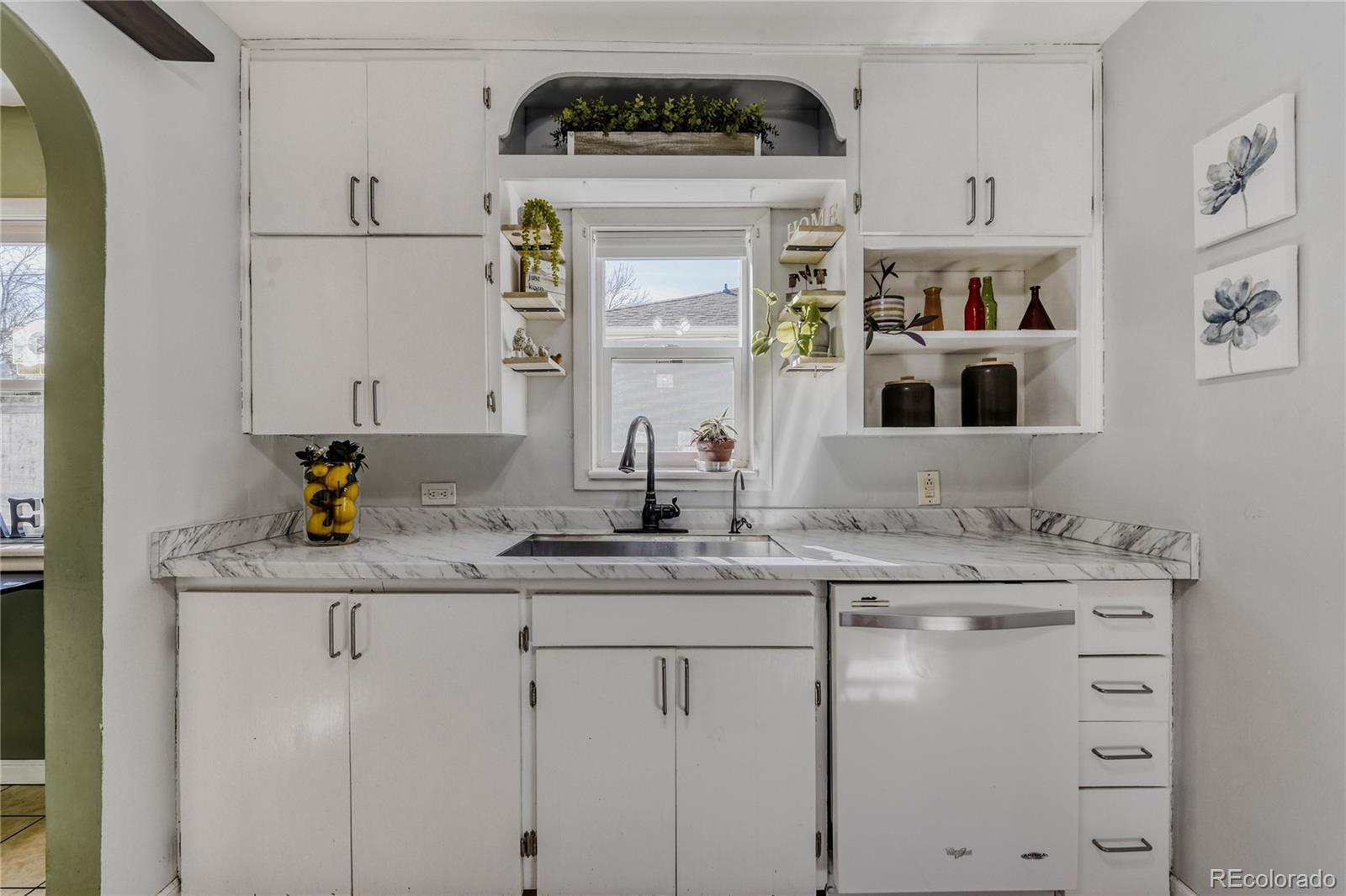 This charming ranch floor plan is ready to call home. Covered front porch welcomes you. Wood floors extend throughout the living room, hallway and bedrooms. The L-shaped living room is generous in size and sunshine with south-facing bay window and oversized window to the west. Wood burning fireplace with tile surround gives a cozy appeal. Front bedroom features ceiling fan and walk-in closet. The back bedroom also features a ceiling fan and built-in shelving. The full bath has been completely updated with pedestal sink, new tile and bidet. Charming built-in cabinet and drawers in hallway typical to homes from this era. The kitchen is light and bright with south-facing sunshine, ceiling fan, white cabinetry, gas stove and large sink with adjacent breakfast nook. Laundry space with stackable washer and dryer. Back door takes you to 12 x 23 covered back patio with lights, ceiling fan and curtains for shade. Large garden area and flat private fully fenced back yard are great for entertaining. Updated plumbing throughout the home. Tankless hot water heater and newer furnace and central air conditioning. Programmable thermostat. Close proximity to Kenton Elementary, West Middle and Aurora Central schools. Stanley Marketplace, Anschutz Medical Center, VA Hospital, and major commuter routes are only minutes away. Great location for shopping and dining. This home offers so much in location and features. Come see!