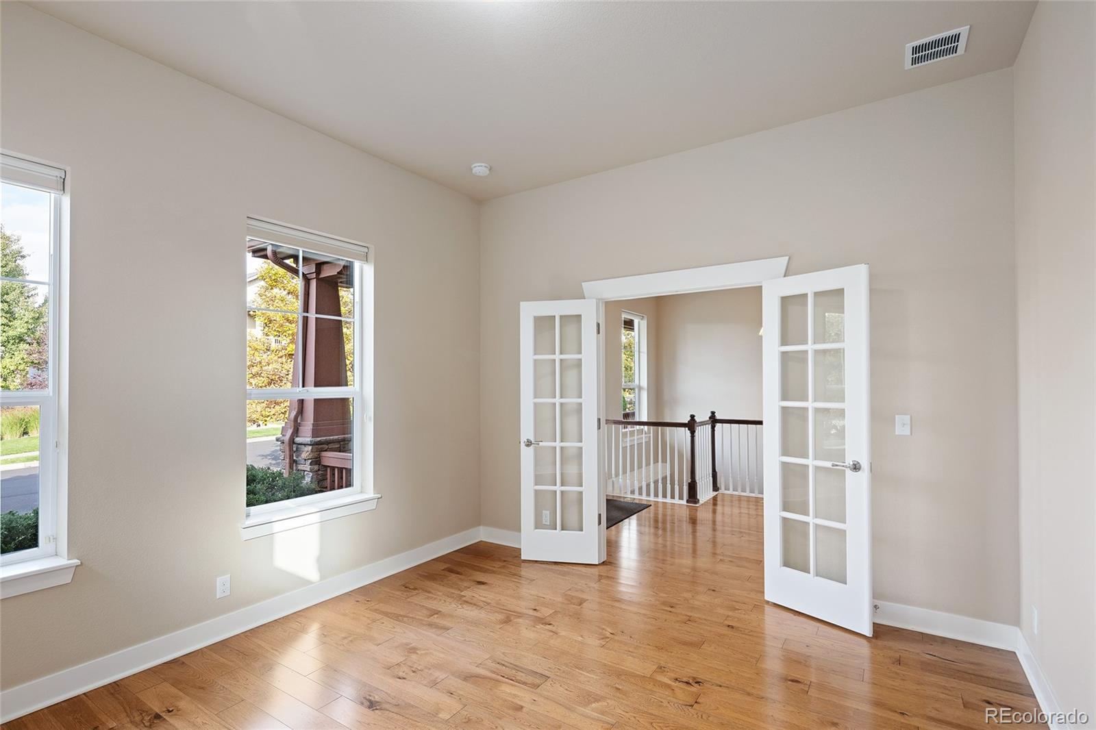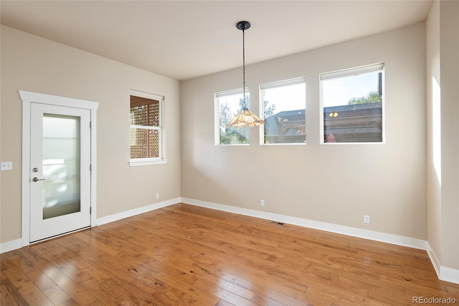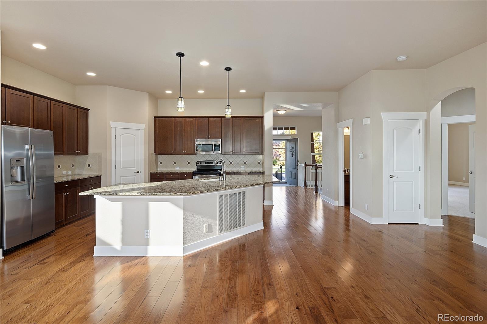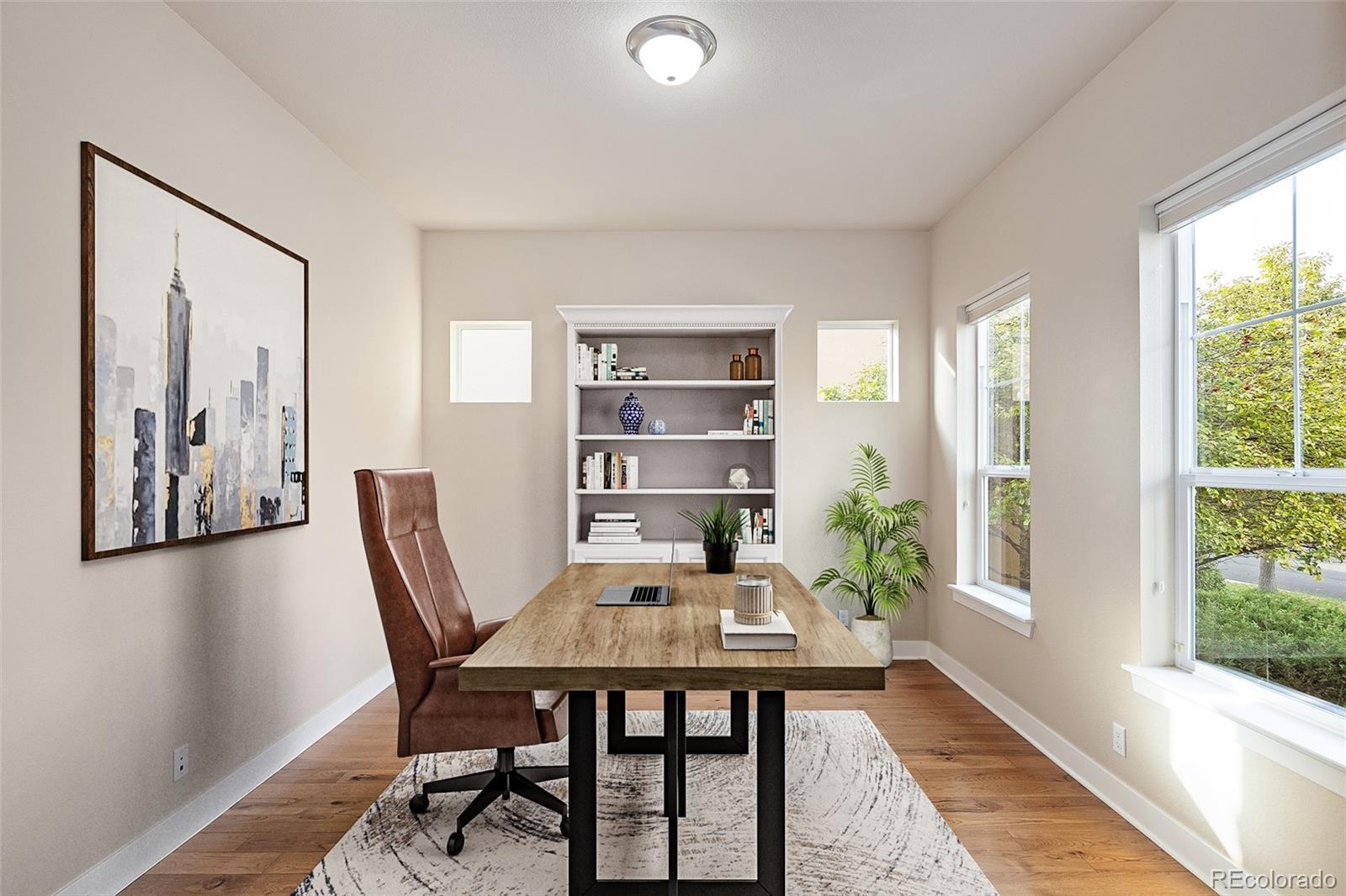 This spacious ranch-style home in Lowry offers the convenience of a main-level owner’s suite, perfect for comfortable, single-level living. Welcoming open entry leads to a main floor office with French doors - ideal for work or study. The gourmet kitchen is a true centerpiece, featuring rich cherry cabinetry, sleek granite countertops, stainless steel appliances & a large center island with seating - perfect space for casual dining or entertaining. Inviting living room highlighted by 6-inch-wide plank hardwood flooring & cozy gas fireplace. The light-filled primary suite features a 5-piece bath and generous walk-in closet. Professionally finished basement includes a spacious family room, two large bedrooms, a full bath and ample storage. Abundant outdoor space includes a covered front porch, covered back porch, and deck area, all surrounded by a low-maintenance yard. Just minutes from beautiful parks, cozy coffee shops, great dining, and favorite local spots like the Lowry Beer Garden and Wings Over the Rockies Museum —this home embodies the heart of Lowry living. A thoughtfully designed main-level laundry and mudroom provide everyday convenience and functionality. A spacious crawl space offers a convenient bonus storage area, perfect for seasonal items or extra belongings. Recent updates include a new roof (2021) and water heater (2019).