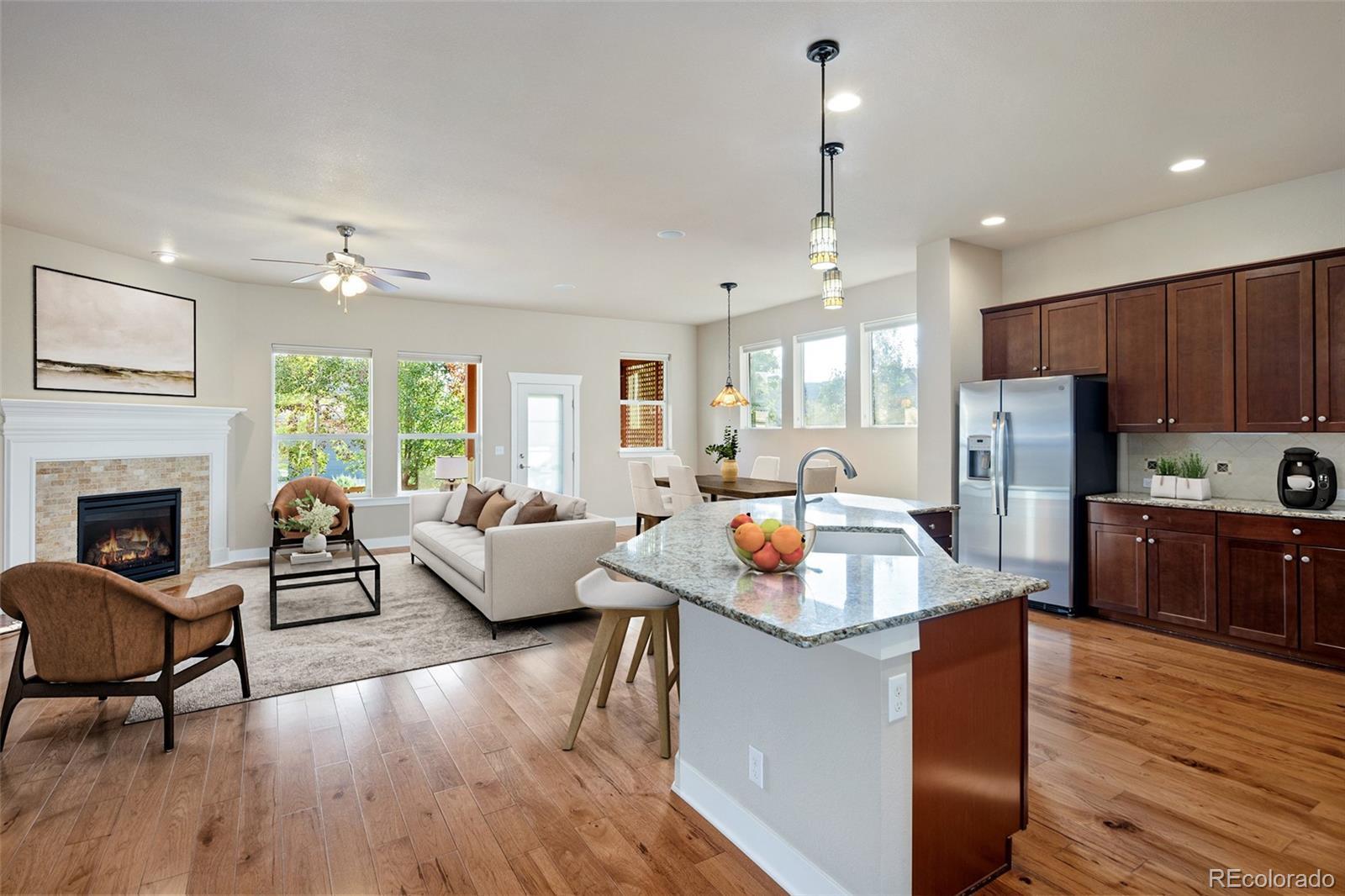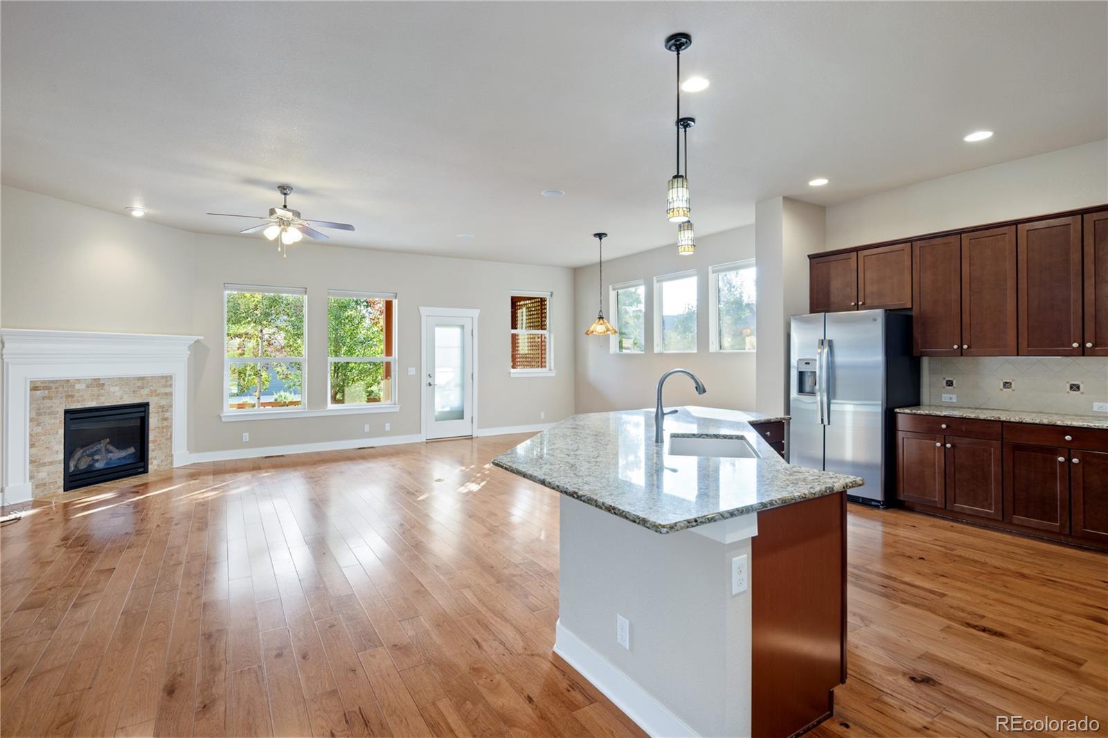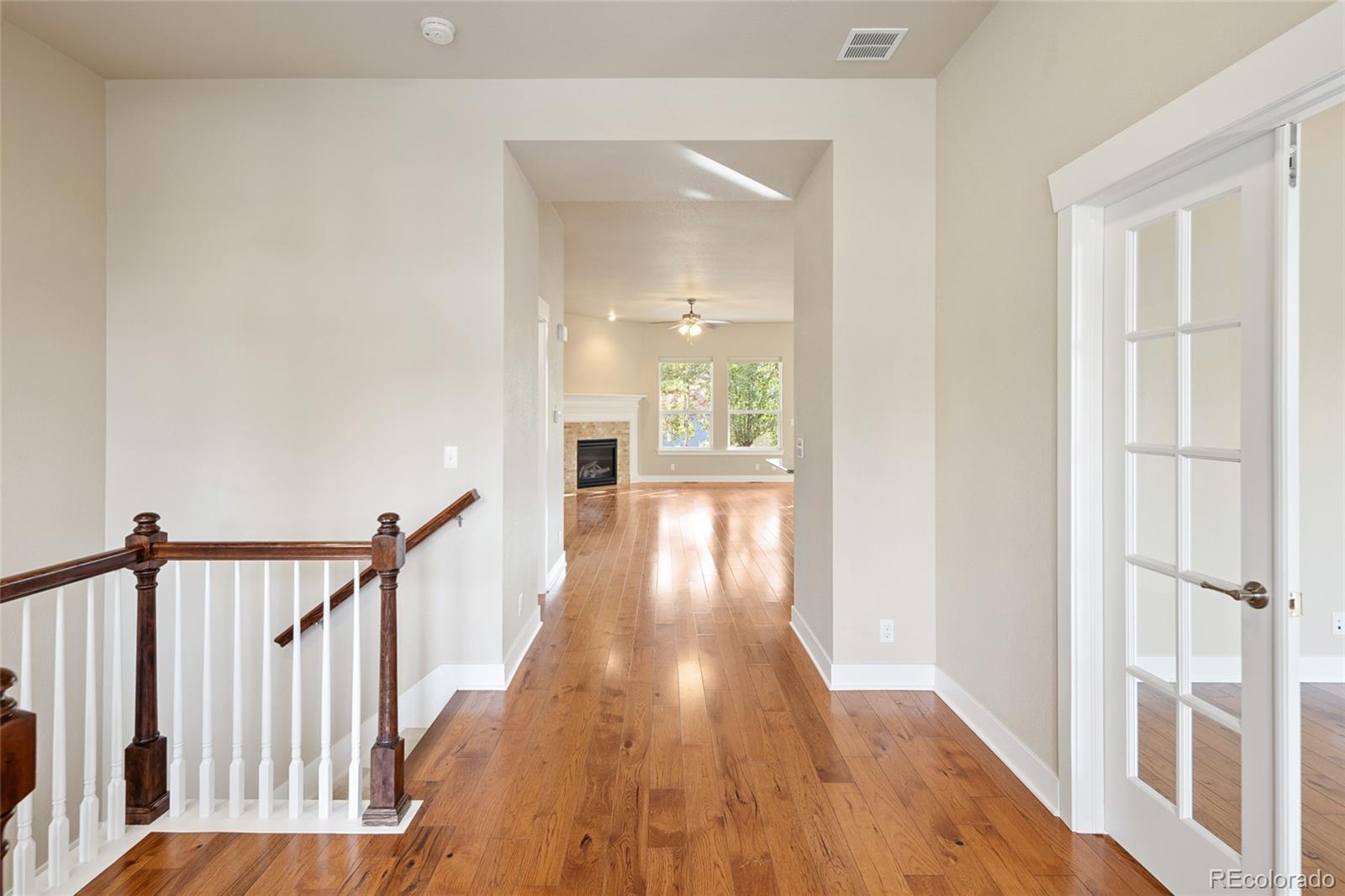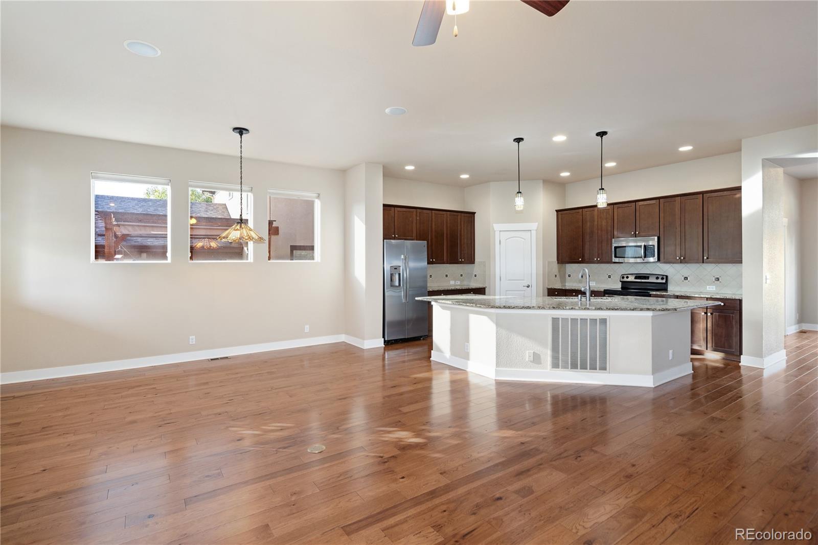 This spacious ranch-style home in Lowry offers the convenience of a main-level owner’s suite, perfect for comfortable, single-level living. Welcoming open entry leads to a main floor office with French doors - ideal for work or study. The gourmet kitchen is a true centerpiece, featuring rich cherry cabinetry, sleek granite countertops, stainless steel appliances & a large center island with seating - perfect space for casual dining or entertaining. Inviting living room highlighted by 6-inch-wide plank hardwood flooring & cozy gas fireplace. The light-filled primary suite features a 5-piece bath and generous walk-in closet. Professionally finished basement includes a spacious family room, two large bedrooms, a full bath and ample storage. Abundant outdoor space includes a covered front porch, covered back porch, and deck area, all surrounded by a low-maintenance yard. Just minutes from beautiful parks, cozy coffee shops, great dining, and favorite local spots like the Lowry Beer Garden and Wings Over the Rockies Museum —this home embodies the heart of Lowry living. A thoughtfully designed main-level laundry and mudroom provide everyday convenience and functionality. A spacious crawl space offers a convenient bonus storage area, perfect for seasonal items or extra belongings. Recent updates include a new roof (2021) and water heater (2019).