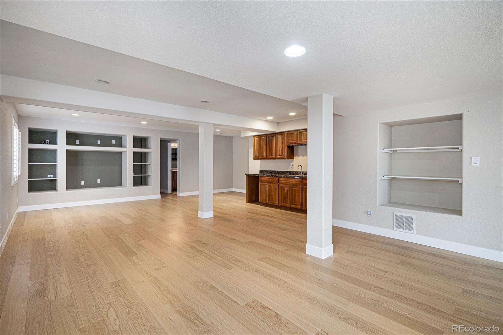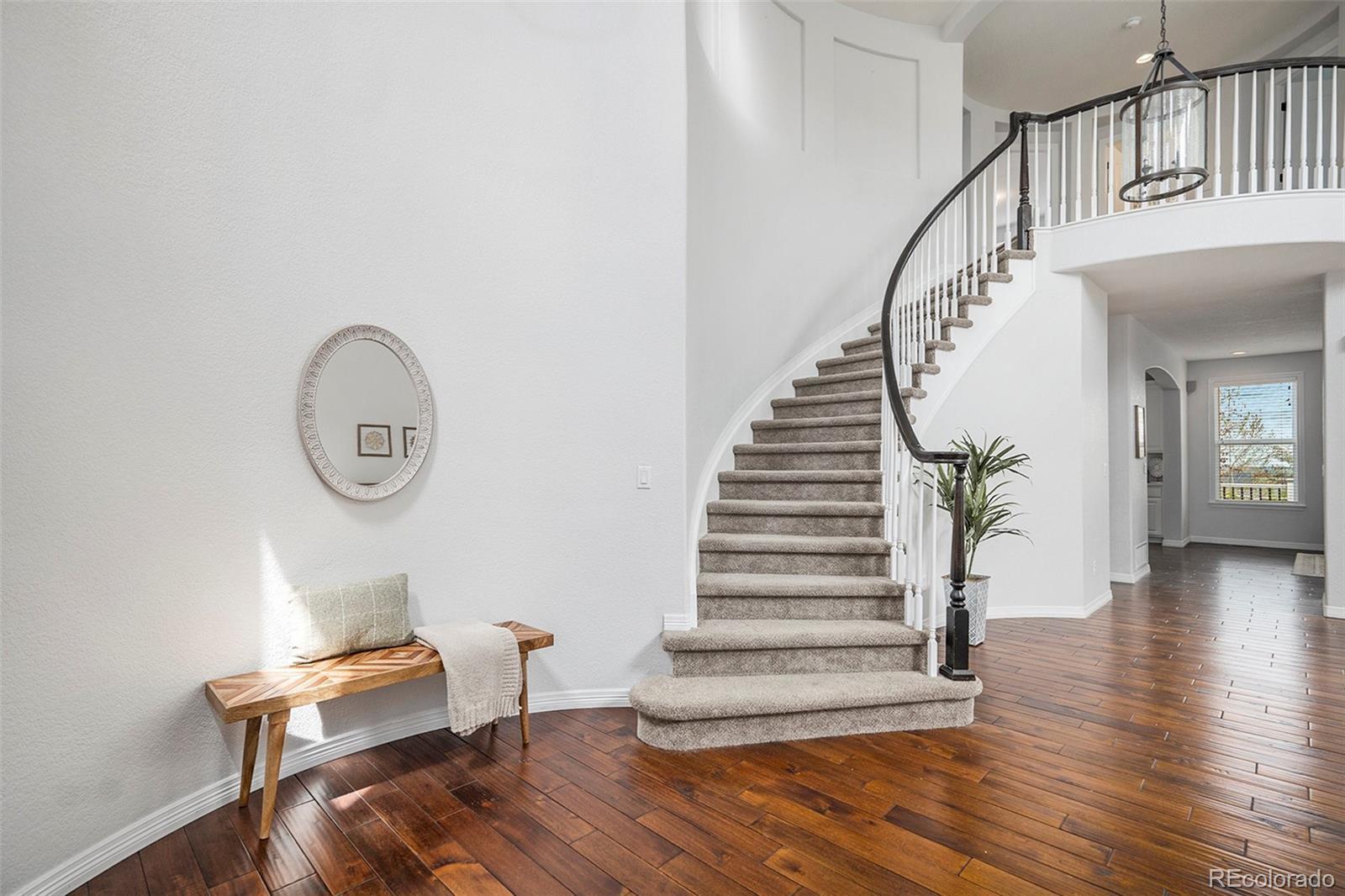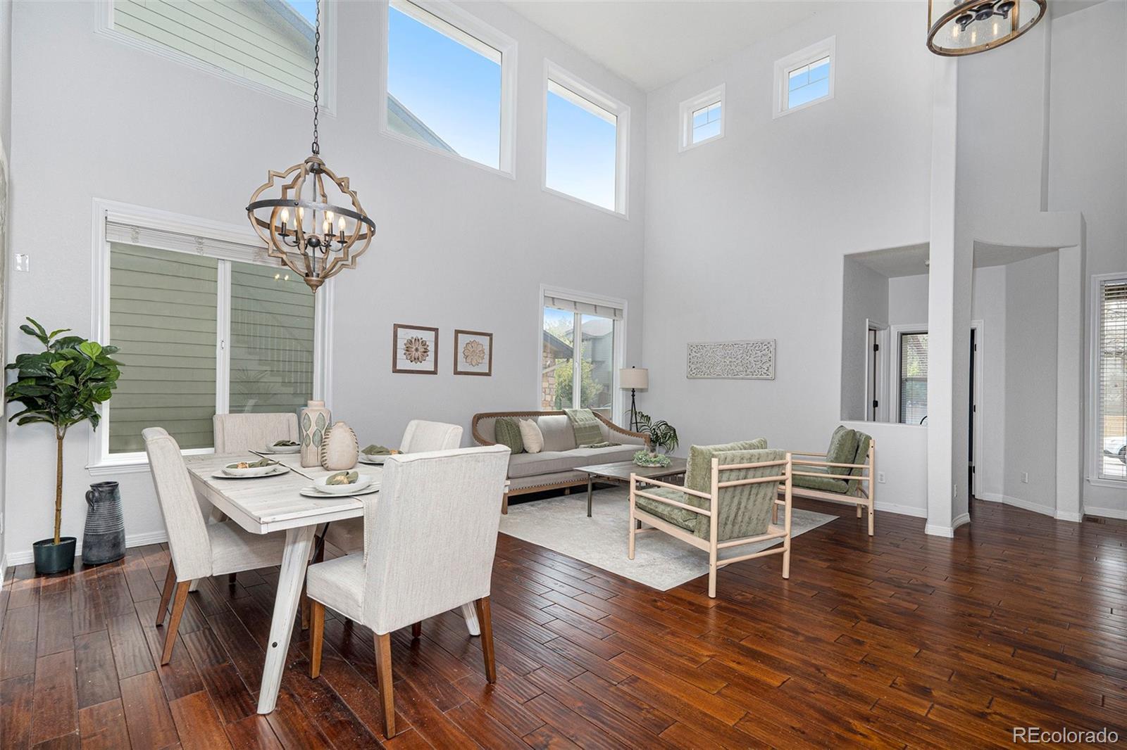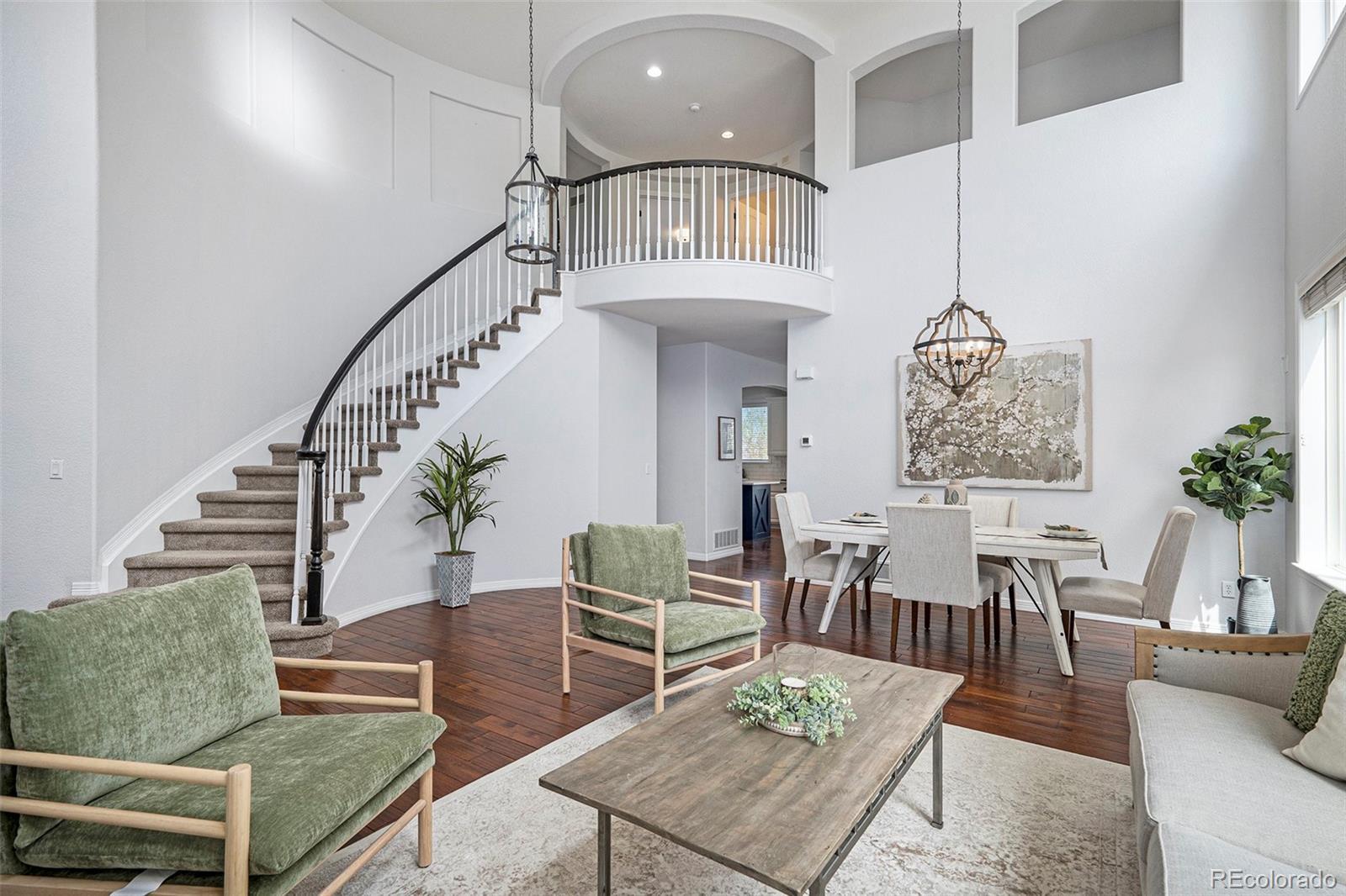 This is it! An exceptional home in the heart of Firelight offering breathtaking, views of the mountains and Downtown Denver, with a flexible floor plan. Upstairs, the primary suite includes a large sitting area that was originally constructed as the home’s fifth bedroom. At the buyer’s request, the sellers will re-enclose this space prior to closing, creating a five-bedroom home in addition to a dedicated main-floor office. The primary suite features two walk-in closets, a five-piece bathroom, and a private balcony with stunning views. Two additional bedrooms, a full bathroom, and a built-in office loft complete the upper level. The main level features formal living and dining rooms with dramatic 18-foot vaulted ceilings, an office, and a full bathroom. The bright open-concept kitchen offers quartz countertops, stainless steel appliances, and a breakfast nook with built-in bench seating that opens directly to the extended deck. The adjoining family room with fireplace provides a warm gathering space. The laundry connects to the 3-car tandem garage with backyard access. The fully finished walk-out basement includes an additional family room, bedroom, full bathroom, wet bar, and two bonus rooms. Step outside to the patio and newly landscaped backyard with new sod and mulch. Additional highlights include Kahrs European-imported hardwood flooring, no carpet anywhere in the home, new interior paint, and newer exterior paint. Enjoy walking distance to Red-Tail Park, with miles of trails connecting to the East/West Trail System. Residents also enjoy access to four recreation centers. 1% Lender Credit Available — Buyers using the preferred lender may be eligible for a 1% credit toward closing costs or an interest-rate reduction. This home offers exceptional views, flexible living spaces, premium finishes, and an unbeatable Firelight location—a rare opportunity you don’t want to miss.