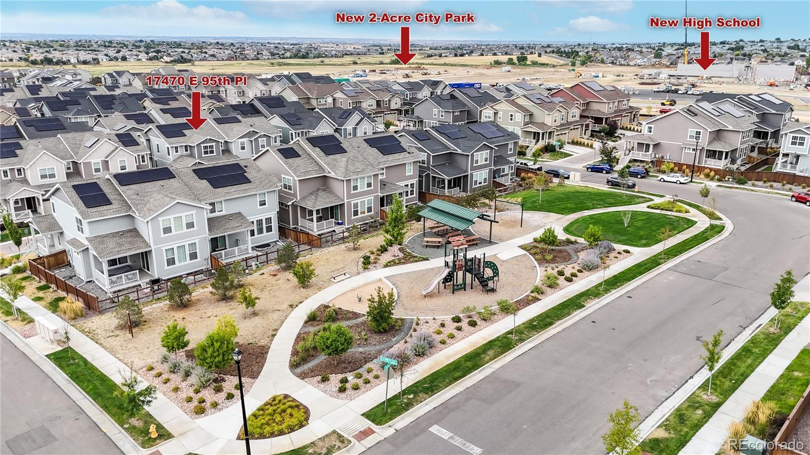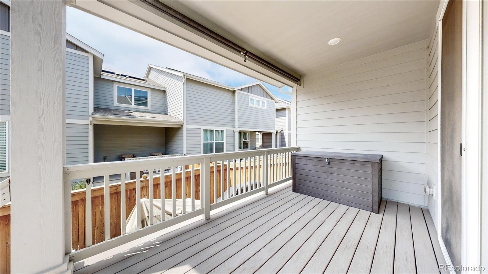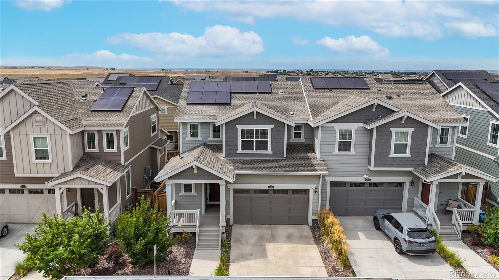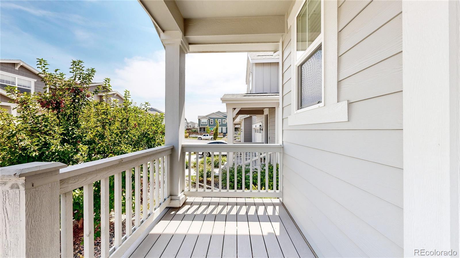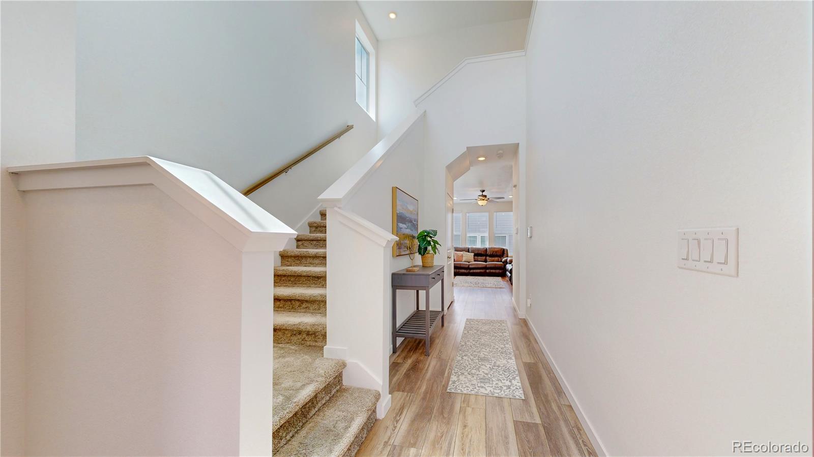 Like new and loaded with upgrades, this 3-bedroom, 3-bath home in Buffalo Highlands welcomes you with a dramatic 2-story foyer that flows into an open main floor with high ceilings, oversized doors, and abundant natural light. The spacious kitchen is the heart of the home, showcasing a large island with sink, dishwasher, breakfast bar, pendant lighting, and extra storage. Granite countertops, white shaker cabinets, a glass tile backsplash, pantry, and stainless appliances—including a gas range and upgraded refrigerator with changeable panel—are complemented by professionally installed dining area cabinetry with quartz countertops, wine storage, soft-close drawers, and an additional pantry. High-grade LVP flooring extends throughout the main level. Upstairs, the primary suite features a tray ceiling, smart lighting, a ceiling fan, large walk-in closet, and en-suite bath with granite double vanity, luxury vinyl flooring, and tiled shower. Two additional bedrooms share a full bath and each have walk-in closets and ceiling fans, and the second-floor laundry includes the washer and dryer. The finished basement with two egress windows offers a spacious rec room large enough to accommodate multiple uses—such as a media area and game room, or an office and gym—while still leaving room to grow. Outdoor living shines with a covered Trex deck with shades, paver patio, and garden area in the low-maintenance yard. Smart features include three smart lights, doorbell, exterior camera, and Flo by Moen water monitoring with water softener. The 2-car garage is fully drywalled with overhead storage and extra outlets. Solar panels (leased at $38/mo) help reduce energy costs. Close to parks—including a new 2-acre city park—trails, a K–8 tuition-free charter school, Prairie Center shopping district, rec center, DIA, major routes, and just 30 minutes to Downtown Denver. A soon-to-open high school sits just across 96th, and a pocket park with playground is right around the corner.