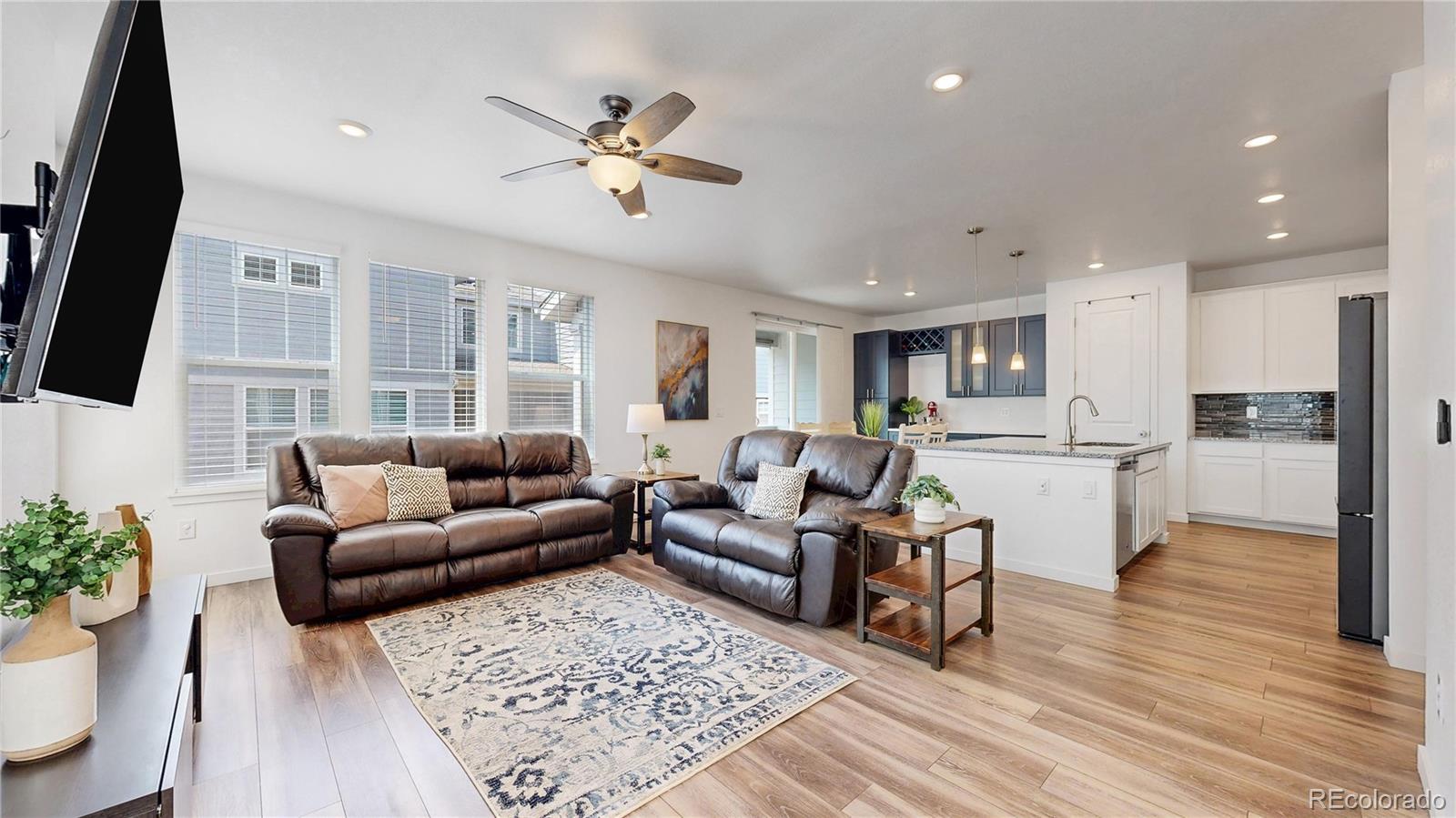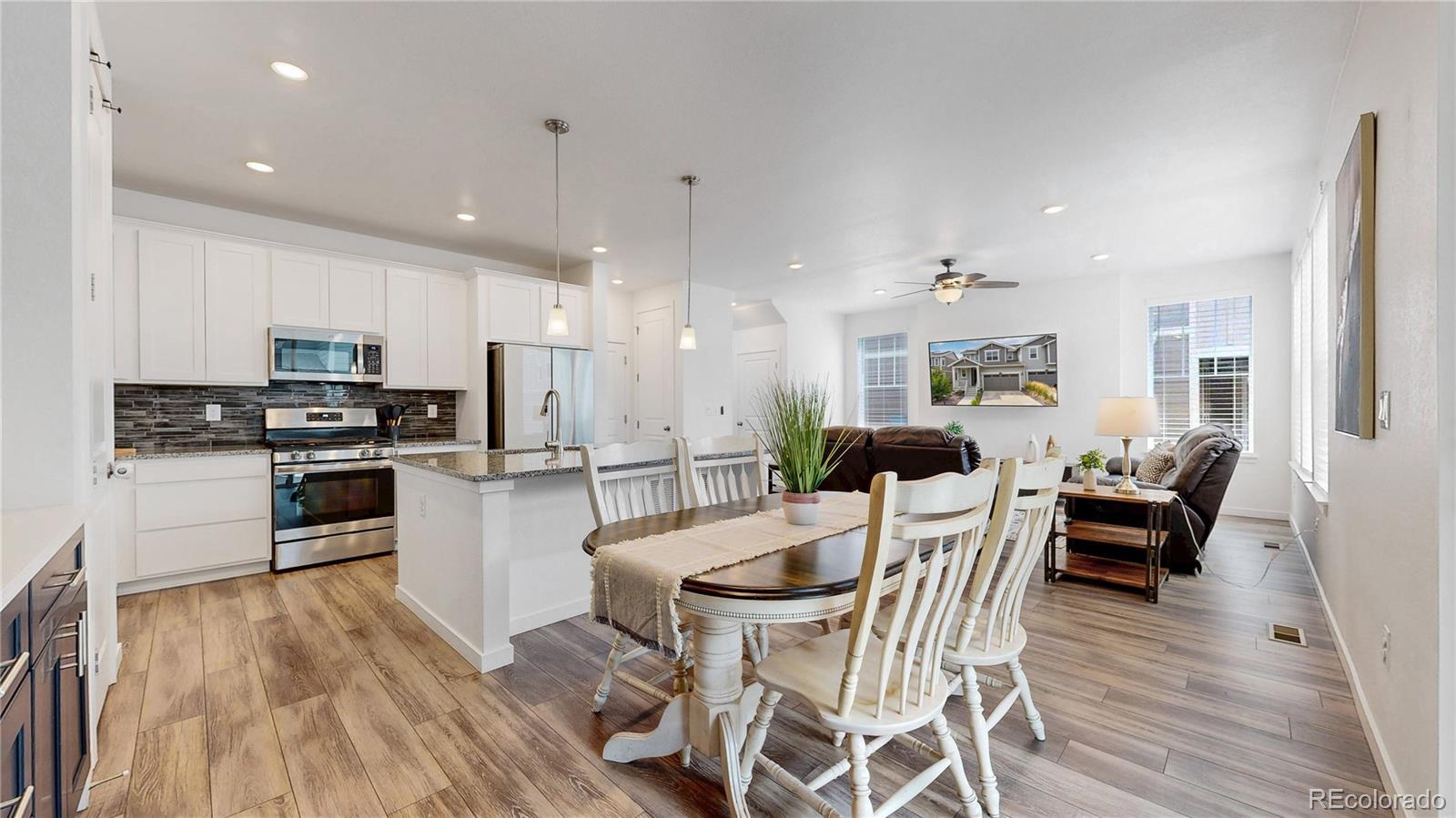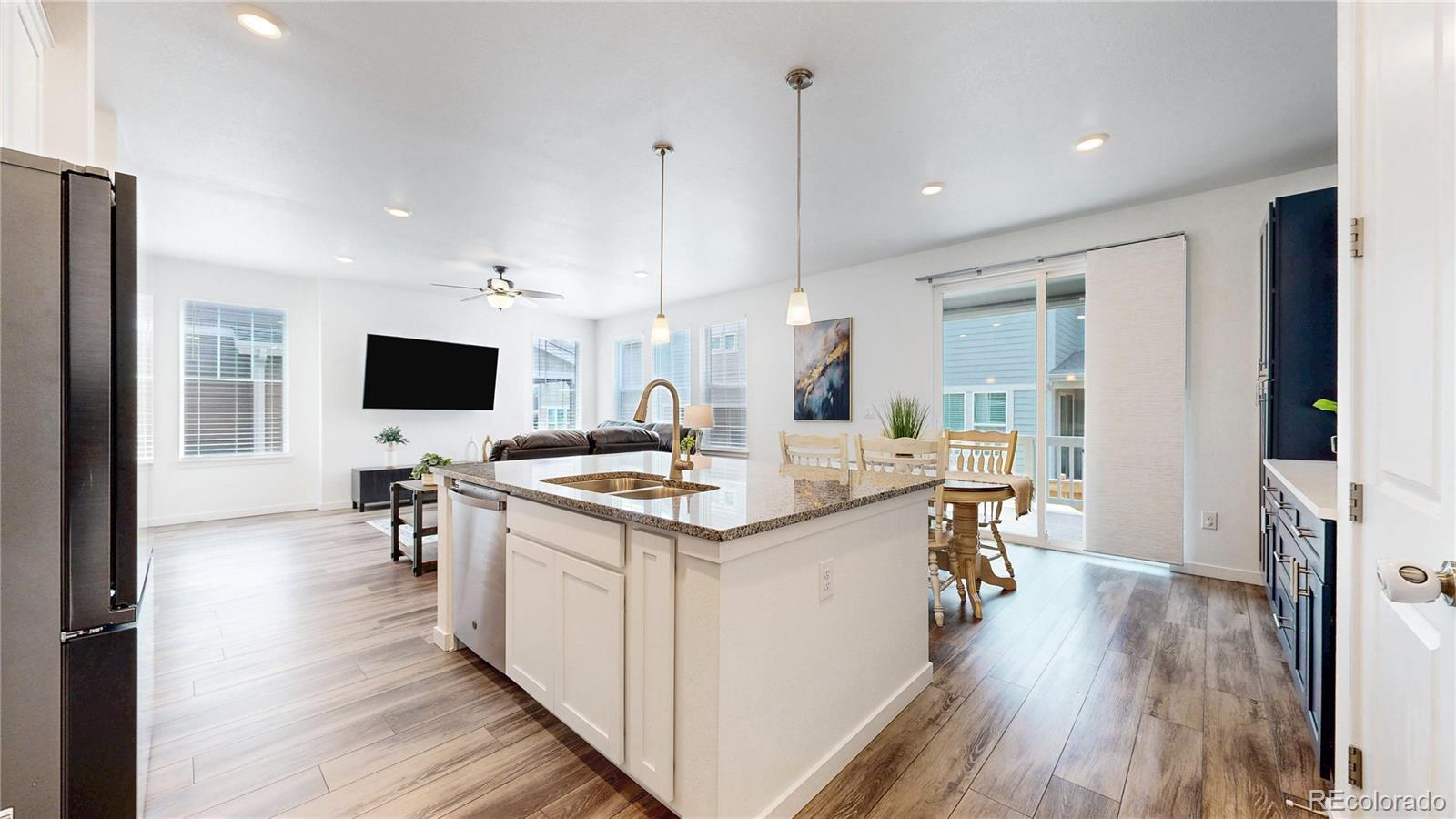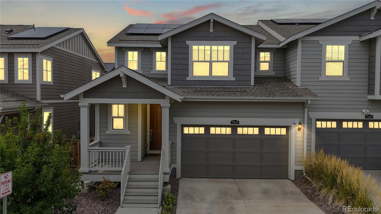 Like new and loaded with upgrades, this 3-bedroom, 3-bath home in Buffalo Highlands welcomes you with a dramatic 2-story foyer that flows into an open main floor with high ceilings, oversized doors, and abundant natural light. The spacious kitchen is the heart of the home, showcasing a large island with sink, dishwasher, breakfast bar, pendant lighting, and extra storage. Granite countertops, white shaker cabinets, a glass tile backsplash, pantry, and stainless appliances—including a gas range and upgraded refrigerator with changeable panel—are complemented by professionally installed dining area cabinetry with quartz countertops, wine storage, soft-close drawers, and an additional pantry. High-grade LVP flooring extends throughout the main level. Upstairs, the primary suite features a tray ceiling, smart lighting, a ceiling fan, large walk-in closet, and en-suite bath with granite double vanity, luxury vinyl flooring, and tiled shower. Two additional bedrooms share a full bath and each have walk-in closets and ceiling fans, and the second-floor laundry includes the washer and dryer. The finished basement with two egress windows offers a spacious rec room large enough to accommodate multiple uses—such as a media area and game room, or an office and gym—while still leaving room to grow. Outdoor living shines with a covered Trex deck with shades, paver patio, and garden area in the low-maintenance yard. Smart features include three smart lights, doorbell, exterior camera, and Flo by Moen water monitoring with water softener. The 2-car garage is fully drywalled with overhead storage and extra outlets. Solar panels (leased at $38/mo) help reduce energy costs. Close to parks—including a new 2-acre city park—trails, a K–8 tuition-free charter school, Prairie Center shopping district, rec center, DIA, major routes, and just 30 minutes to Downtown Denver. A soon-to-open high school sits just across 96th, and a pocket park with playground is right around the corner.