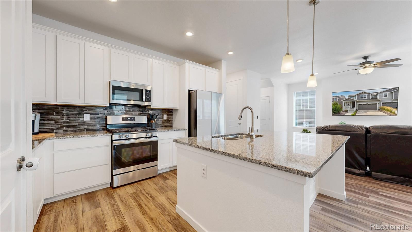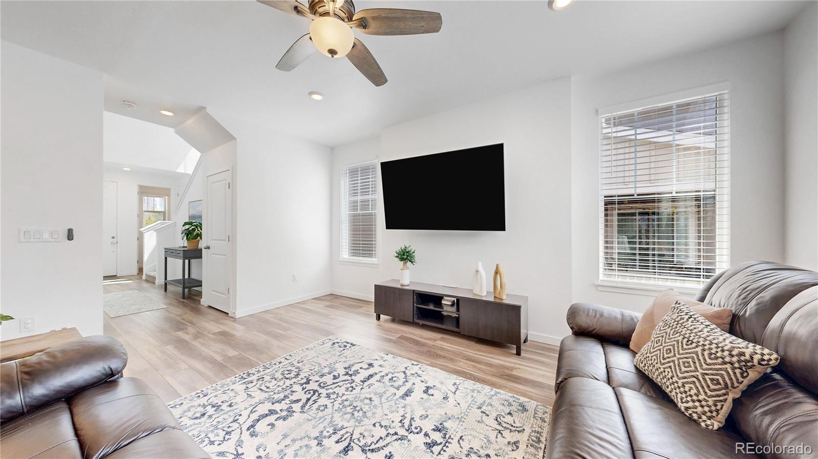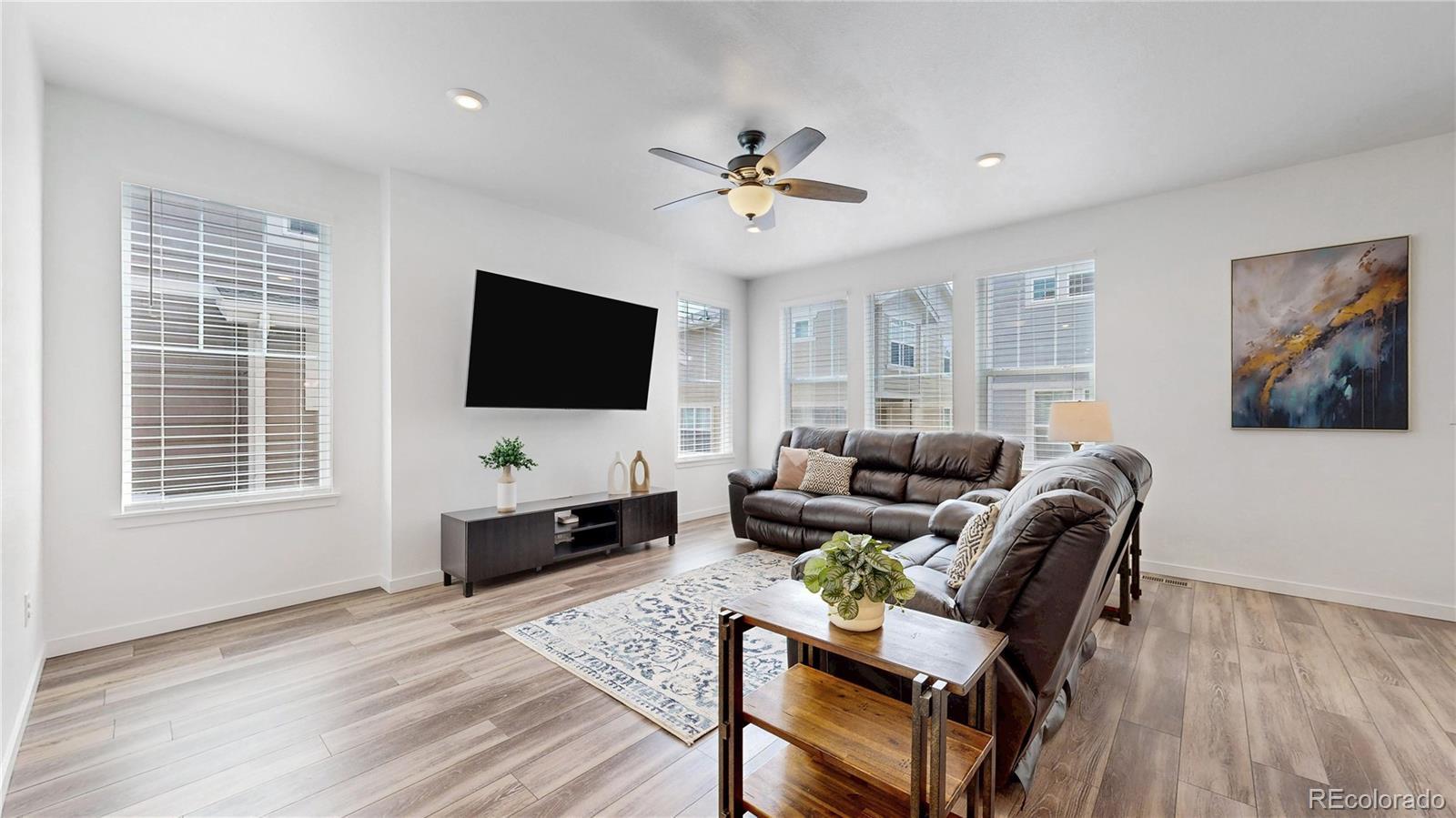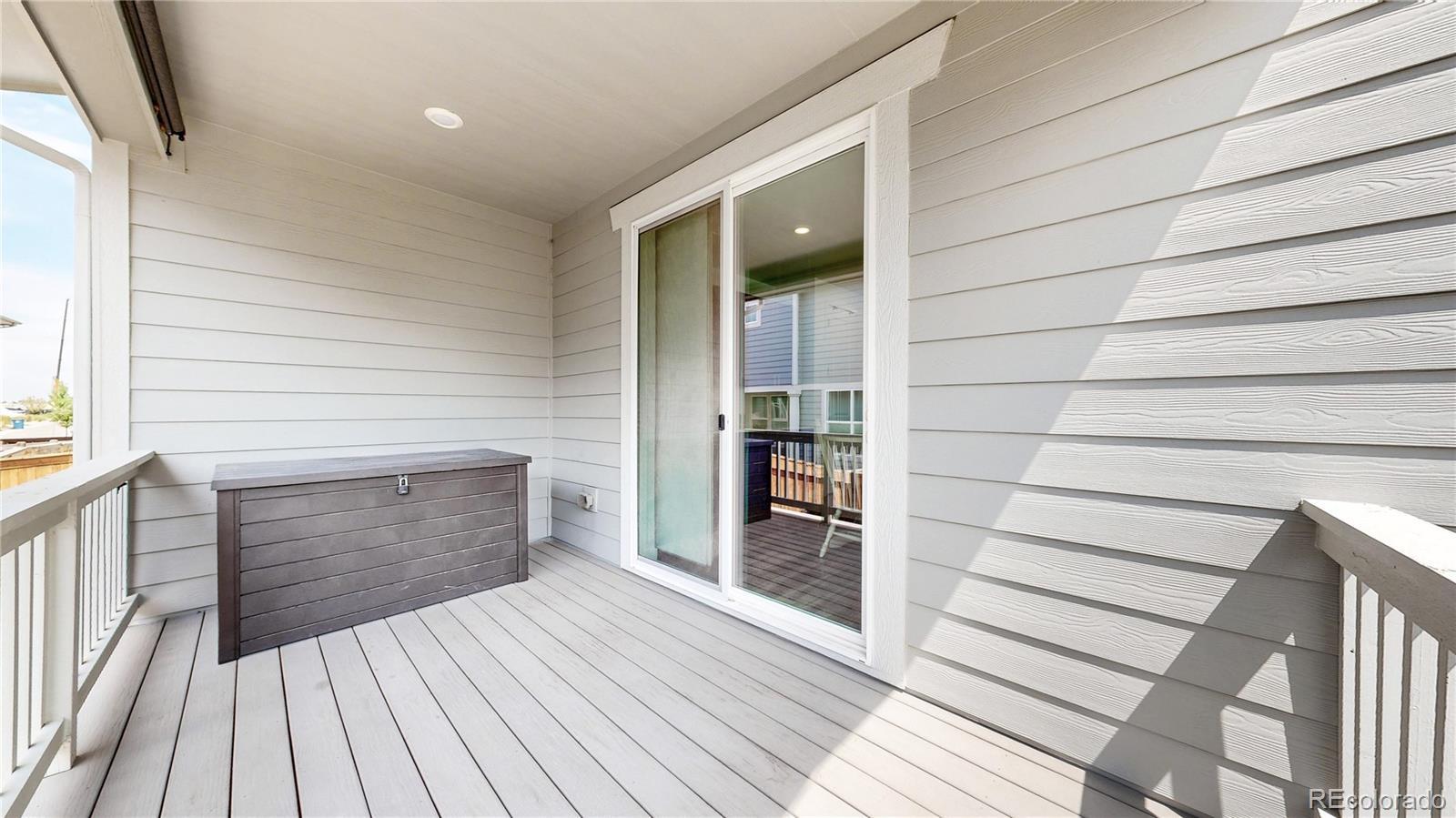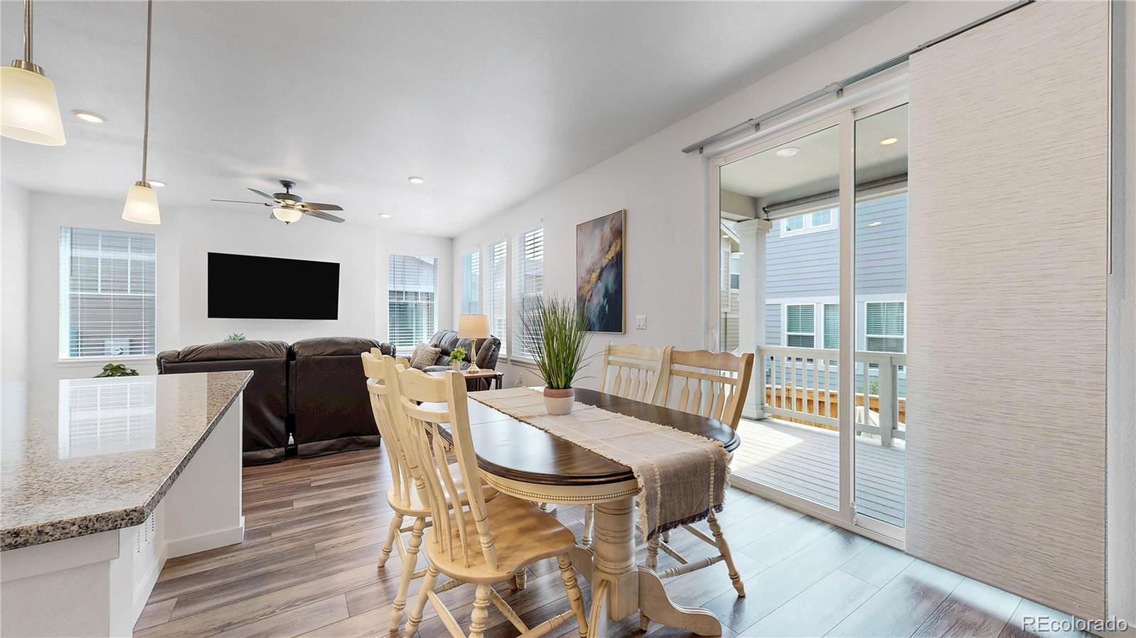 Like new and loaded with upgrades, this 3-bedroom, 3-bath home in Buffalo Highlands welcomes you with a dramatic 2-story foyer that flows into an open main floor with high ceilings, oversized doors, and abundant natural light. The spacious kitchen is the heart of the home, showcasing a large island with sink, dishwasher, breakfast bar, pendant lighting, and extra storage. Granite countertops, white shaker cabinets, a glass tile backsplash, pantry, and stainless appliances—including a gas range and upgraded refrigerator with changeable panel—are complemented by professionally installed dining area cabinetry with quartz countertops, wine storage, soft-close drawers, and an additional pantry. High-grade LVP flooring extends throughout the main level. Upstairs, the primary suite features a tray ceiling, smart lighting, a ceiling fan, large walk-in closet, and en-suite bath with granite double vanity, luxury vinyl flooring, and tiled shower. Two additional bedrooms share a full bath and each have walk-in closets and ceiling fans, and the second-floor laundry includes the washer and dryer. The finished basement with two egress windows offers a spacious rec room large enough to accommodate multiple uses—such as a media area and game room, or an office and gym—while still leaving room to grow. Outdoor living shines with a covered Trex deck with shades, paver patio, and garden area in the low-maintenance yard. Smart features include three smart lights, doorbell, exterior camera, and Flo by Moen water monitoring with water softener. The 2-car garage is fully drywalled with overhead storage and extra outlets. Solar panels (leased at $38/mo) help reduce energy costs. Close to parks—including a new 2-acre city park—trails, a K–8 tuition-free charter school, Prairie Center shopping district, rec center, DIA, major routes, and just 30 minutes to Downtown Denver. A soon-to-open high school sits just across 96th, and a pocket park with playground is right around the corner.