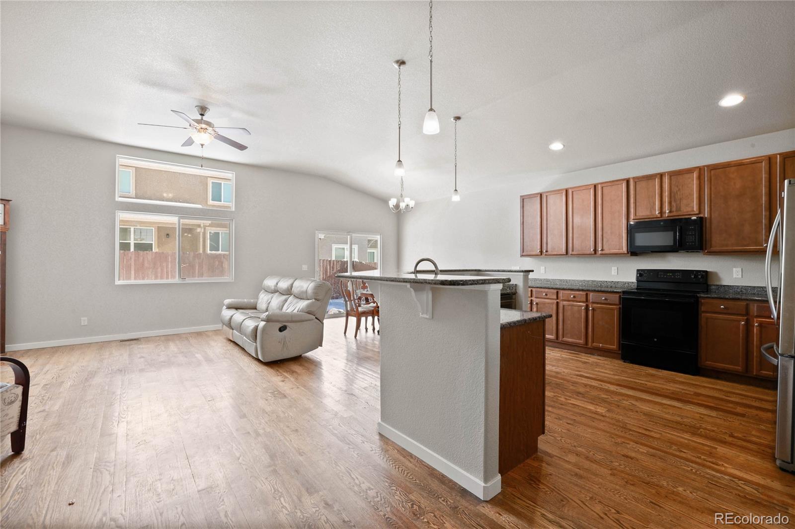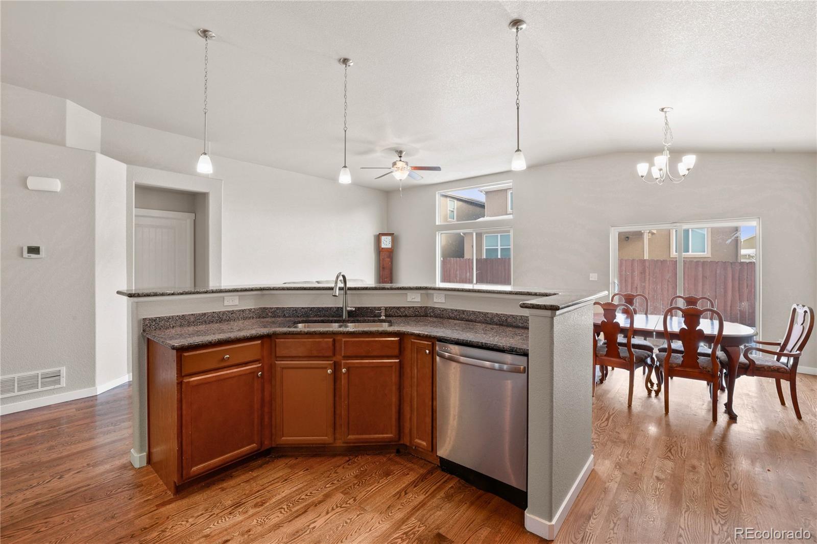 Welcome to main level living in Shiloh Mesa. Entering the main level offers hard wood floors throughout entry, living, dining and kitchen, three bedrooms, one full bathroom. Kitchen features granite counter tops, stainless steal appliances, with pantry. Master bedroom features five piece master bath, with decorative mosaic tiles in the standing shower, soaking tub and walk-in closet. Larger family area in the basement, with two spacious bedrooms, and full bathroom with dual vanity. All bedrooms, basement living area has new carpet. Whole house just painted in Fall of 2022. Enjoy the surrounding amenities of walking trails, restaurants, and easy accessibility to Peterson AFB, Powers blvd, and more. An opportunity for the new year.
