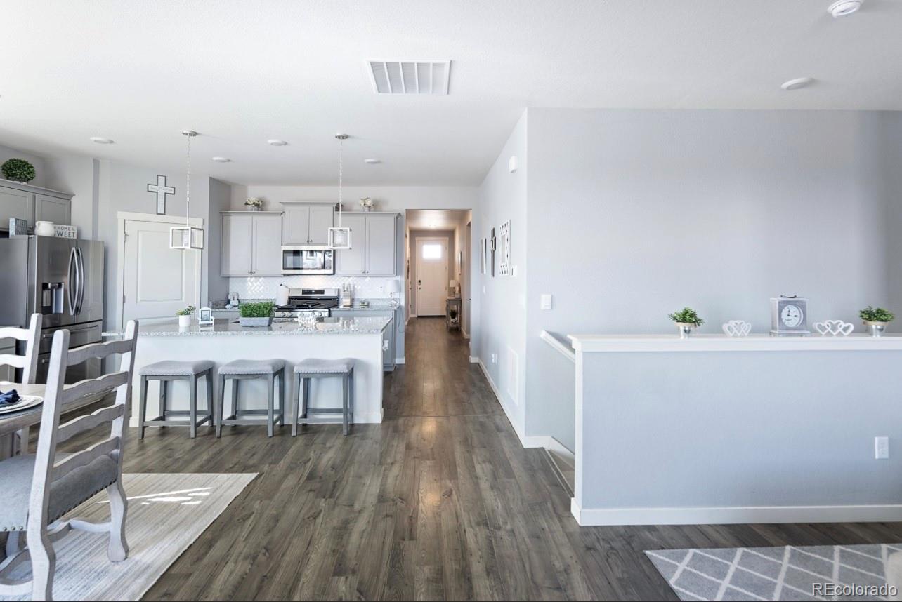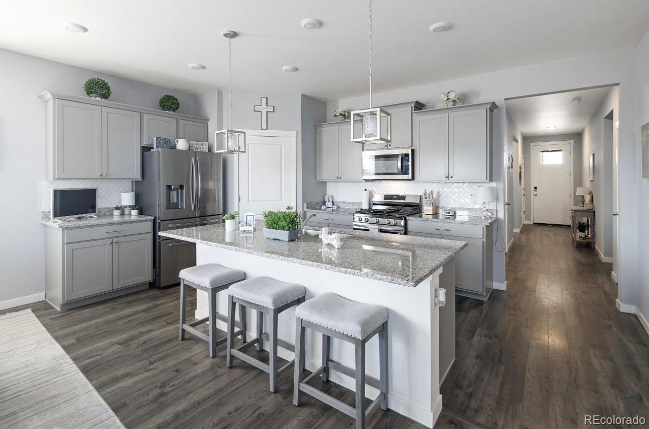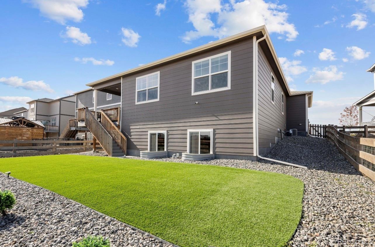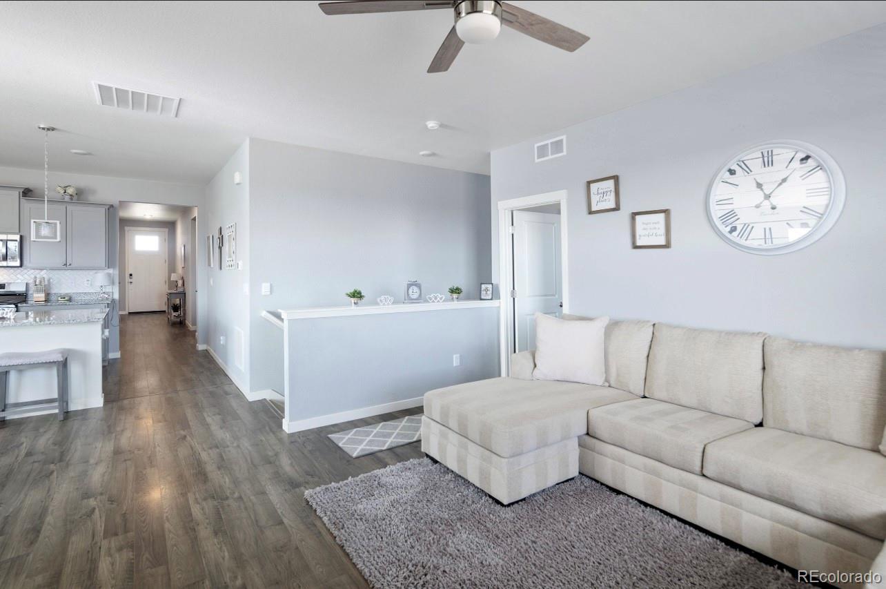 Check out this immaculately kept 2022 home that is fully finished out! A ranch plan home with a covered front porch and back deck for relaxing. West facing for great snow melt. Open concept plan with A/C, 9' ceilings and full finished garden level basement. Soothing decor features grey cabinetry with crown molding, granite countertops, walk in pantry, SS appliances, new paint 2025, upgraded carpet and padding (2025) and extensive laminate wood flooring through most of the main level. Includes Smart Home features such as Keyless entry, Smart Speaker, Video doorbell, Z-Wave thermostat, ADT Security system and more to keep you connected. Basement finished with 2nd laundry room, living area, office/flex room, huge bedroom, full bathroom and large storage space. 10 year New Home Warranty for peace of mind through builder. Backyard is turf and the front yard is grass. Both front and back have a sprinkler system. This is a well maintained and gorgeous home you don’t want to miss out on. Furnishings are negotiable to stay with the home and TVs mounted on walls stay with the home as well. Motivated seller!