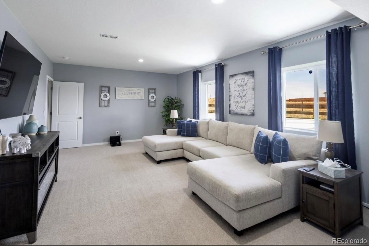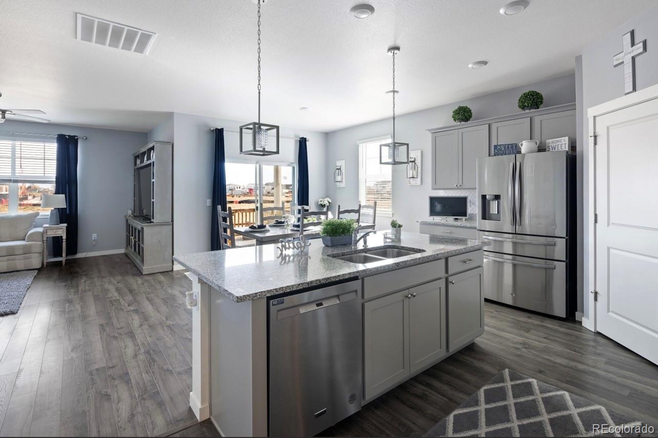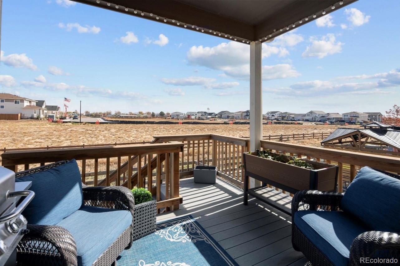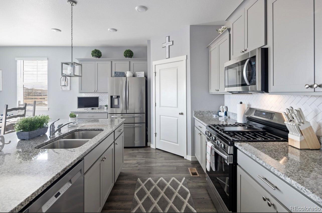 Check out this immaculately kept 2022 home that is fully finished out! A ranch plan home with a covered front porch and back deck for relaxing. West facing for great snow melt. Open concept plan with A/C, 9' ceilings and full finished garden level basement. Soothing decor features grey cabinetry with crown molding, granite countertops, walk in pantry, SS appliances, new paint 2025, upgraded carpet and padding (2025) and extensive laminate wood flooring through most of the main level. Includes Smart Home features such as Keyless entry, Smart Speaker, Video doorbell, Z-Wave thermostat, ADT Security system and more to keep you connected. Basement finished with 2nd laundry room, living area, office/flex room, huge bedroom, full bathroom and large storage space. 10 year New Home Warranty for peace of mind through builder. Backyard is turf and the front yard is grass. Both front and back have a sprinkler system. This is a well maintained and gorgeous home you don’t want to miss out on. Furnishings are negotiable to stay with the home and TVs mounted on walls stay with the home as well. Motivated seller!