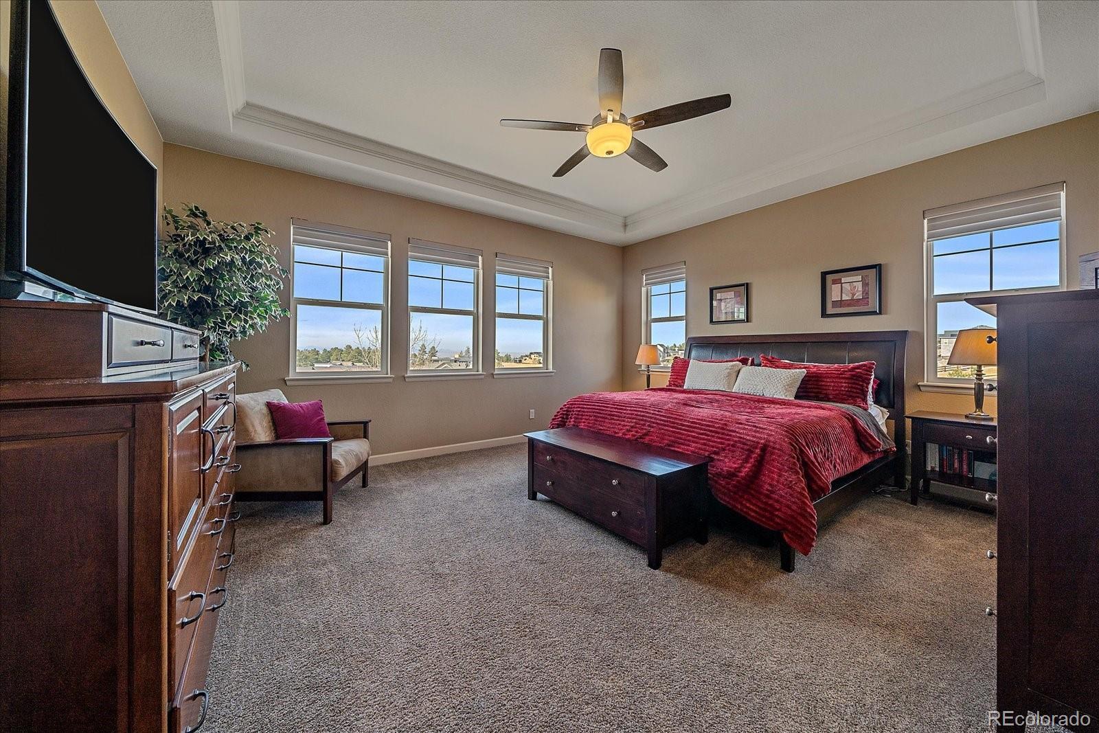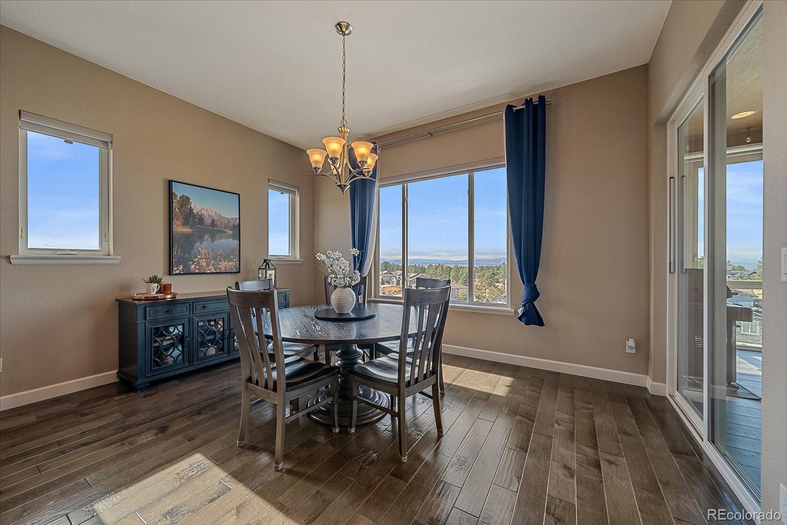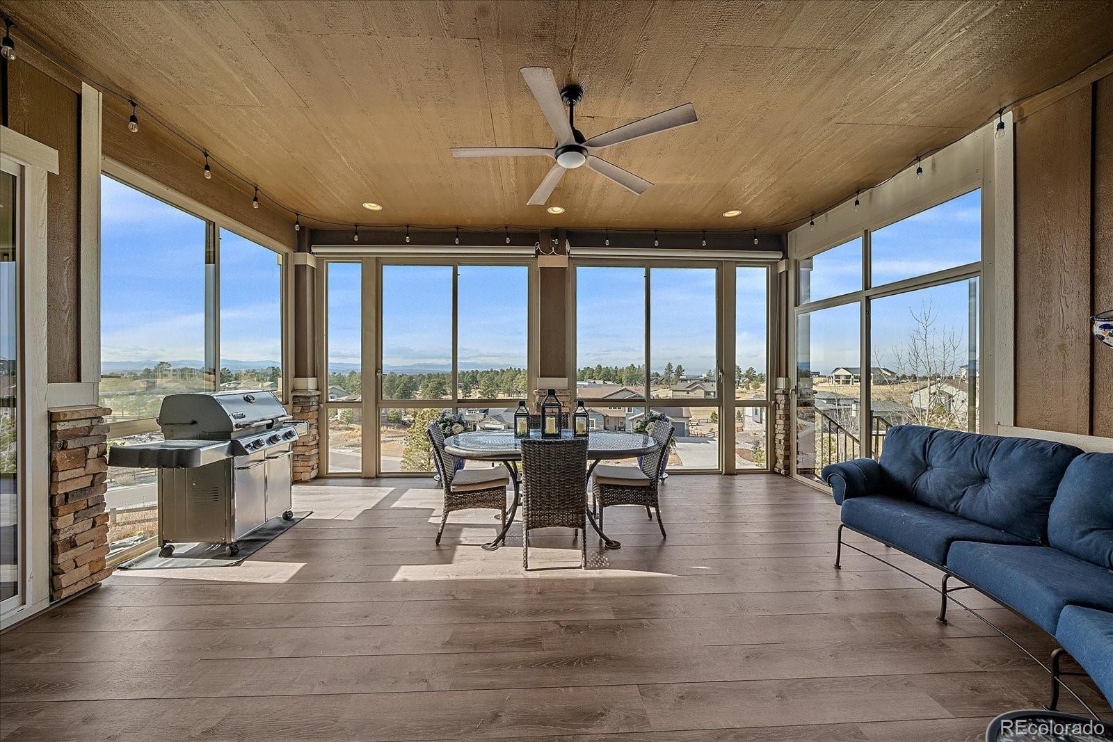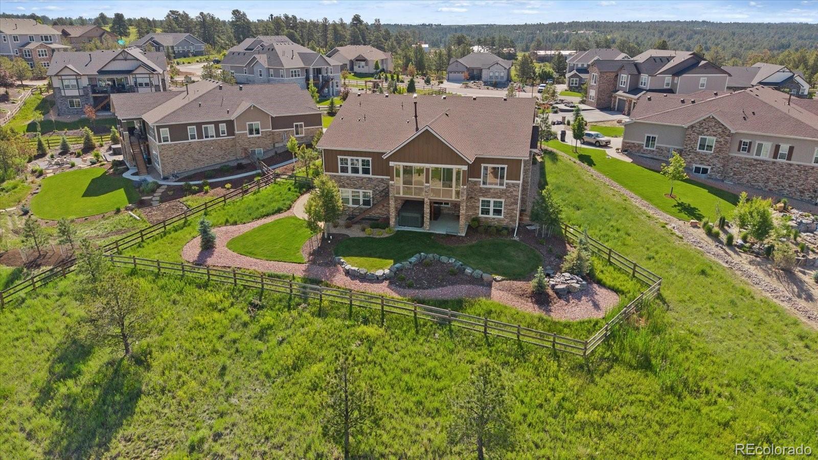 Views, views, views from almost every room, they are spectacular. Embrace the Colorado lifestyle in this ranch style estate home gracefully set on a cul de sac in the prestigious Timbers at the Pinery. This home showcases luxury finishes, soaring ceilings and is bathed in natural light. The great room has a wall of glass, custom shelving, fireplace, coffered ceiling and is open to the kitchen. The gourmet kitchen will impress you with it's oversized island/bar, granite counters, high end appliances including Thermador stove & dishwasher, ss hood, butler's pantry with wine frig & large walk in pantry. The adjoining spacious nook looks out to the breathtaking mountains. Step into the sunroom to enjoy seamless indoor/outdoor living. You will just want to relax and soak in the views year round including grilling 365 days a year. The dining room is perfect for entertaining. Escape to the primary suite which is a private sanctuary for relaxation. The 5 piece bath features jetted soaking tub, large shower, and massive walk in closet. The secondary bedrooms on main floor are both a great size and feature a jack & jill bath. Main floor study is highlighted with french doors and a custom wall of shelves. The finished walkout expands your living space and features 9' ceilings, and a large family room plumbed for a wet bar. Work out in the spacious gym which could also be another bedroom. There is a private bedroom and 3/4 bath downstairs too. In the unfinished area there is plenty of room for storage plus a workshop, wow. Other amenities include 10' ceilings main floor, engineered hardwood floor, remote control shades, and secondary sub panel. You will love the professionally landscaped yard with water feature, trees, boulders, split rail fence & swim spa. This home is close to trails, parks, golf courses, top rated schools, & shopping and dining options. A once in a lifetime opportunity to own a home with these unparalleled views that are impossible to replicate.