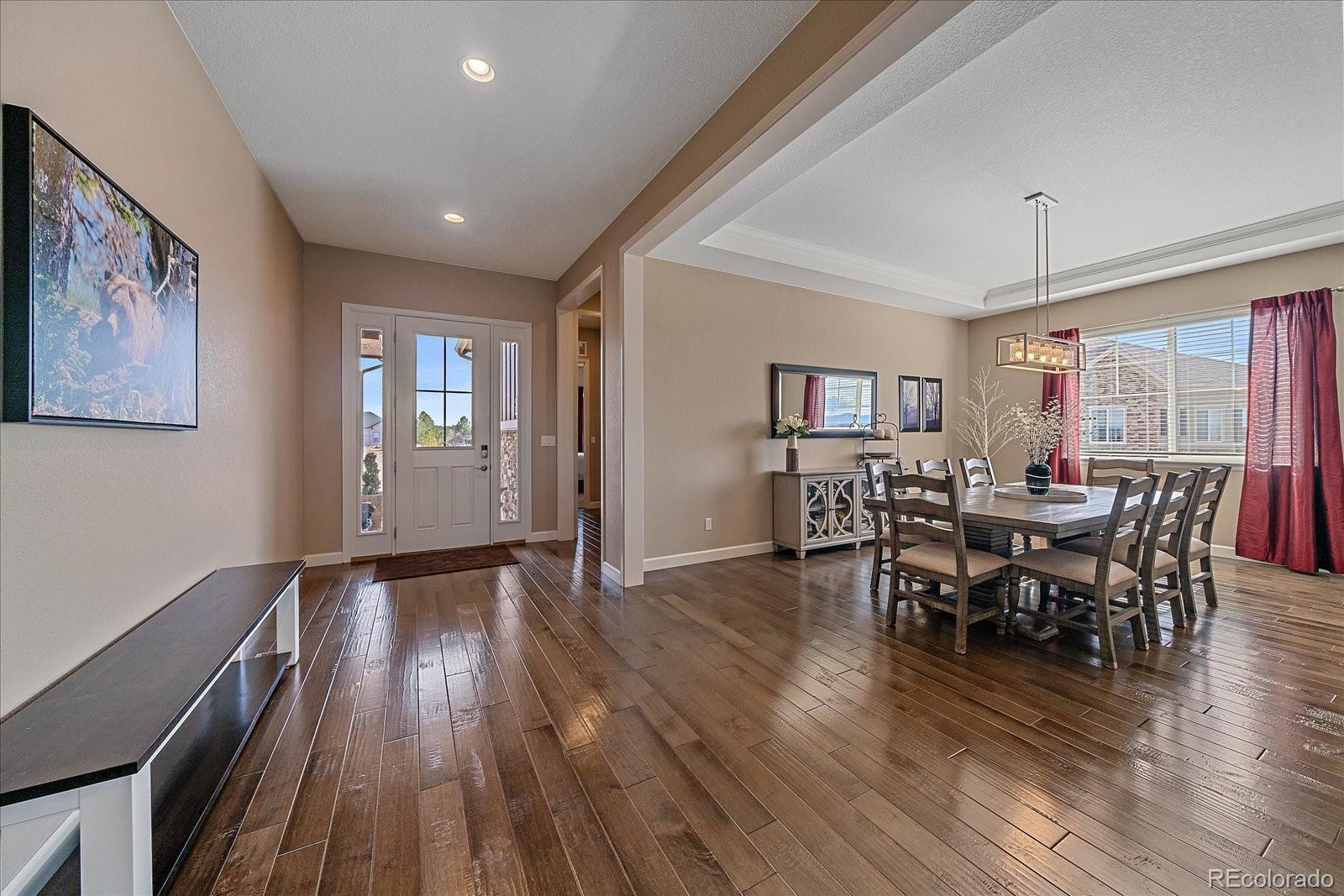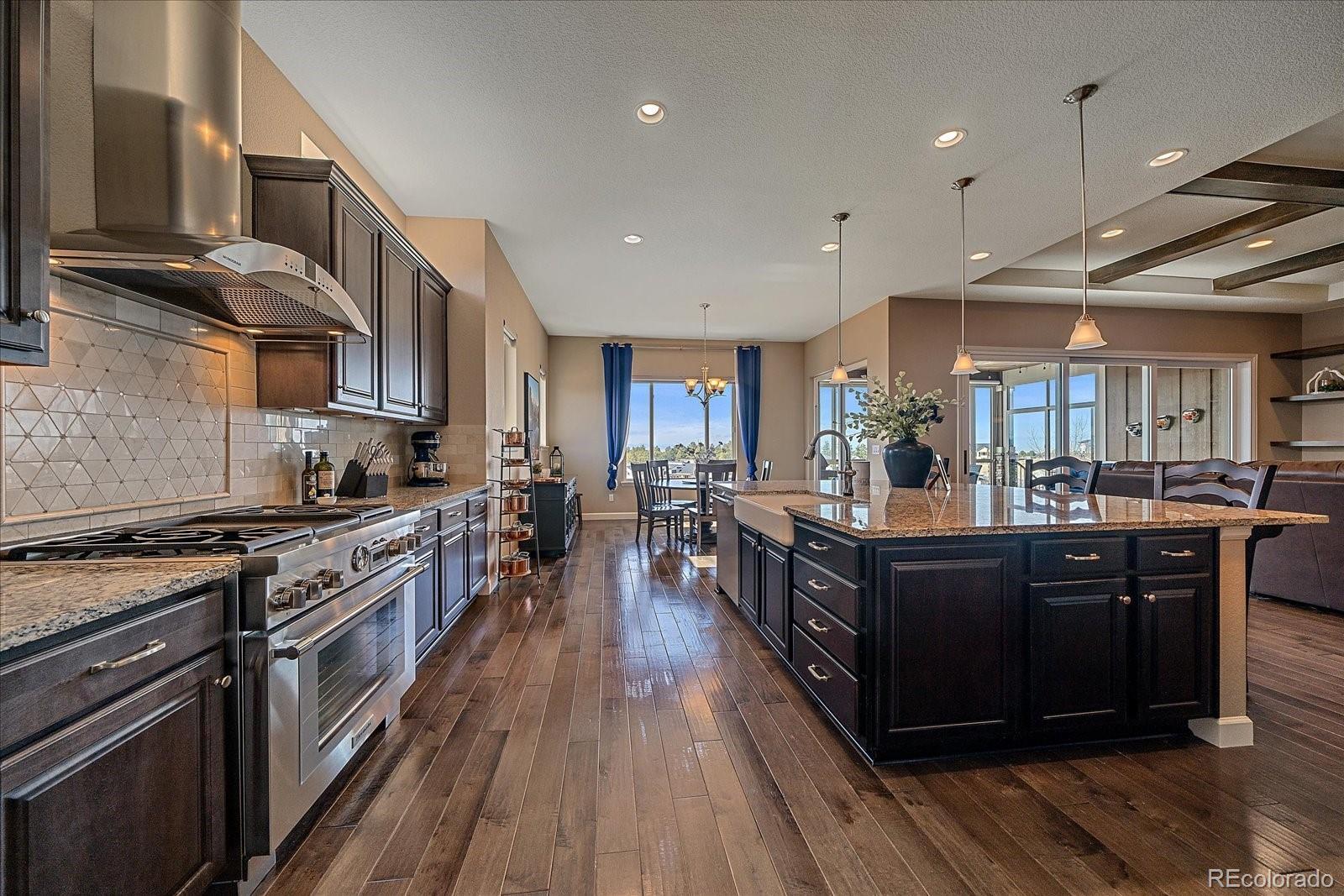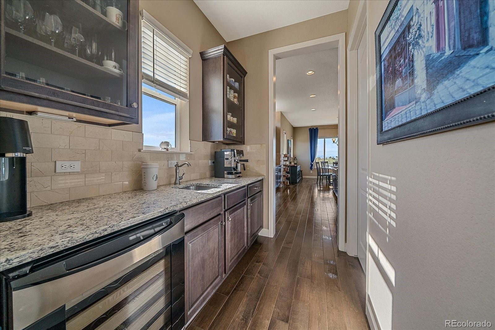 Views, views, views from almost every room, they are spectacular. Embrace the Colorado lifestyle in this ranch style estate home gracefully set on a cul de sac in the prestigious Timbers at the Pinery. This home showcases luxury finishes, soaring ceilings and is bathed in natural light. The great room has a wall of glass, custom shelving, fireplace, coffered ceiling and is open to the kitchen. The gourmet kitchen will impress you with it's oversized island/bar, granite counters, high end appliances including Thermador stove & dishwasher, ss hood, butler's pantry with wine frig & large walk in pantry. The adjoining spacious nook looks out to the breathtaking mountains. Step into the sunroom to enjoy seamless indoor/outdoor living. You will just want to relax and soak in the views year round including grilling 365 days a year. The dining room is perfect for entertaining. Escape to the primary suite which is a private sanctuary for relaxation. The 5 piece bath features jetted soaking tub, large shower, and massive walk in closet. The secondary bedrooms on main floor are both a great size and feature a jack & jill bath. Main floor study is highlighted with french doors and a custom wall of shelves. The finished walkout expands your living space and features 9' ceilings, and a large family room plumbed for a wet bar. Work out in the spacious gym which could also be another bedroom. There is a private bedroom and 3/4 bath downstairs too. In the unfinished area there is plenty of room for storage plus a workshop, wow. Other amenities include 10' ceilings main floor, engineered hardwood floor, remote control shades, and secondary sub panel. You will love the professionally landscaped yard with water feature, trees, boulders, split rail fence & swim spa. This home is close to trails, parks, golf courses, top rated schools, & shopping and dining options. A once in a lifetime opportunity to own a home with these unparalleled views that are impossible to replicate.