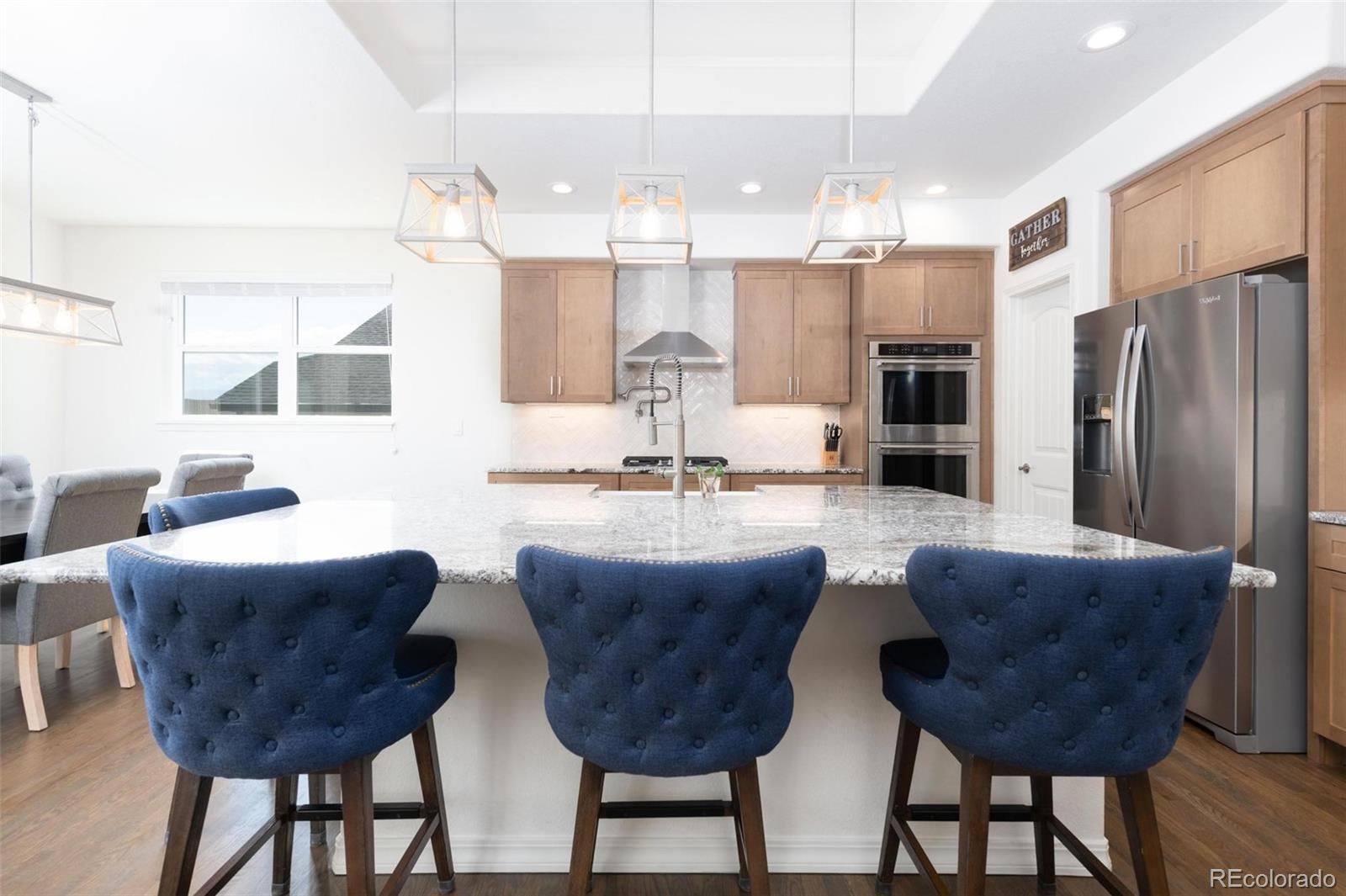 Welcome to 6448 Rolling Creek Drive, a home that blends modern design, thoughtful upgrades, Pikes Peak views, and the best of Colorado living. The kitchen is a true chef’s dream, featuring a pot filler, double oven, walk-in pantry, apron-front sink, upgraded herringbone backsplash, countless lighting upgrades, and an oversized island designed for both entertaining and everyday life.The open-concept layout connects seamlessly to the living room, anchored by a beautiful stone fireplace. Additional touches here include a double sliding glass door and a built-in speaker system that add comfort and style. Just off the living room, the primary en suite impresses with an exposed beam ceiling, an oversized walk-in shower with dual shower heads, and a walk-in closet that could rival the size of a bedroom. Also on the main level is an expanded secondary en suite, perfect for guests or multi-generational living. Head downstairs to a spacious finished basement with a custom wet bar, second stone fireplace, a third en suite, and a fourth bedroom. There’s also an unfinished room offering flexibility as a home gym, storage, or the option to finish it out into a fifth bedroom with its own walk-in closet. And while the home itself is incredible, the neighborhood is truly the icing on the cake. Wolf Ranch is an award-winning, master-planned community with over 300 acres of open space, more than seven miles of finished trails, and a lifestyle filled with parks, events, and natural beauty. Take a walk through the 3D tour or schedule a showing today. This home has everything you’ve been searching for!