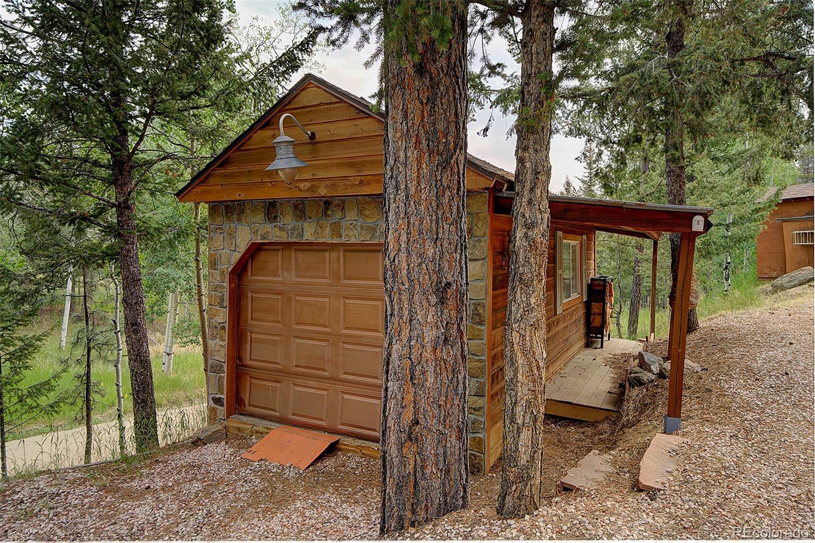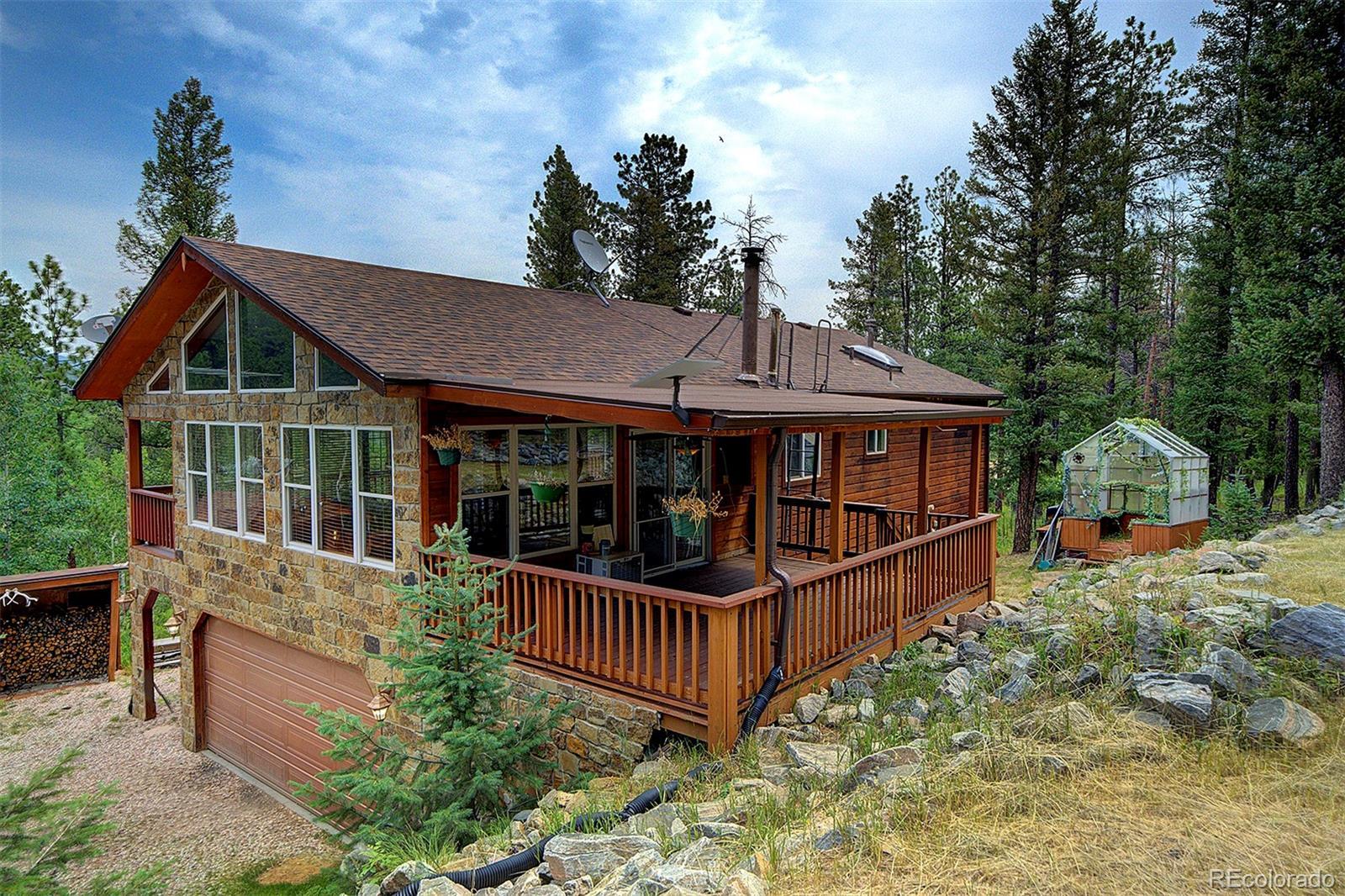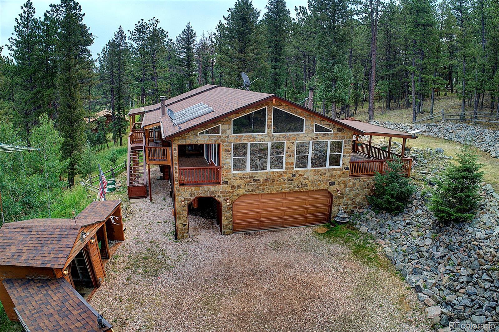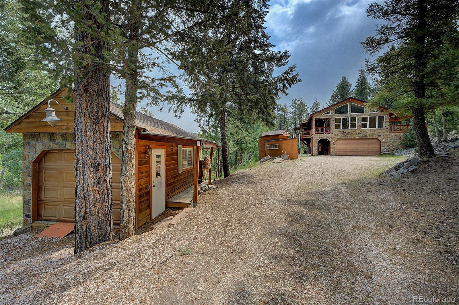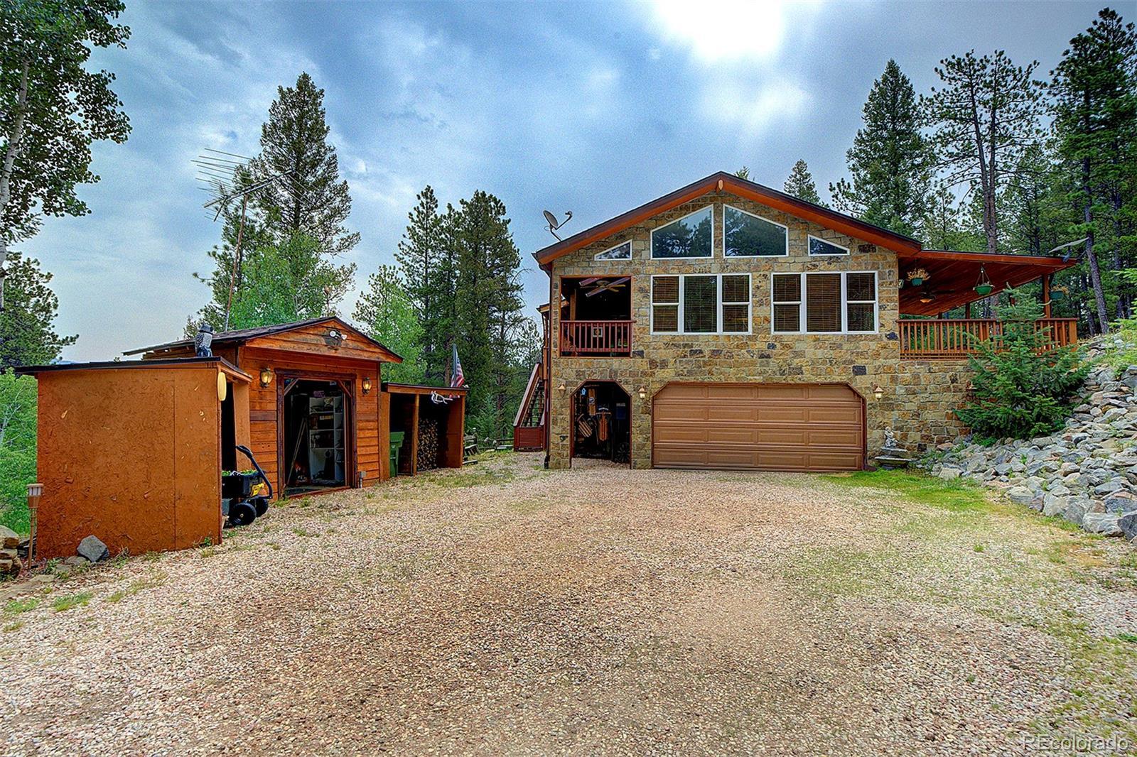 Welcome to your mountain retreat—where comfort meets charm and nature is just outside your door. Step through the custom leaded glass entry into an open, light-filled space with vaulted ceilings and beautiful oak floors. The remodeled kitchen (2023) is a showstopper, featuring leathered granite counters, a copper farmhouse sink, smart appliances, and a large island perfect for gathering. The Great Room invites cozy evenings by the wood-burning stove and easy access to covered decks—ideal for enjoying peaceful mornings or starlit nights. Two bedrooms and a full bath complete the upper level, offering comfort and flexibility. Outdoor living shines here, with a spacious covered back deck leading to a private yard, plus front decks offering mountain views and privacy among the trees. Downstairs, the main ground level offers even more space—a second family room with another wood stove, a third bedroom, ¾ bath, and a large laundry/utility room (where underneath the window is a favorite nap spot for a local buck!). Practical updates include a 3-year-old roof, newer pressure tank, two furnaces, and multiple wood and storage sheds. The attached garage features a dog door to a small secure run, and additional road access to the property allows for extra off-street parking—roomy enough for a trailer or 35’ RV. Septic system is rated for 2 bedrooms. This thoughtfully updated home blends rustic beauty with modern comfort—come see for yourself what mountain living can feel like. NOTE: this home has been named eligible for homeowners insurance through Jennifer Gann State Farm, agent will provide details.