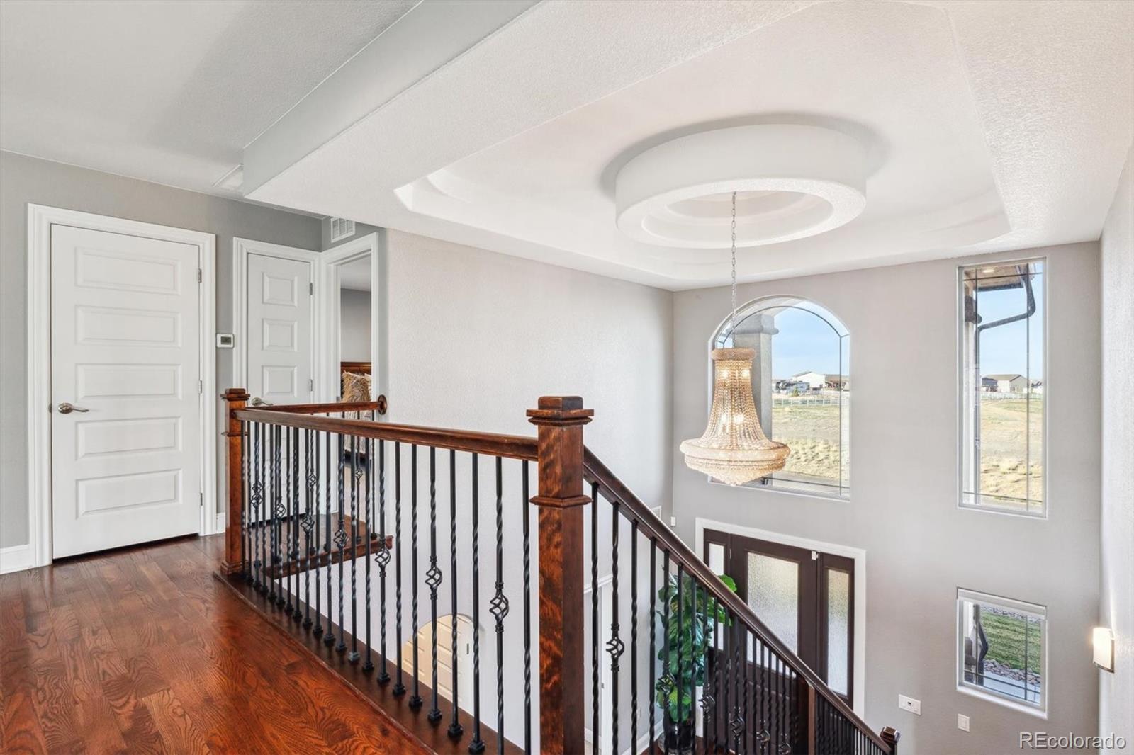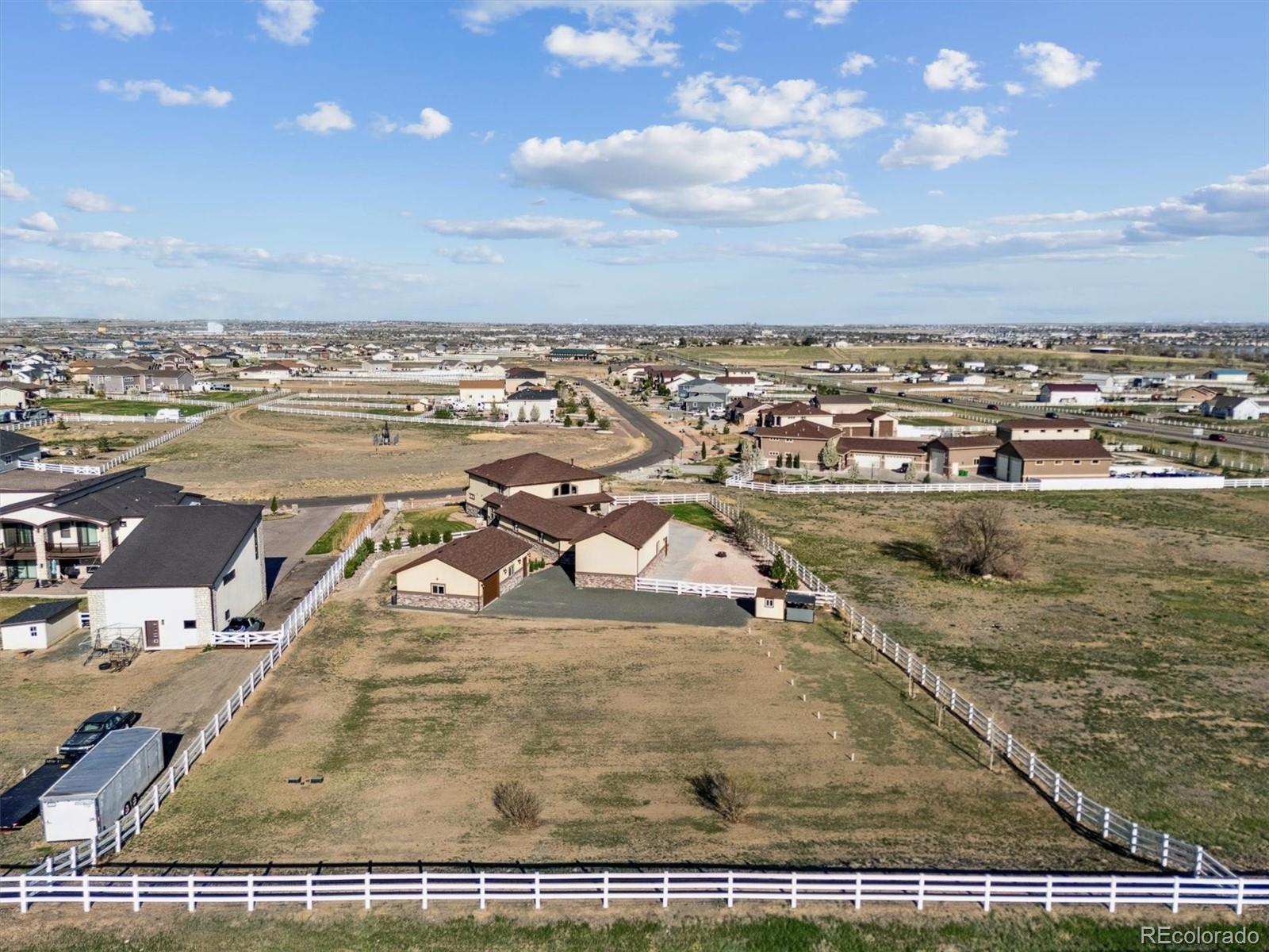 Set on a secluded 1.25-acre premium lot with a world-class dream garage in the coveted Todd Creek Riverside community, this exceptional custom estate delivers refined luxury and peaceful country living—framed by sweeping mountain and prairie views in every direction. Designed for those who value privacy without sacrificing convenience, 16101 Iola Street offers over 5,000 sqft of elevated Colorado living. Featuring 7 bedrooms, including two expansive primary suites, 5 bathrooms, and curated finishes thourght including rich hardwood flooring, soaring two-story ceilings, and a dramatic stacked-stone fireplace that anchors the great room with warmth and sophistication. At the heart of the home, the gourmet eat-in kitchen blends timeless design with everyday functionality, showcasing white cabinetry, granite countertops, stainless steel appliances, a generous breakfast bar, and stone tile floors. The finished lower level extends the living experience with a spacious den perfect for a home theater, fitness studio, or recreation retreat, complete with a custom-built-in wet bar and counter seating for relaxed gatherings. The main attraction of this meticulously maintained residence is the 2,387 sqft attached 4-car finished garage, including a 20x48 RV garage. The additional 1,040 sqft detached garage with epoxy flooring is an absolute dream for car enthusiasts, hobbyists, or anyone who needs extra storage in the heart of Todd Creek. Expansive landscaping and a full property fence have been installed, including professional stonework and plantings to complement the lush yard and endless mountain views. 16101 Iola Street is ideally situated within minutes of Stouffer Reservoir, Todd Creek Golf Club, and endless dining, shopping, and entertainment in downtown Brighton. This is a rare opportunity to own a true luxury retreat—where space, privacy, and impeccable design come together to offer the ultimate Colorado country lifestyle with serious garage appeal.
