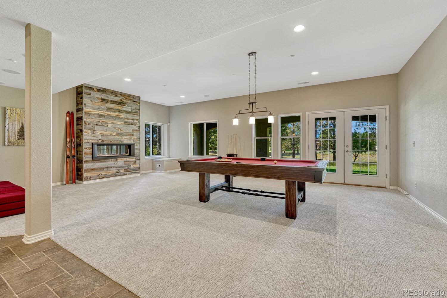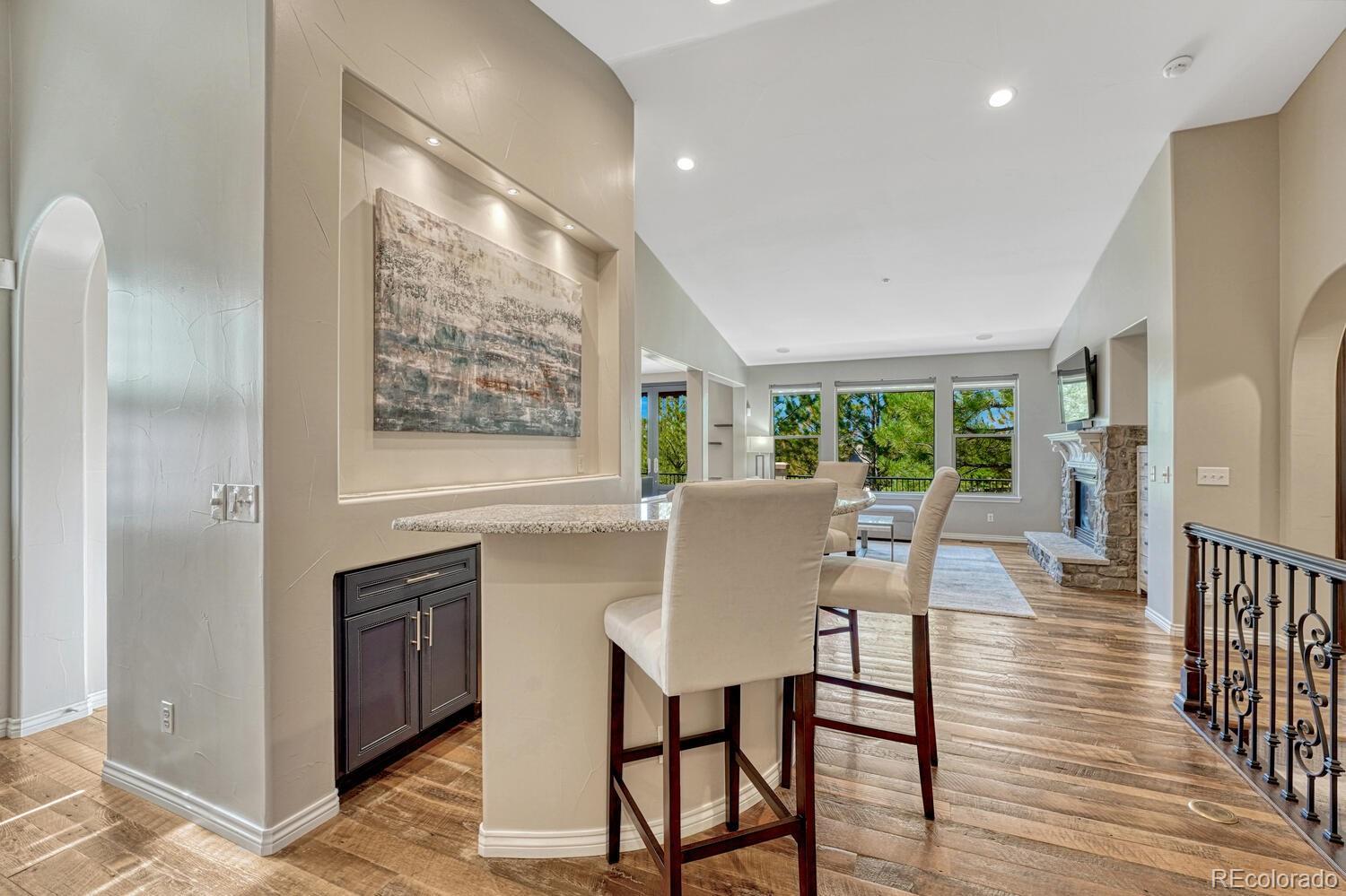 Welcome home to this stunning 3-bedroom, 3-bath ranch-style retreat featuring a walkout lower level and captivating sunset and mountain views. Enter through the private courtyard—perfect for outdoor entertaining—before stepping into the rotunda entry, where the home’s craftsmanship immediately shines. The interior showcases rustic barn wood hardwood floors, an open-concept layout, and refined details throughout. The dining area flows seamlessly into the sunlit great room and the spectacular kitchen, highlighted by new granite countertops, a large sit-around island, and abundant cabinetry for the home chef. Adjacent to the kitchen, you’ll find a striking entertainment bar complete with a wine chiller and a butler’s pantry ideal for a coffee station. The primary suite is a true sanctuary, featuring architectural charm, serene views, private deck access, and a spa-inspired bathroom with dual vanities, a deep soaking tub, a spacious dual head walk-in shower, and two walk-in closets. A private den offers the perfect home office setup, while an additional bedroom suite and nearby full bath provide comfort for guests on the main floor. The walkout lower level expands your living space with a cozy reclaimed-wood fireplace, a family room (pool table negotiable), media and game areas, and a versatile non-conforming bedroom or flex room that can serve as a home gym. Guests will appreciate the lower-level bedroom offering privacy and views. An abundance of outdoor living space, this home perfectly blends indoor comfort with outdoor enjoyment—all within an easy-care setting that offers all the amenities of the Village at Castle Pines. Large deck with southwestern views and electric awning. Close to I-25 access. Walk to: Great local restaurants and local deli/meat specialty store, parks, trails, pools, tennis courts, pickleball courts, basketball courts, fitness center and so much more.