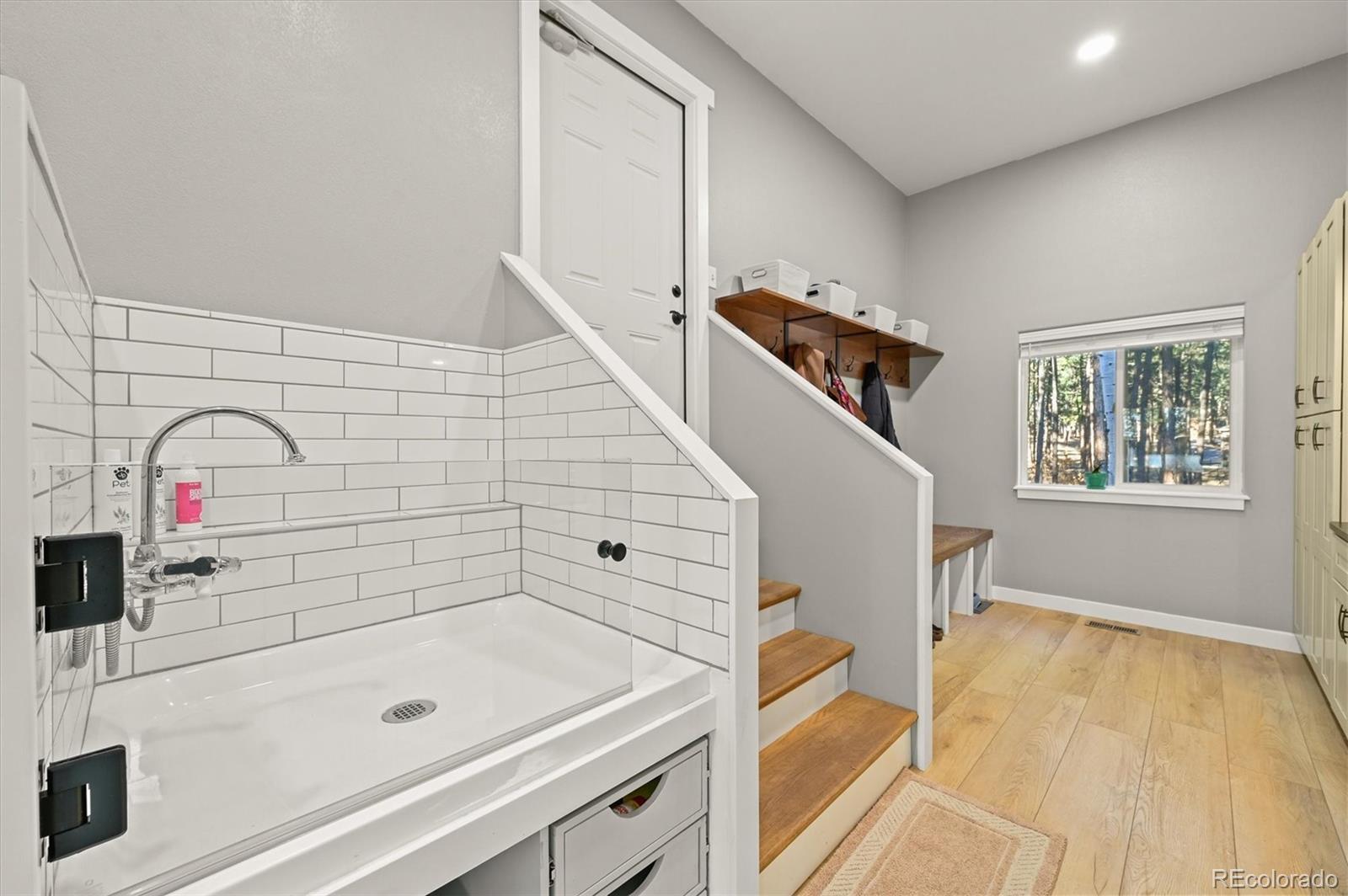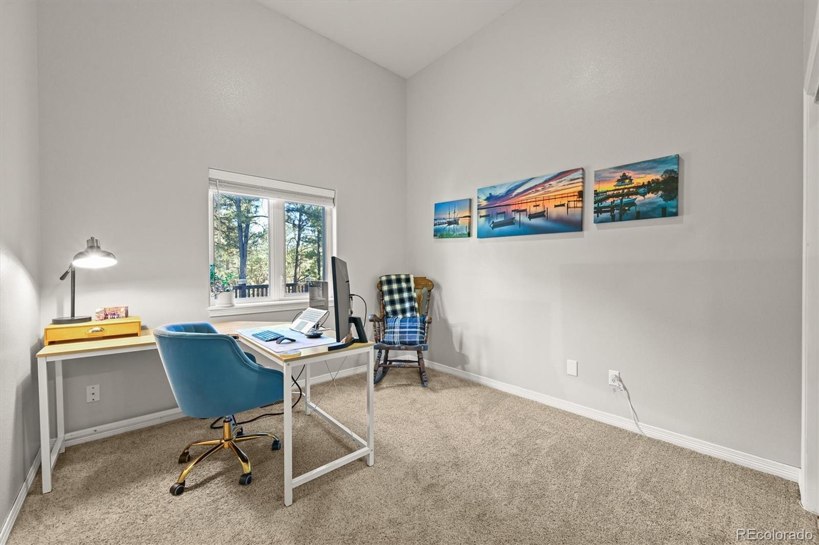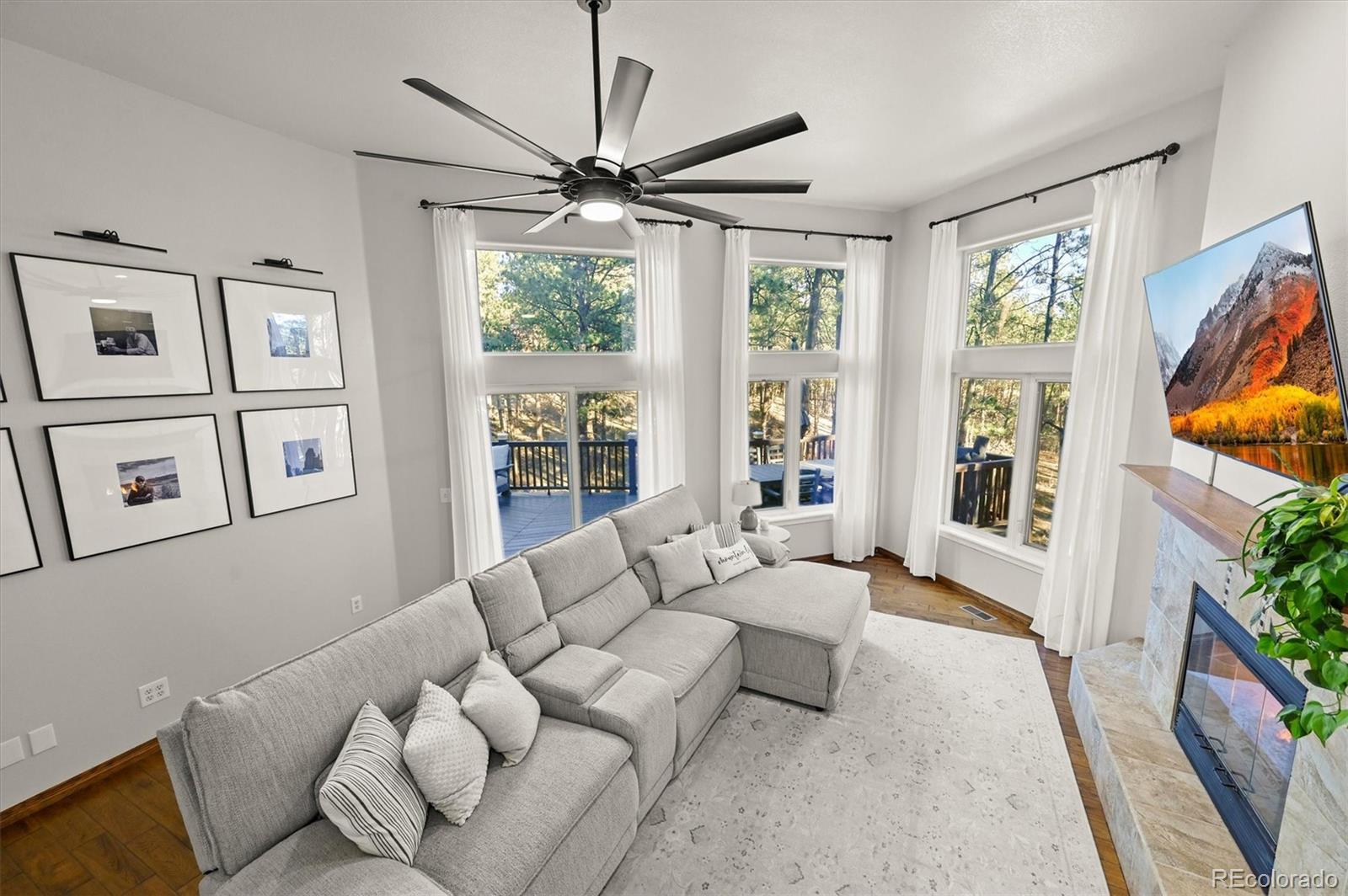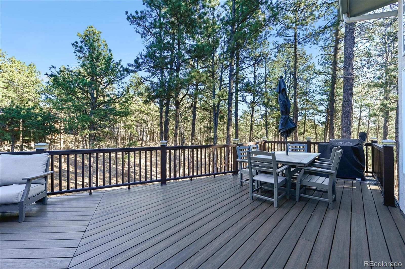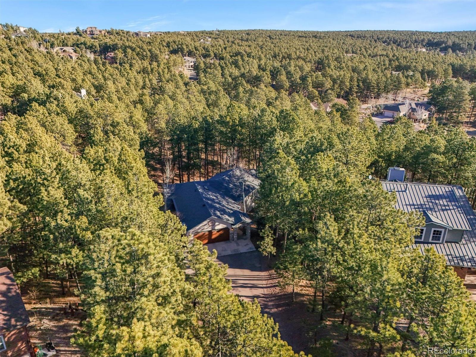 Tucked among towering ponderosa pines on a peaceful ¾-acre lot, this multi-level 5-bedroom, 4-bath home blends refined comfort with everyday functionality in the highly sought-after Woodmoor community. The open layout welcomes you with hand-scraped engineered hardwood floors, soft natural light, and effortless connection between living spaces. The kitchen flows to the dining area and sunken great room, where a gas fireplace invites gathering and quiet moments alike. Just beyond, a private composite deck offers a serene place to sip coffee, entertain, or simply breathe in the fresh Colorado air surrounded by trees and wildlife. Primary bedroom offers warm natural light and access to the primary bathroom & walk-in closet with custom organization system. Thoughtful features enhance daily living, including a versatile flex/mudroom space off the garage complete with dog wash for your furry friends, wet bar/coffee station with beverage fridge, and drop zone for those busy yet organized households. The finished walkout basement extends the home’s livability with radiant heated floors, a wood-burning fireplace, and direct access to the outdoors shaded by mature pines—perfect for play, gardening, or peaceful retreat. With bedrooms thoughtfully positioned across multiple levels, the layout is ideal for multi-generational living, long-term guests, or simply room to spread out. Every bathroom has been beautifully updated, and comfort comes easy with a new furnace and AC installed in 2021. Wildlife sightings are a daily delight here, adding to the sense of mountain living without giving up convenience or accessibility. Woodmoor is a beloved golf course community within the acclaimed D-38 school district, moments from the Air Force Academy and northern Colorado Springs amenities. Castle Rock is just 25 minutes away and DTC is a smooth 45-minute drive. Experience the warmth, sophistication, and lifestyle that make this property the place you will want to call home.