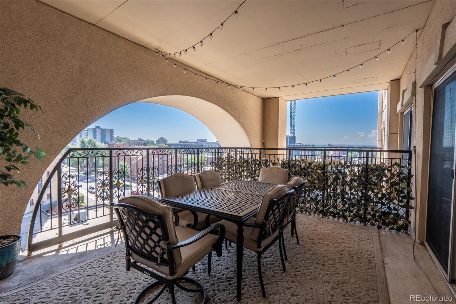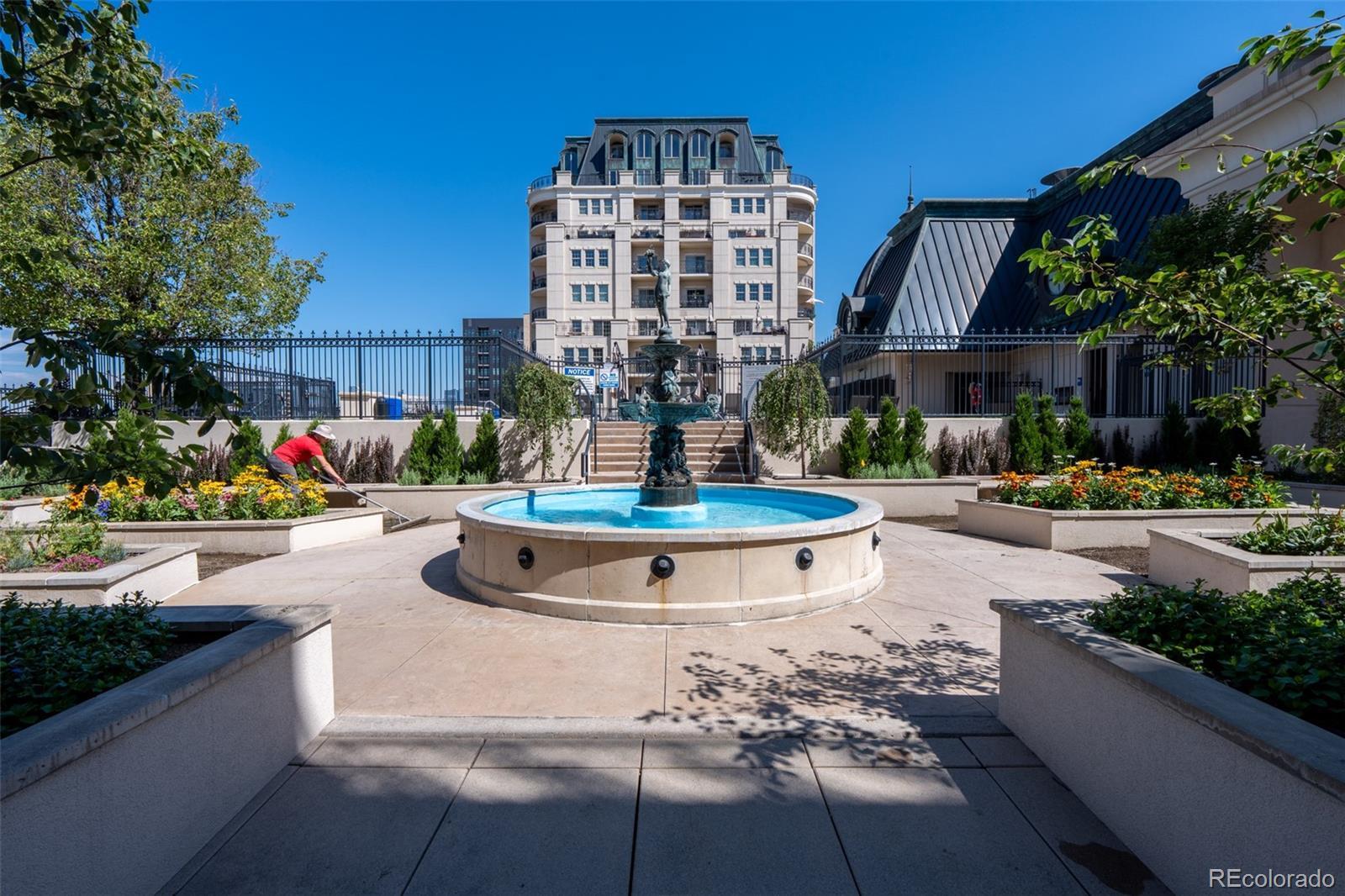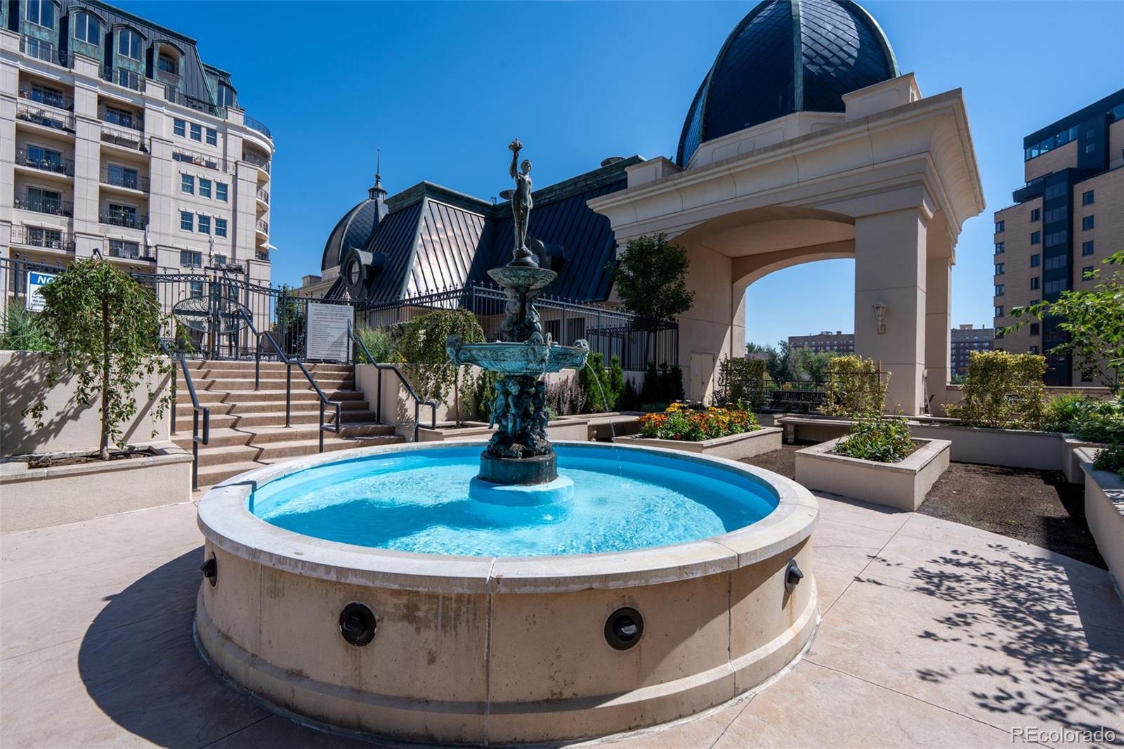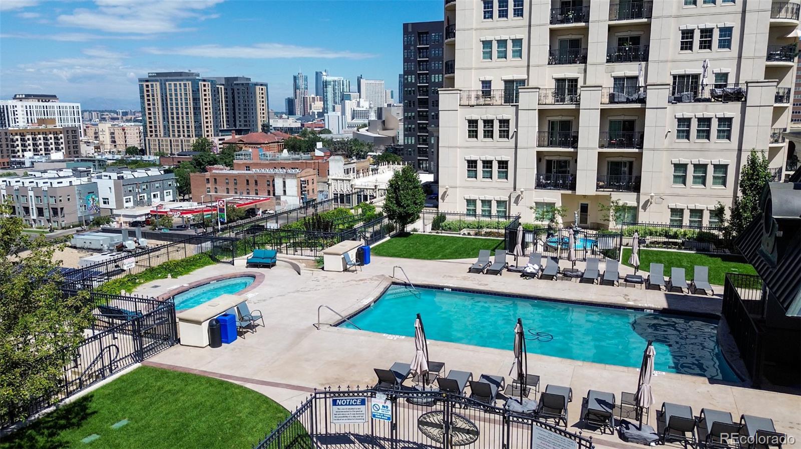 Stylish city living with mountain views! This 942 sq ft condo in the heart of Denver offers a smart, open layout perfect for rental or personal use. Enjoy a freshly updated kitchen with stainless appliances, tile backsplash, breakfast bar, and new sink faucet. Recent upgrades include LVP flooring, fresh paint, modern lighting, and hardware throughout. The oversized bedroom has two closets, and both the bedroom and living room open to a massive covered balcony with sweeping city views—ideal for entertaining or relaxing. Bathroom features granite counters, tile, and a jetted tub. Convenient perks include in-unit laundry, large private storage closet right outside your door, and a parking spot near the elevator. Building amenities rival a resort—secure access with concierge, pool, hot tub, gym, landscaped rooftop with grills and fire pit, plus a yoga studio across the street. Steps from art, parks, restaurants, and everything downtown. Come see it today!