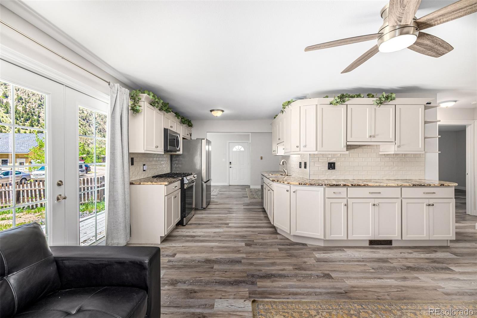 Nestled in the scenic foothills of the Rocky Mountains, this inviting single-family home offers small-town charm with big-mountain access. Just a short stroll from the quaint downtown shops, serene Georgetown Lake, and stunning trailheads, this property delivers that coveted Colorado lifestyle without the price tag of nearby Summit County. Set on a spacious double lot totaling nearly half an acre, the home blends comfort, style, and practicality. Step inside to a beautifully updated interior, featuring new main-level flooring and a renovated kitchen equipped with stainless steel appliances, granite countertops, and abundant storage. The open-concept dining area, warmed by a cozy fireplace, is perfect for après-ski dinners or relaxed weekend gatherings. The main floor offers two generous bedrooms, including a potential primary suite for those who prefer single-level living. Upstairs, a private bedroom with an en-suite bath captures sweeping mountain views—an ideal retreat for guests or your own private sanctuary. Outdoor living is just as impressive, with a sunny front deck, a fenced yard for pets or play, and a large backyard enclosed for privacy. The oversized, heated two-car garage is a rare find in Georgetown and comes with additional off-street parking—plenty of space for your mountain toys, RV, or adventure gear. Whether you're seeking a full-time residence, a mountain escape, or a strategic base to skip the I-70 ski traffic, this home is a unique chance to own in one of Colorado’s most charming historic towns—just minutes from world-class skiing, hiking, and biking.