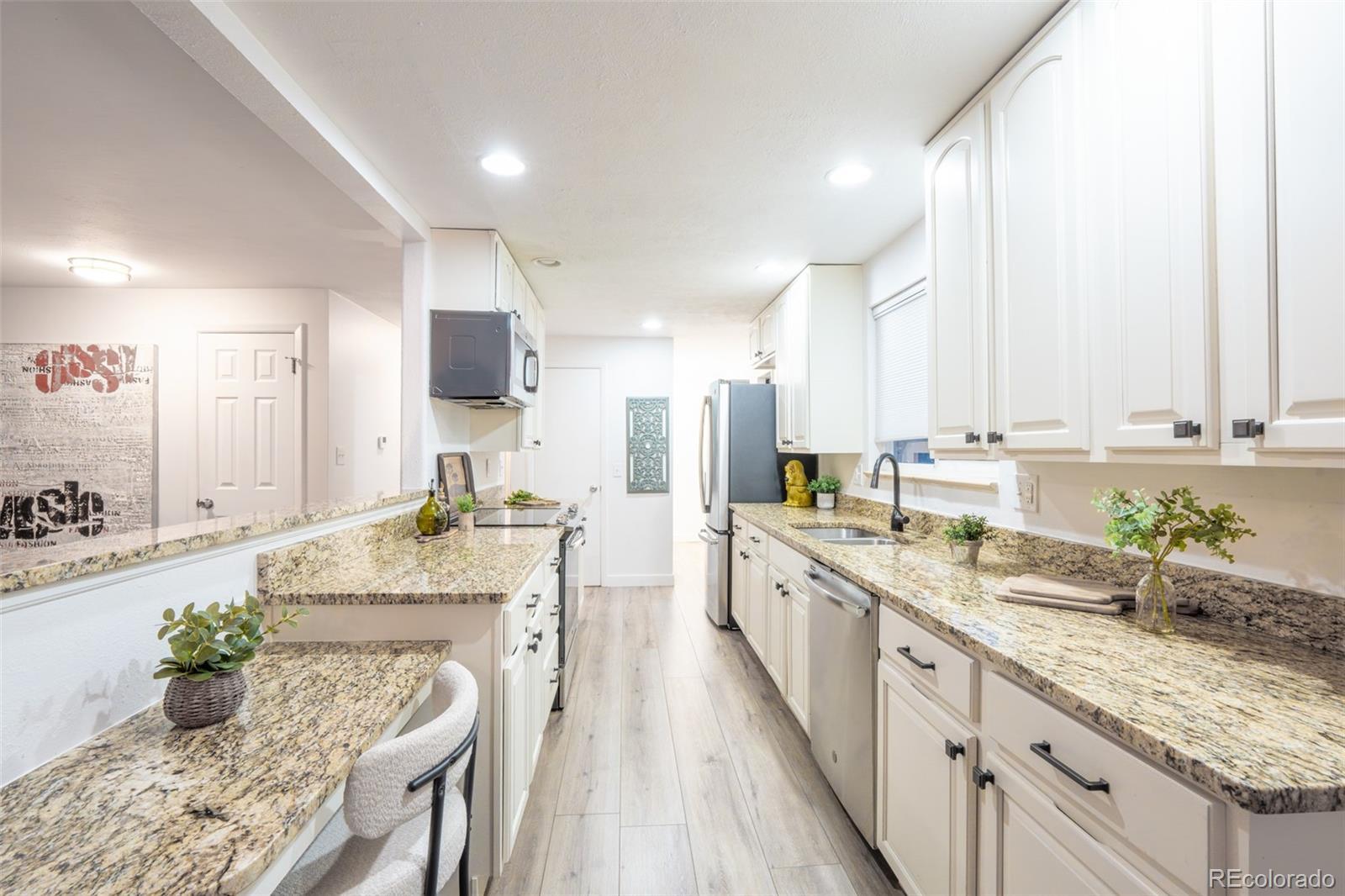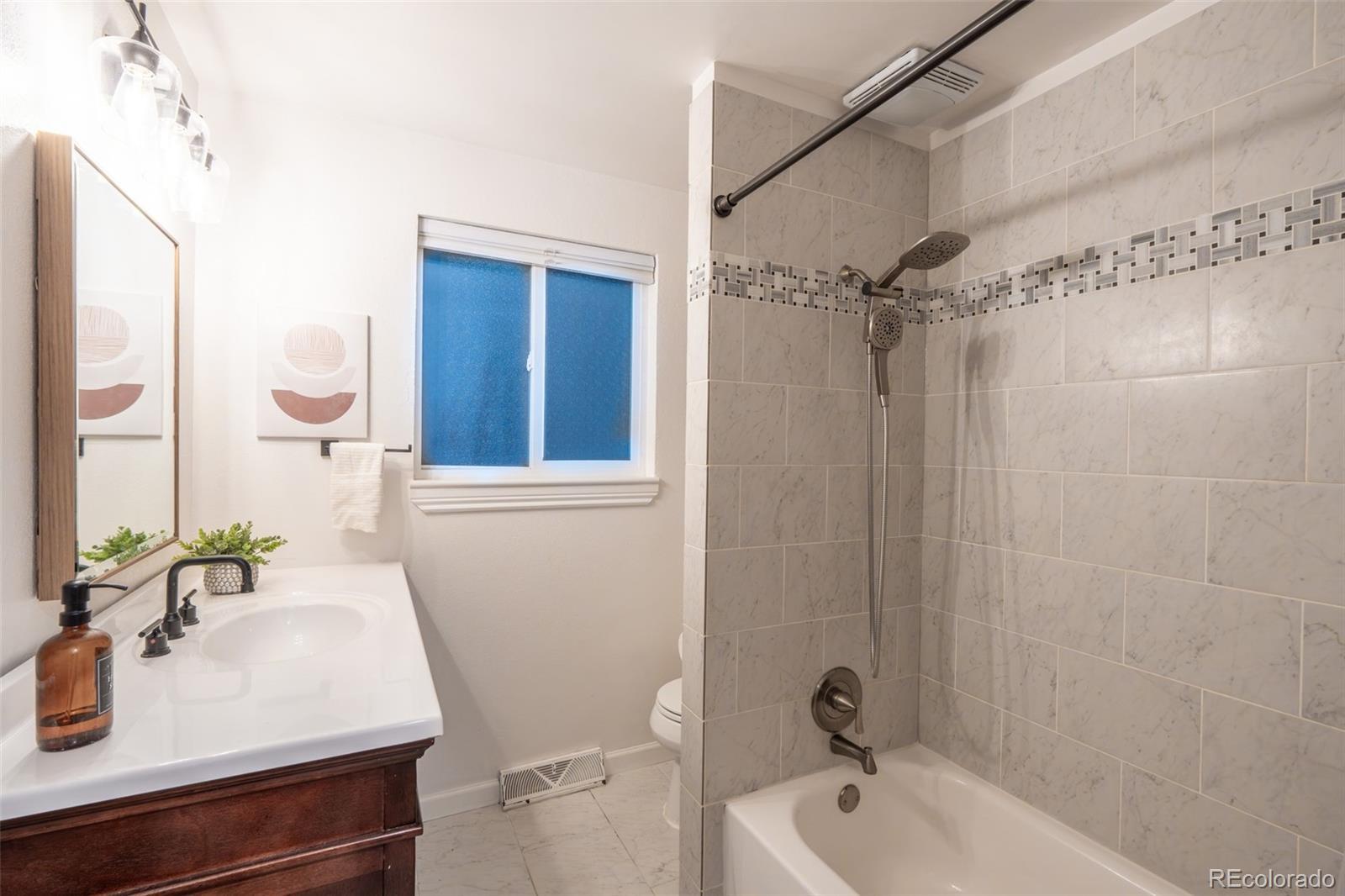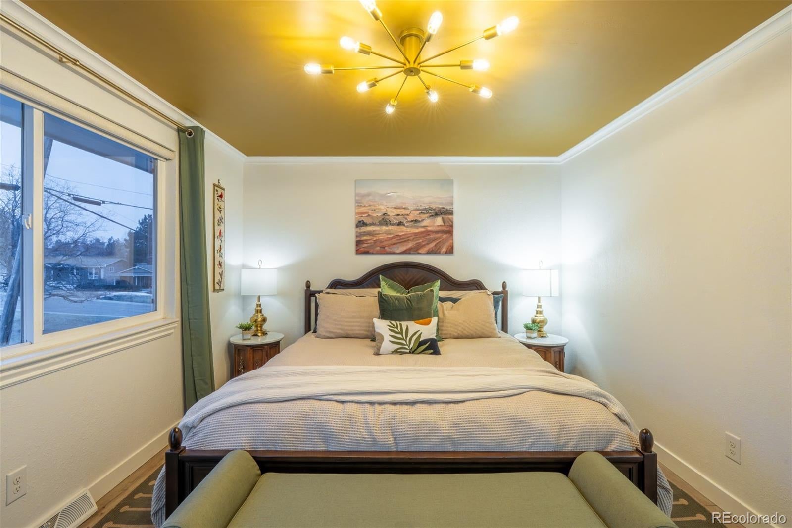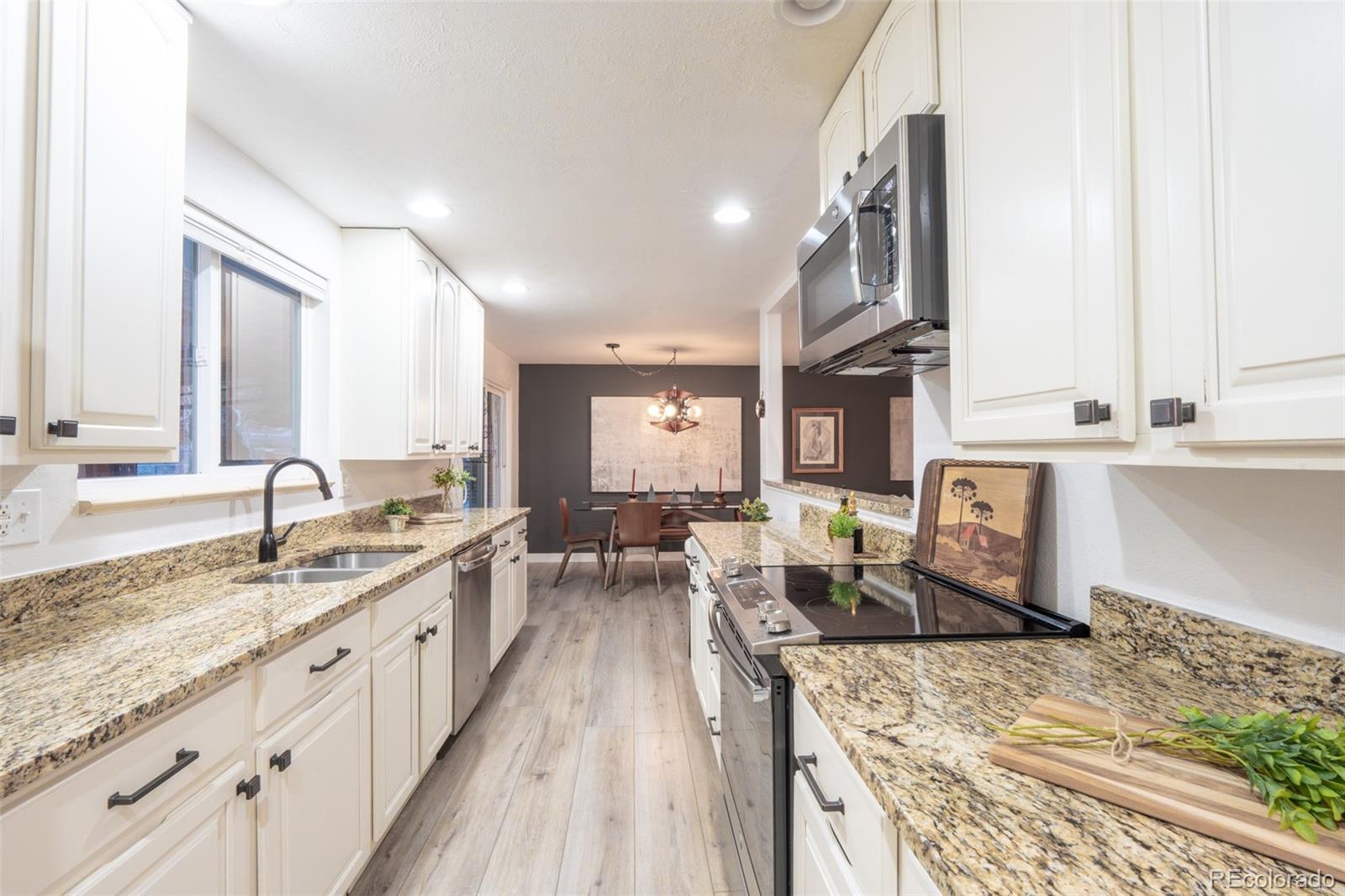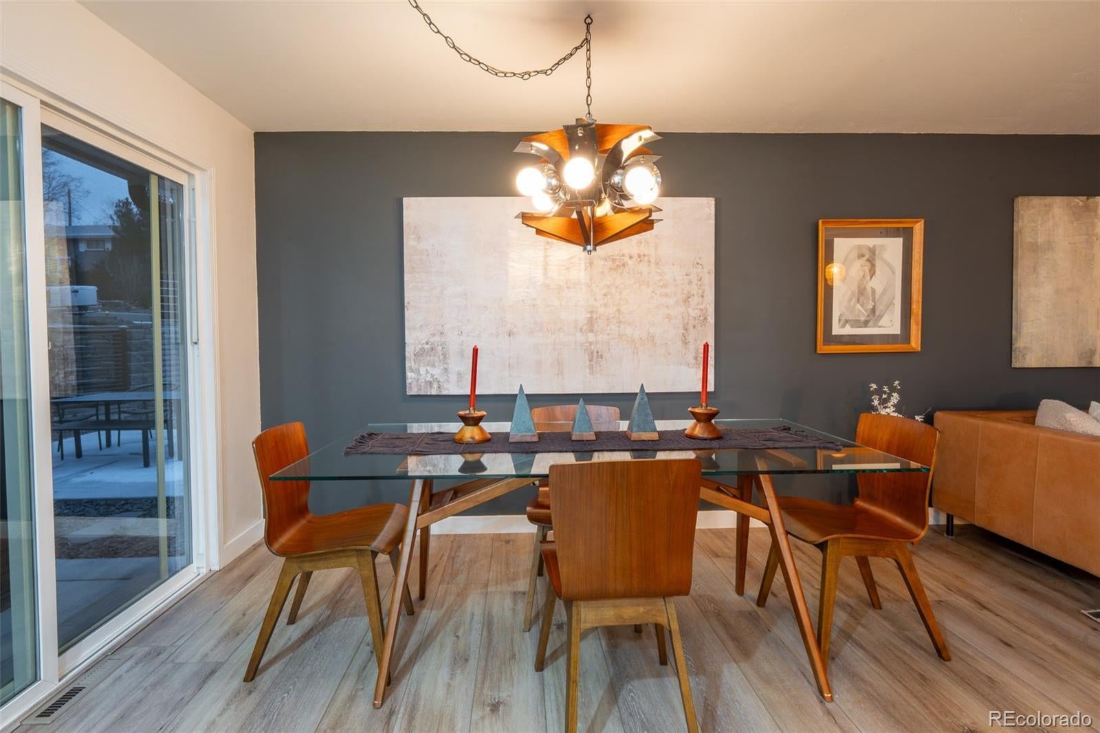 This ranch-style home in the coveted Scenic Heights neighborhood is turnkey and an outdoor entertainer's dream - a remodeled 2,139 sq ft gem with 4 bedrooms and 2 baths on a generous corner lot. Tucked minutes behind Majestic View Park and Nature Center, which boasts trails, lakes, green spaces, and great views of the Front Range, this neighborhood is one of Arvada’s best-kept secrets. The quiet tree-lined streets, surrounded by other unique & beautiful homes, create a peaceful neighborhood with a distinct character. The fully fenced backyard is meticulously landscaped with terraced gardens and seating areas. It boasts a four-season patio with a fire pit, all of which was renovated in 2024. A separate fenced yard is ideal for pets or a kids’ play area. Step inside to find wide-plank wood-look LVP flooring that flows through the main level, complemented by tasteful designer paint. The lovely kitchen showcases custom cabinetry, granite countertops, and stainless-steel appliances, all adjacent to a dining area that seamlessly opens to the patio on one side and a bright, cozy living room on the other—ideal for hosting and everyday comfort. The main floor features three bedrooms, including a primary suite equipped with a walk-in closet and private bathroom. Downstairs in the fully finished basement, discover a larger family room, the fourth bedroom, rough-in for a 3rd bath, and versatile storage zones or flex space—perfect for home office, gym, or hobby room. Exit the basement to the home’s 2-car garage. This home also boasts a new furnace, central AC, and new exterior paint, all completed in 2024. With an 8-minute drive to Olde Town Arvada’s vibrant dining and entertainment, 10 minutes to Apex Recreation Center, and easy access to I-70 and downtown, you will feel like you’re a world away from the city while being right in the heart of it. Nestled in this idyllic neighborhood, this updated, modern ranch isn’t just a home, it’s an escape.