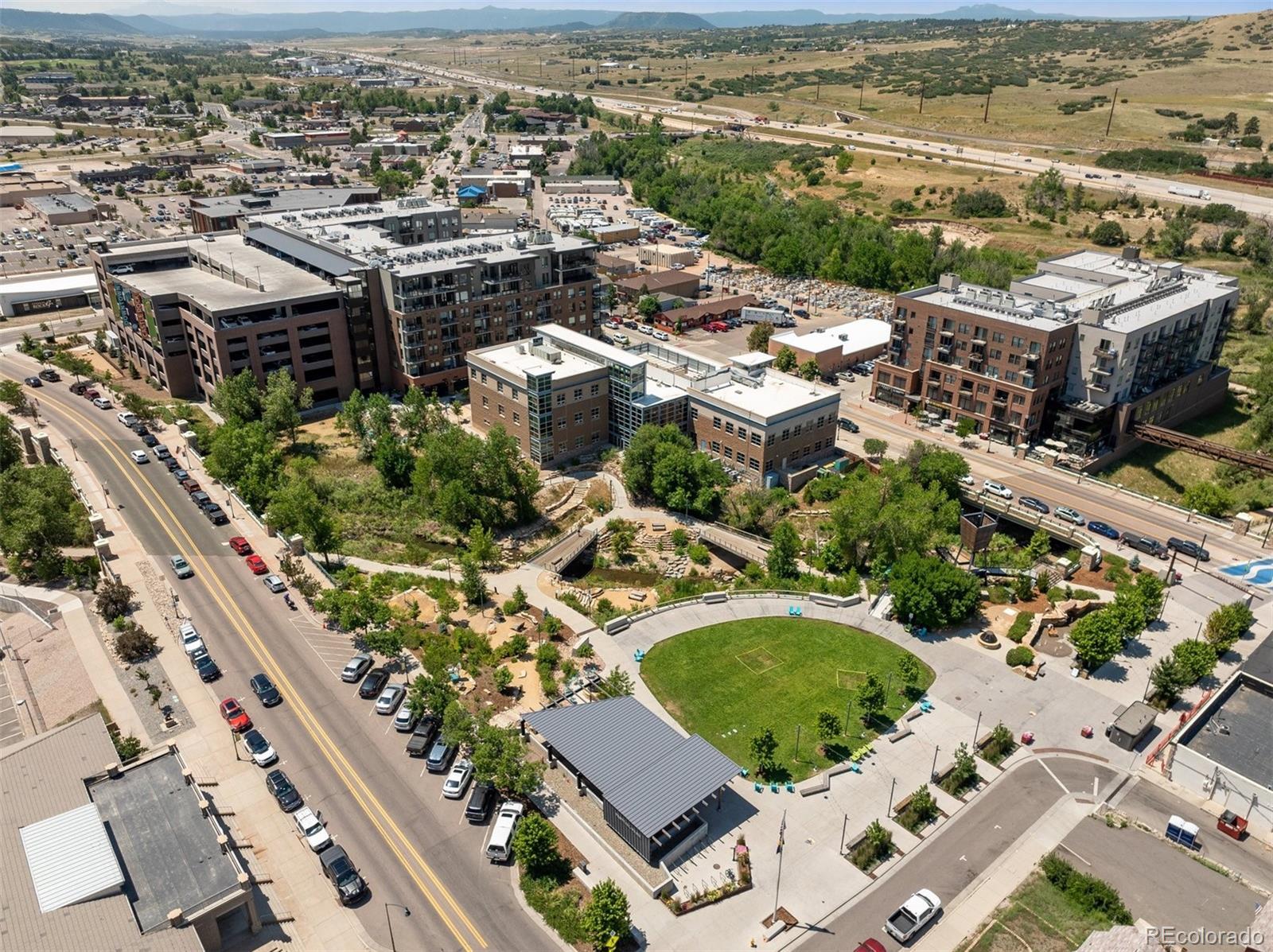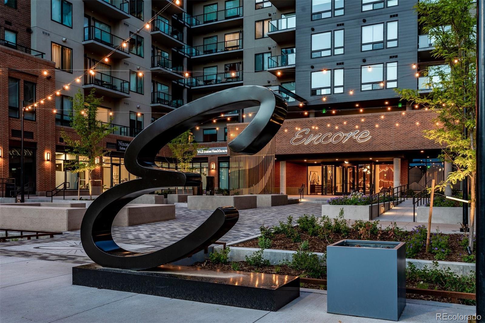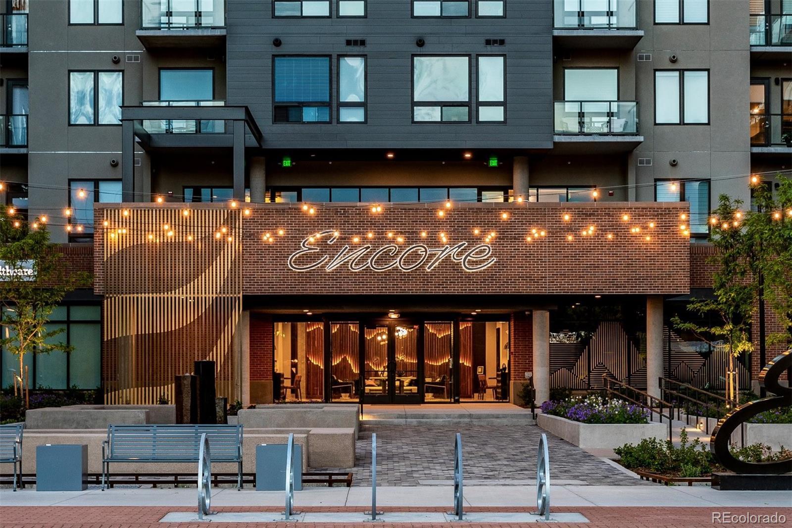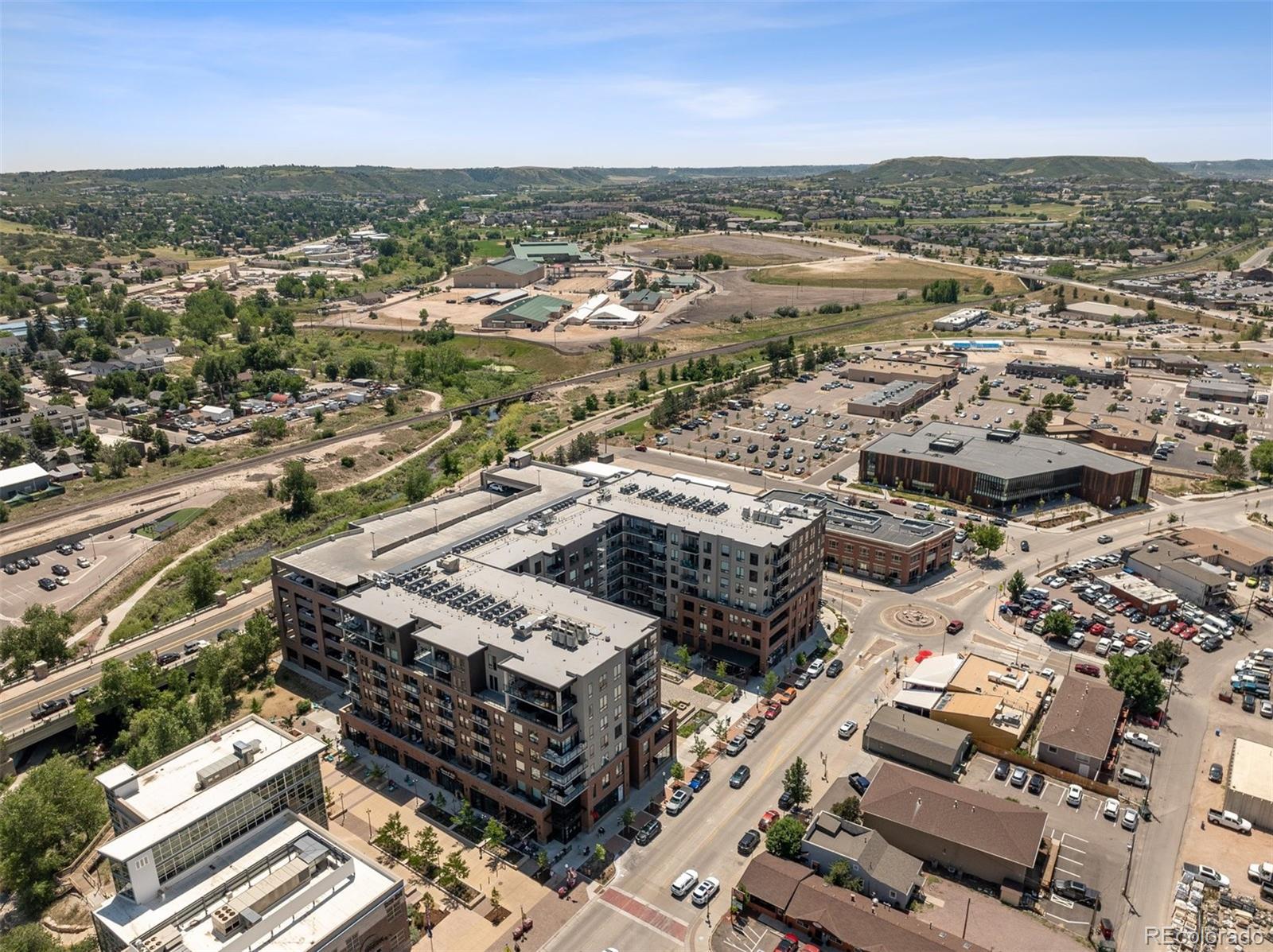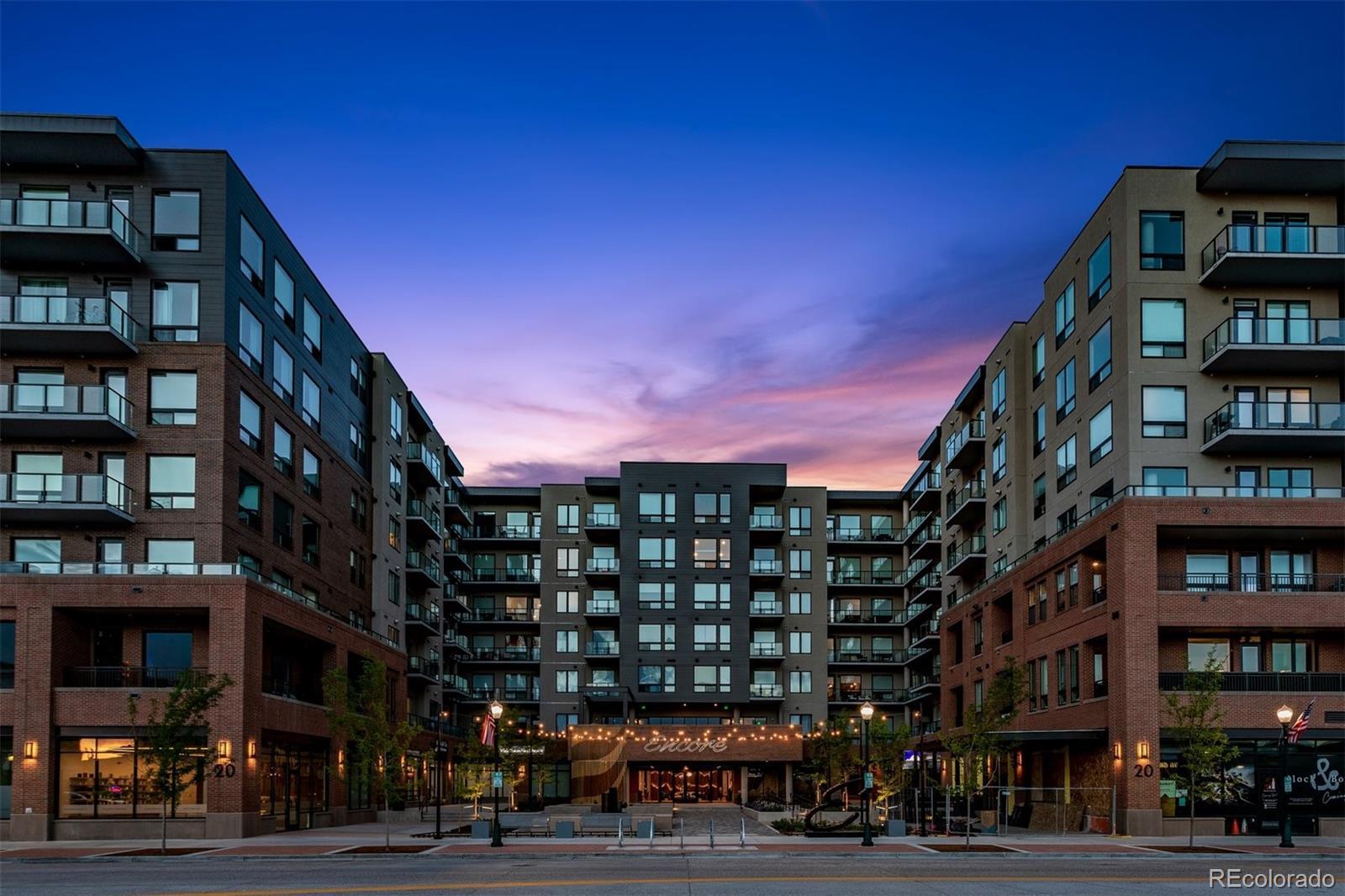 Wake up to the soft morning light, step onto your private balcony, & take in the energy of Castle Rock. Overlooking the courtyard & spa, this trendy condo puts you in the heart of it all—people-watching, downtown events, & even fireworks on special nights. Inside, luxury vinyl flooring flows throughout, & natural light fills the space. The open kitchen is both stylish & functional, with quartz countertops, a large island with seating, pendant lighting, soft-close drawers, stainless steel appliances, & a walk-in pantry. The dining area has plenty of room for a large table, perfect for hosting friends or enjoying a quiet meal. The great room feels open & inviting, with door leading to your balcony—your own little retreat to unwind, sip a drink, & catch glimpses of the mountains peeking through. The laundry room is thoughtfully designed with built-in cabinetry, counter space, & washer & dryer included. The primary suite is bright & welcoming when you want it to be, but blackout shades let you sleep in just a little longer. The ensuite bath has a spa-like feel with a large walk-in shower, stylish finishes, & a spacious walk-in closet. The second bedroom is generously sized, also with a walk-in closet—perfect for guests, a home office, or whatever suits your lifestyle. Encore’s AWESOME AMENITIES take this condo to the next level. Stay active in the FITNESS CENTER with treadmills, weights, ellipticals, & more. Work on your swing in the GOLF SIMULATOR or hang out in the CLUBROOM with a full kitchen, TVs, pool table, & a HUGE SPA HOTUB. There’s even a PET-WASHING STATION & DOG PARK for your furry friend. KEY FOB entry, elevators, & plenty of public parking make life easy, plus you’ll have 2 DEEDED PARKING SPACES near the entry. Step outside & you’re within walking distance of great restaurants, bars, coffee shops & boutiques, plus easy access to hiking & biking trails. Need to get somewhere fast? I-25 is just minutes away. This isn’t just a condo—it’s a lifestyle.