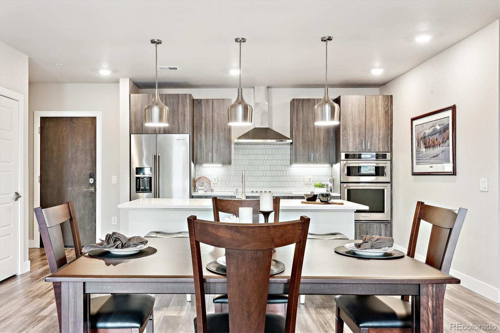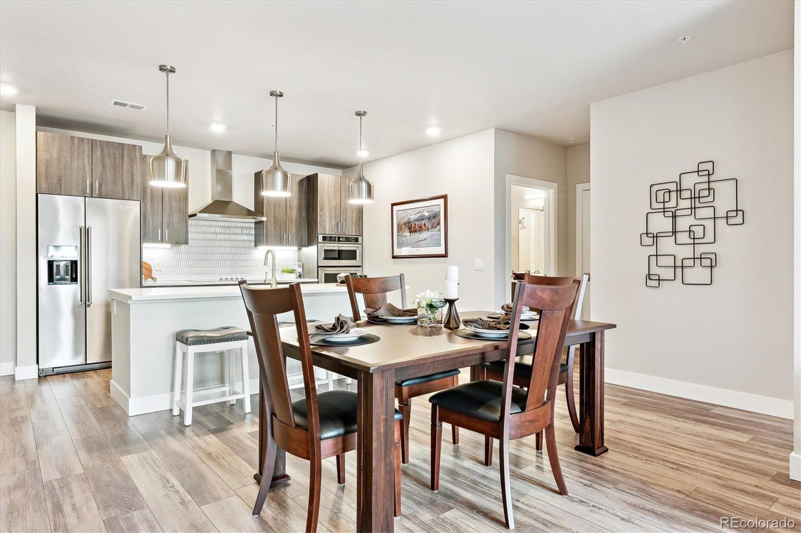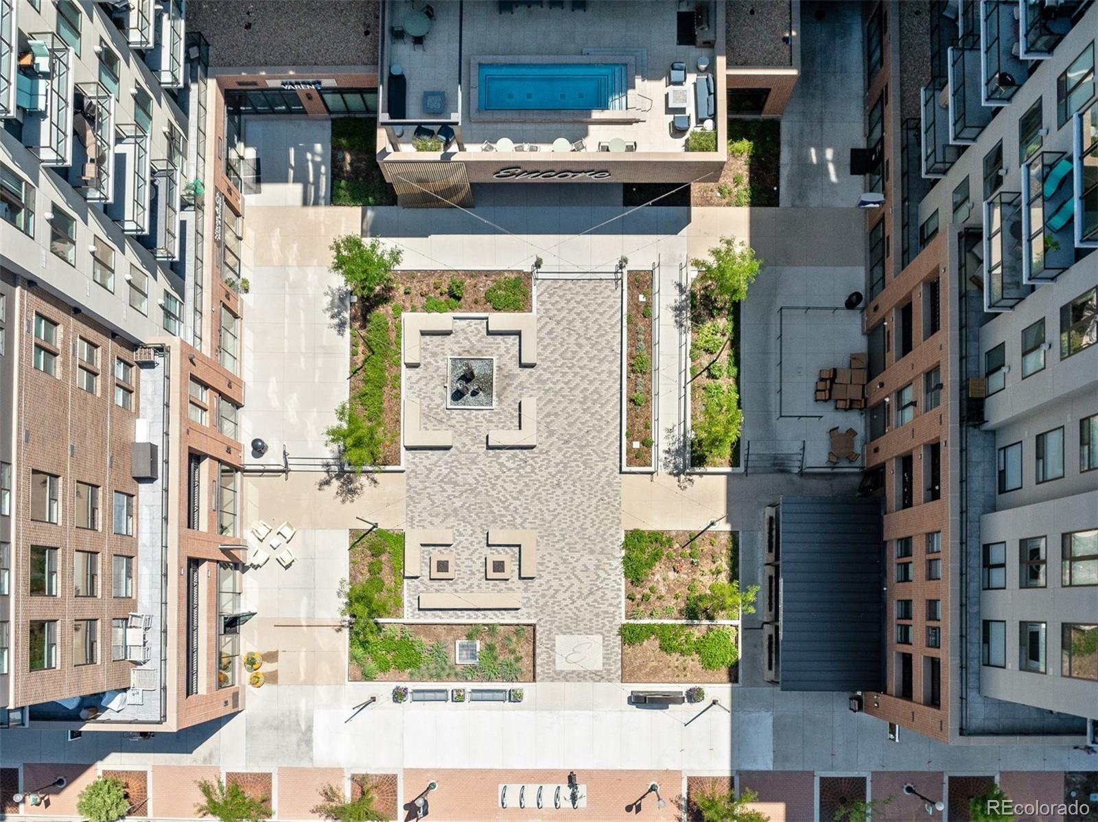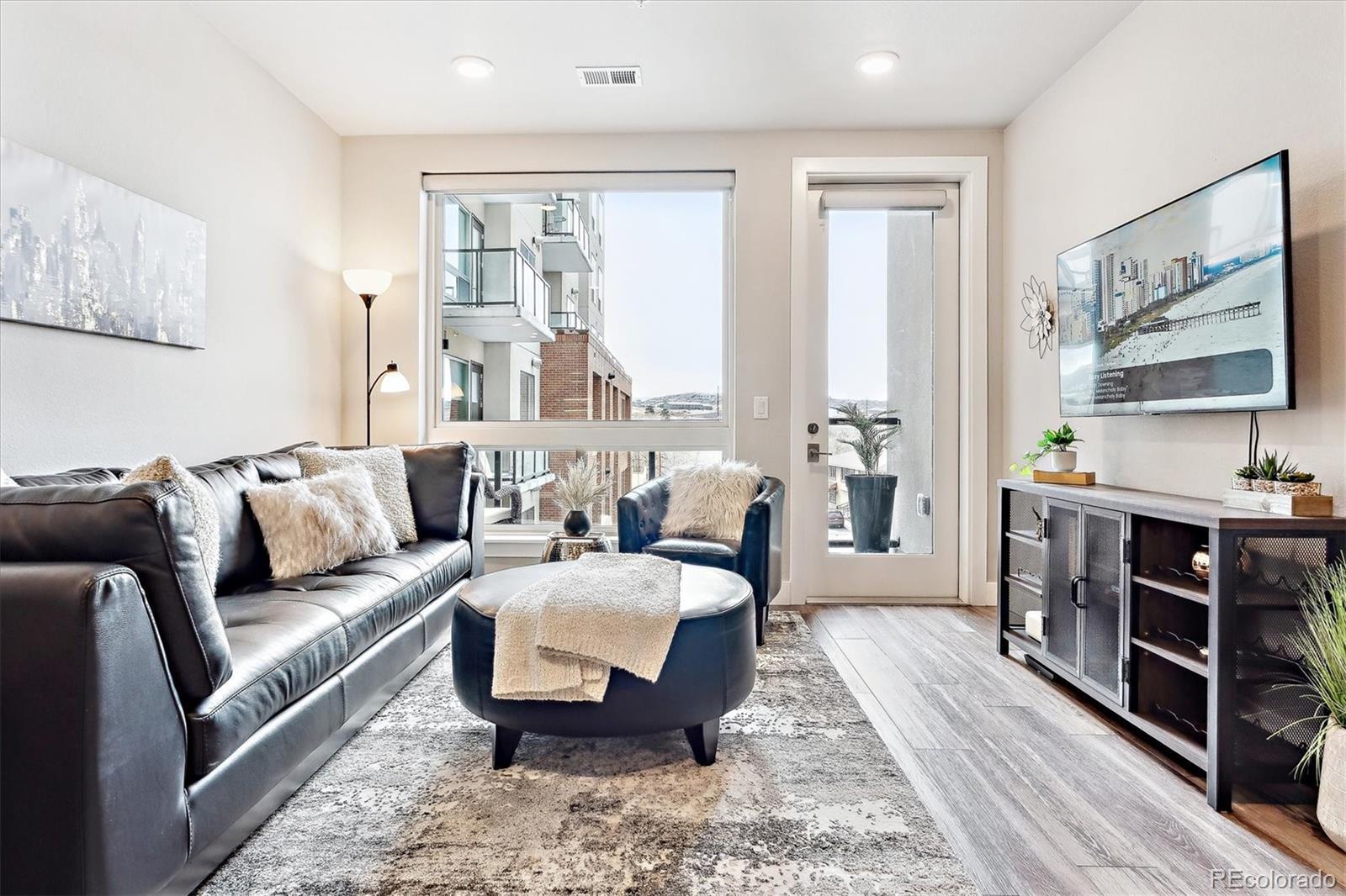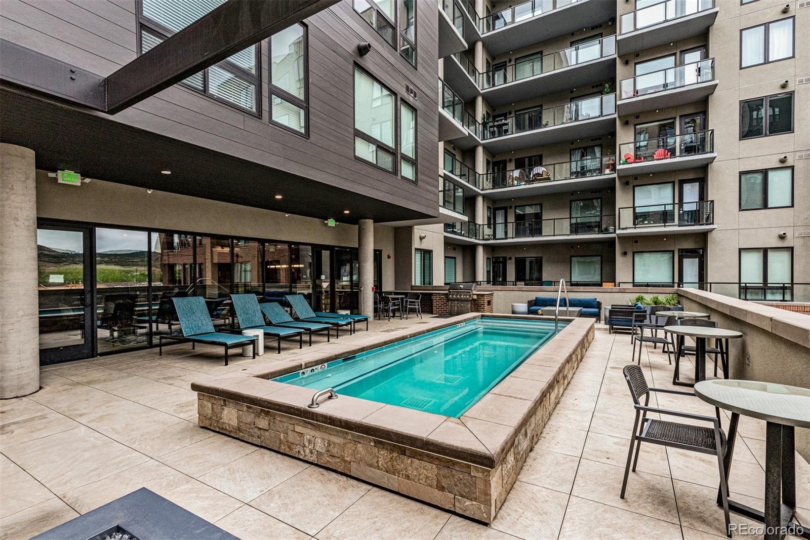 Wake up to the soft morning light, step onto your private balcony, & take in the energy of Castle Rock. Overlooking the courtyard & spa, this trendy condo puts you in the heart of it all—people-watching, downtown events, & even fireworks on special nights. Inside, luxury vinyl flooring flows throughout, & natural light fills the space. The open kitchen is both stylish & functional, with quartz countertops, a large island with seating, pendant lighting, soft-close drawers, stainless steel appliances, & a walk-in pantry. The dining area has plenty of room for a large table, perfect for hosting friends or enjoying a quiet meal. The great room feels open & inviting, with door leading to your balcony—your own little retreat to unwind, sip a drink, & catch glimpses of the mountains peeking through. The laundry room is thoughtfully designed with built-in cabinetry, counter space, & washer & dryer included. The primary suite is bright & welcoming when you want it to be, but blackout shades let you sleep in just a little longer. The ensuite bath has a spa-like feel with a large walk-in shower, stylish finishes, & a spacious walk-in closet. The second bedroom is generously sized, also with a walk-in closet—perfect for guests, a home office, or whatever suits your lifestyle. Encore’s AWESOME AMENITIES take this condo to the next level. Stay active in the FITNESS CENTER with treadmills, weights, ellipticals, & more. Work on your swing in the GOLF SIMULATOR or hang out in the CLUBROOM with a full kitchen, TVs, pool table, & a HUGE SPA HOTUB. There’s even a PET-WASHING STATION & DOG PARK for your furry friend. KEY FOB entry, elevators, & plenty of public parking make life easy, plus you’ll have 2 DEEDED PARKING SPACES near the entry. Step outside & you’re within walking distance of great restaurants, bars, coffee shops & boutiques, plus easy access to hiking & biking trails. Need to get somewhere fast? I-25 is just minutes away. This isn’t just a condo—it’s a lifestyle.