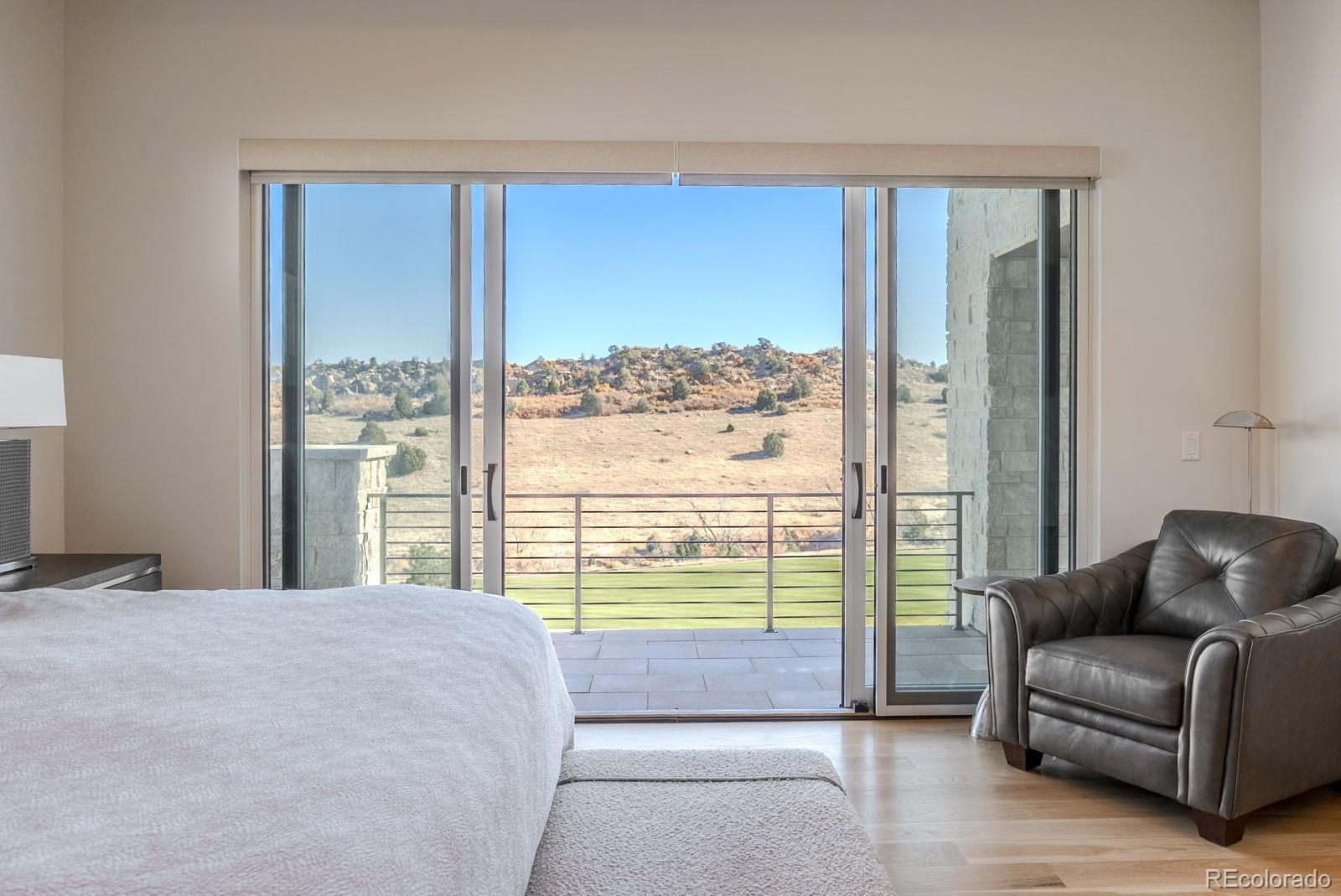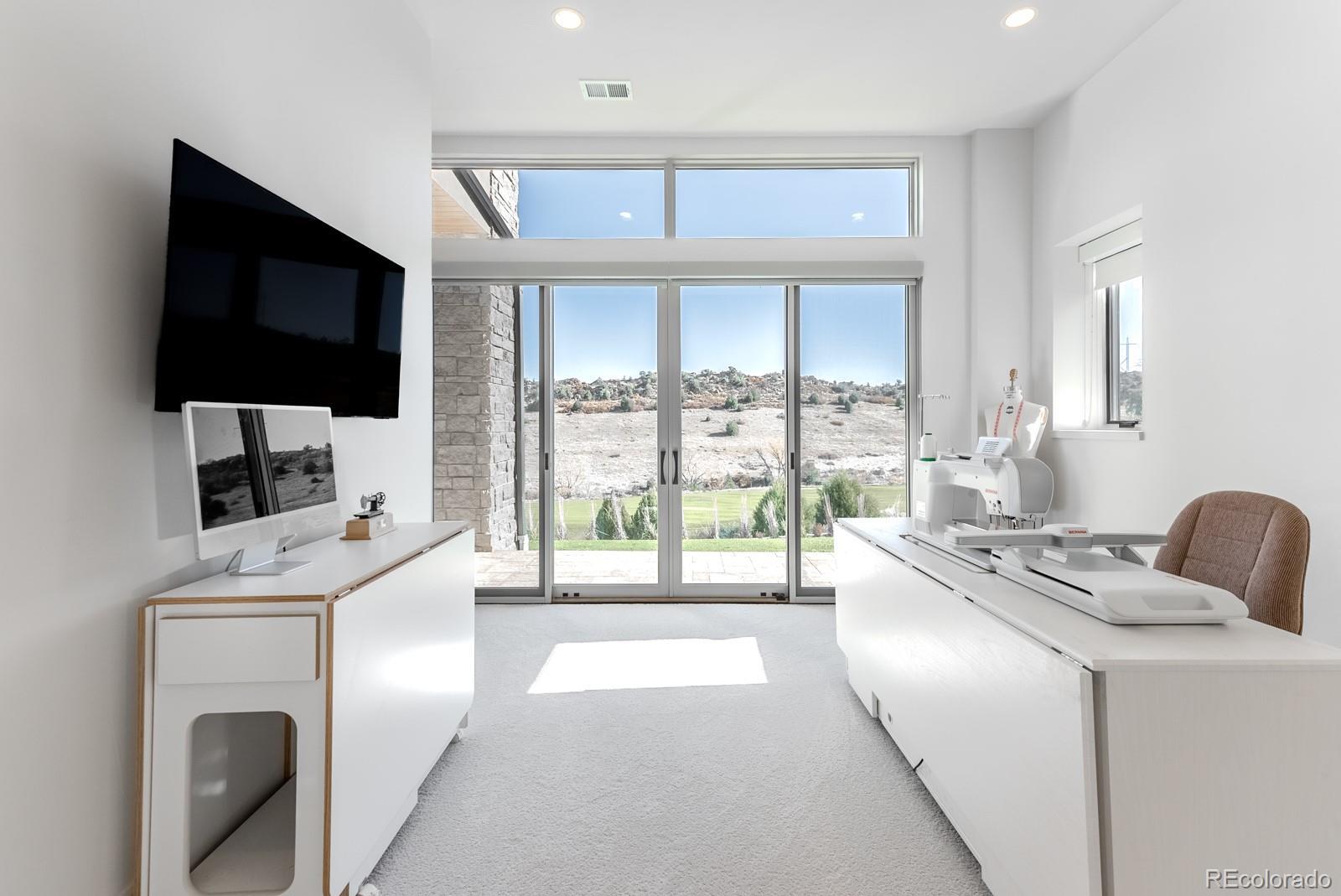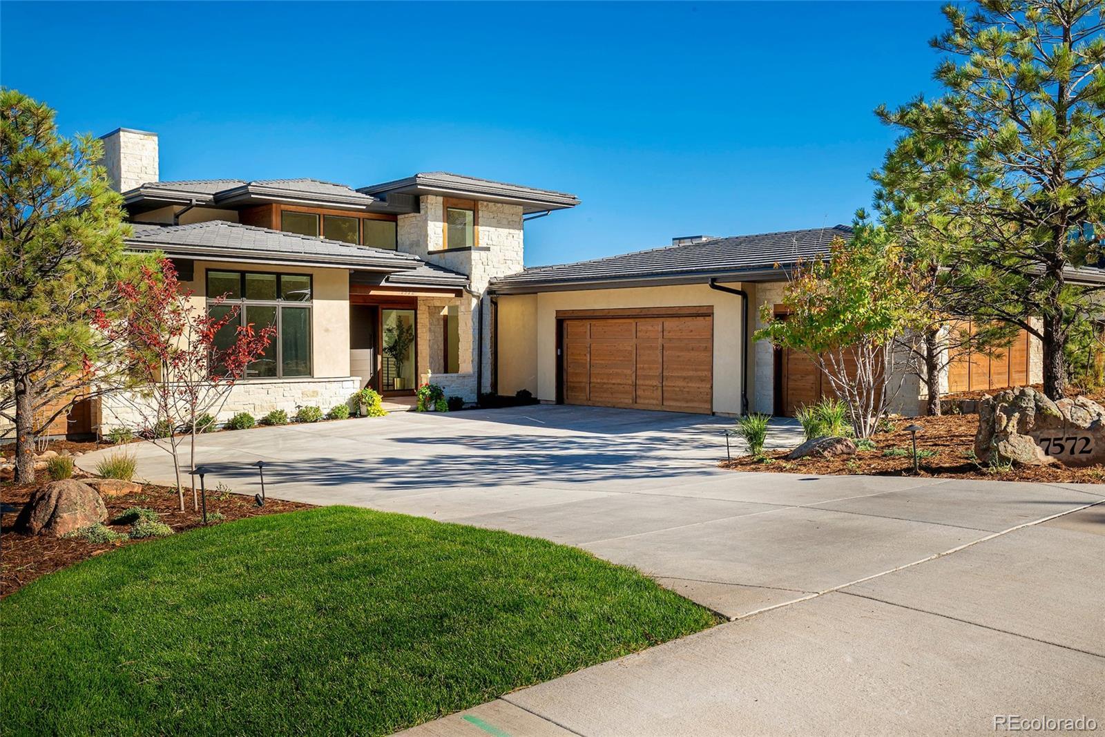 Privately elevated above the 12th and 15th fairways of the award-winning Ravenna Golf Club, this contemporary ranch estate commands an irreplaceable panorama of emerald greens undulating toward sparkling ponds, framed by dramatic red-rock formations and the Front Range beyond. Behind Ravenna’s gates lies an elevated lifestyle of wellness, social connection and refined luxury where fine dining, fitness and nature exist in perfect harmony. An architectural statement, the modern façade fuses smooth stucco planes, limestone accents and linear rooflines for a composition both contemporary and timeless. Inside, white oak floors lead through voluminous sun-filled spaces where light and clean lines converge in sophisticated balance. The great room rises twenty feet beneath beamed ceilings and clerestory windows anchored by a sleek fireplace and wall of glass opening to a vast terrace overlooking the golf course and mountains. The kitchen presents as a culinary studio blending an ethereal palette with design precision, featuring a floating white-oak drop ceiling, eleven-foot quartz island, a suite of professional-grade appliances and a wet bar seamlessly connecting to the great room for effortless entertaining. The dining area, office and dramatic powder bath each continue the theme of artistry and polish. The primary suite is a sanctuary of calm with terrace access and breathtaking views, complemented by a spa bath with freestanding tub, poured-concrete vanities and boutique-style dressing closet. A statement staircase guides to the walk out lower level—a world of leisure with a billiards and media lounge, flagstone fireplace and a luminous back-lit quartzite bar with an impressive wine column. Three bedroom suites and a rejuvenating dry sauna room complete the level. Outside, over $100,000 in new landscaping introduces a lush lawn, cascading terraced gardens and a full-length patio offering multiple destinations for gathering and savoring the home’s spectacular setting.