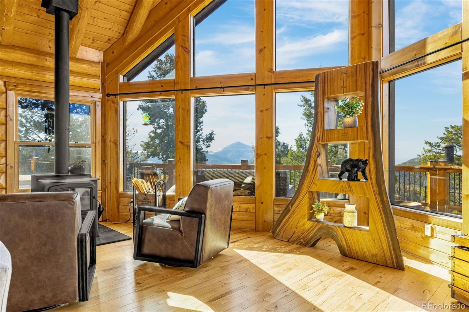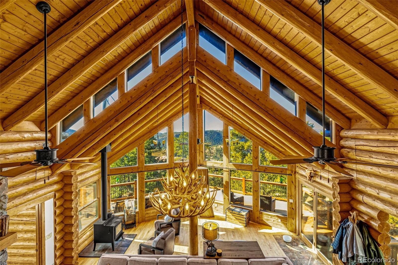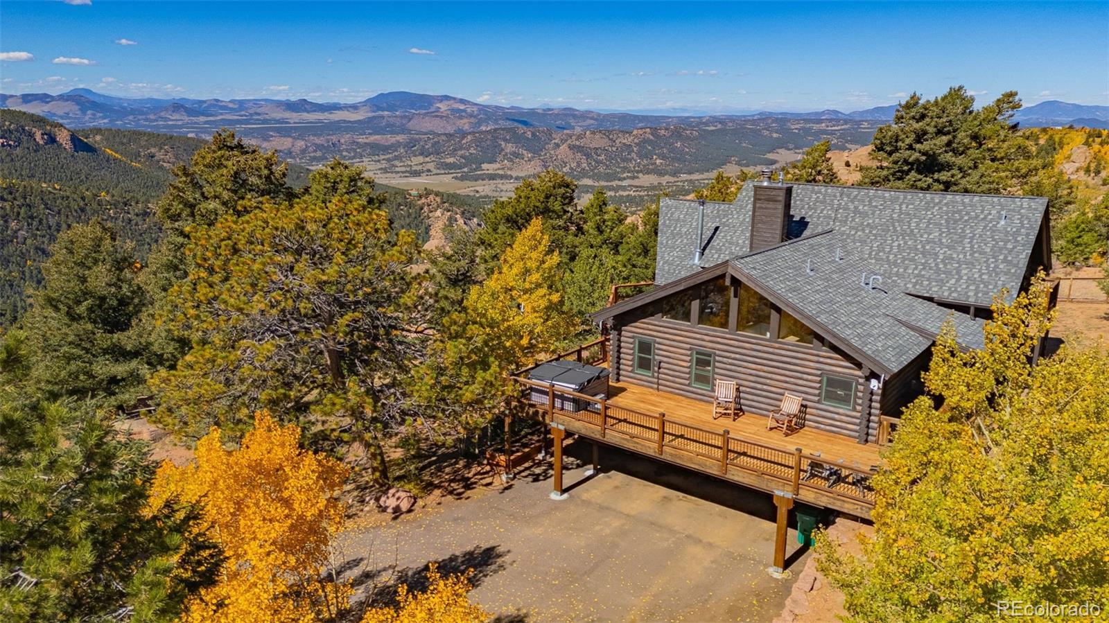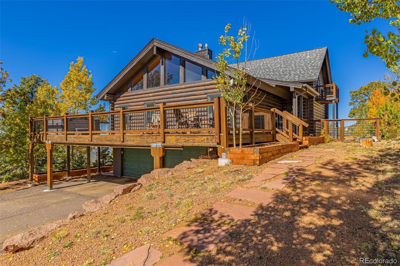 Welcome to this stunning log home on 1.2 acres in Cripple Creek Mountain Estates. Perfectly perched atop dramatic boulders with 360-degree views, this 3-bedroom, 4-bath retreat blends classic Colorado charm with thoughtful upgrades and unbeatable outdoor living. The main level showcases a grand living room with floor-to-ceiling windows, a striking rock fireplace, cozy wood-burning stove, hardwood floors, and walkout access to an expansive wraparound deck with breathtaking mountain views. The updated kitchen features white quartz countertops, new appliances, and a large pantry with plenty of prep and storage space, while the octagon dining room adds rustic elegance. A powder room and private elevator complete the main level. The primary suite offers vaulted ceilings, floor-to-ceiling logs, new carpet (along with the rest of the carpeted areas), deck access with a hot tub, and a luxurious ensuite bathroom with dual quartz vanities, jetted tub, walk-in shower, walk-in closet, and laundry. Upstairs, the loft captures impressive western views, includes a Juliet balcony to the east, and features its own 3/4 bathroom. The lower level provides access to the oversized 2-car garage, two secondary bedrooms, a full bathroom, family room, office nook, and walkout. The exterior has been recently refinished. Additional features include a greenhouse, fenced side yard for pets, and multiple outdoor spaces ideal for entertaining. This is a quintessential Colorado log home offering unmatched serenity, views, and craftsmanship.