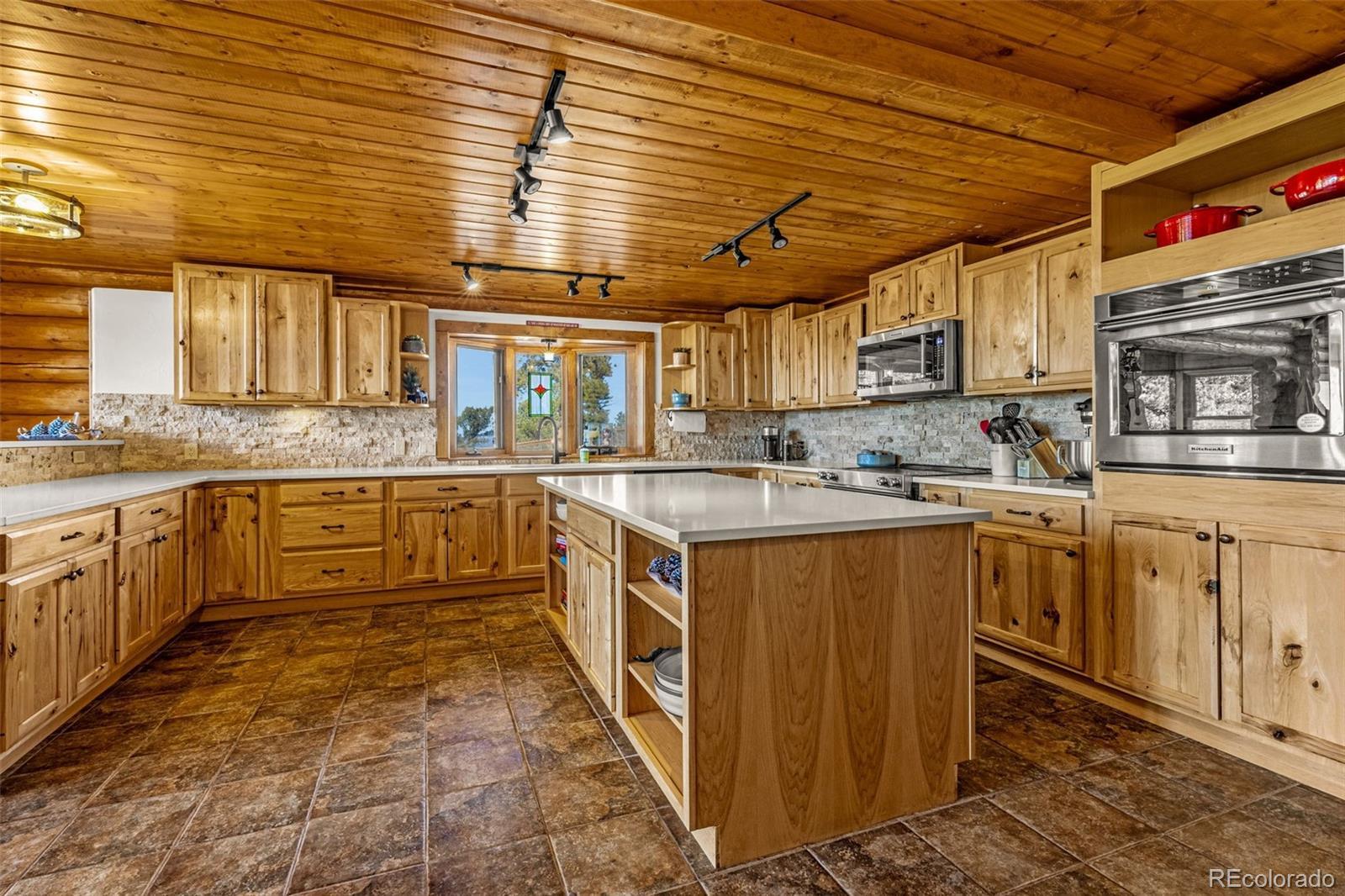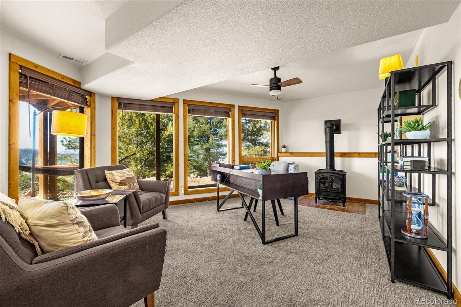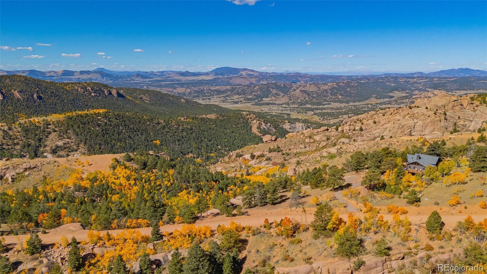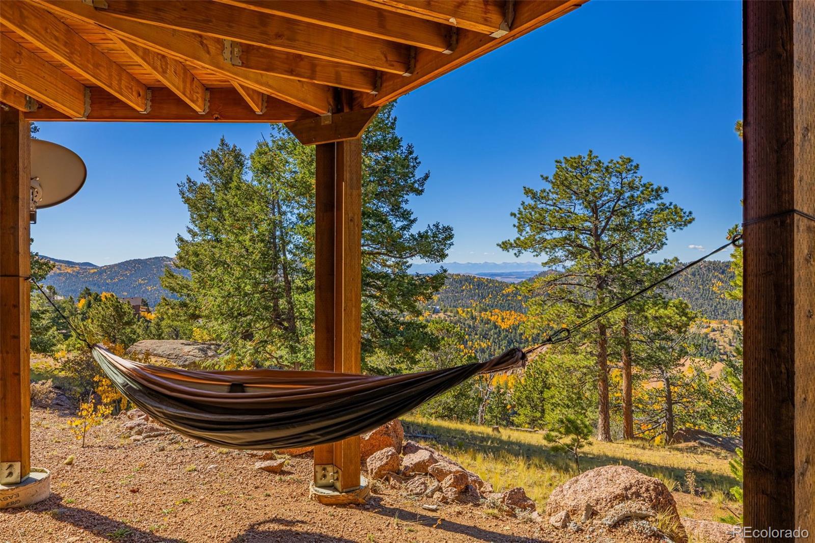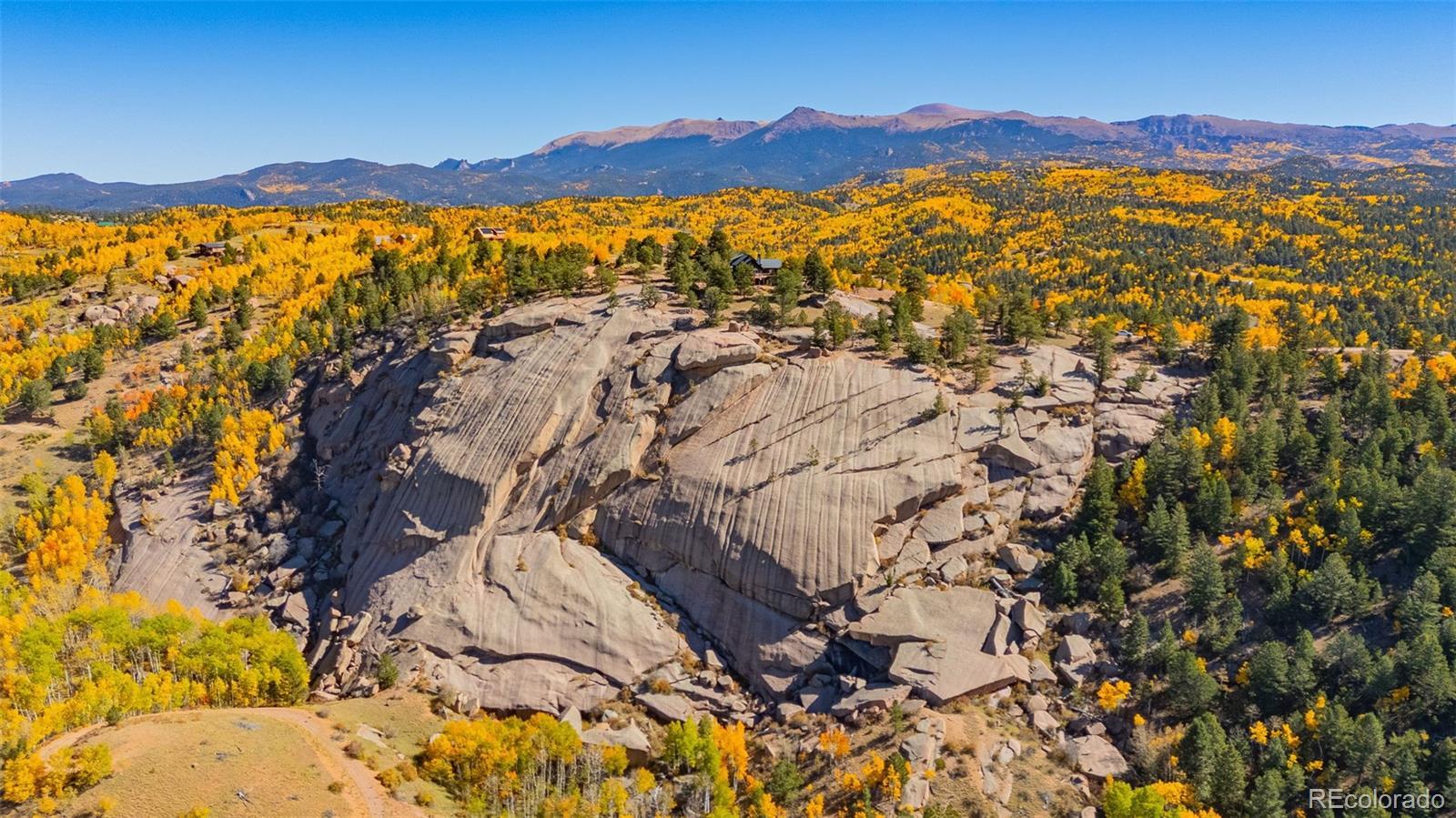 Welcome to this stunning log home on 1.2 acres in Cripple Creek Mountain Estates. Perfectly perched atop dramatic boulders with 360-degree views, this 3-bedroom, 4-bath retreat blends classic Colorado charm with thoughtful upgrades and unbeatable outdoor living. The main level showcases a grand living room with floor-to-ceiling windows, a striking rock fireplace, cozy wood-burning stove, hardwood floors, and walkout access to an expansive wraparound deck with breathtaking mountain views. The updated kitchen features white quartz countertops, new appliances, and a large pantry with plenty of prep and storage space, while the octagon dining room adds rustic elegance. A powder room and private elevator complete the main level. The primary suite offers vaulted ceilings, floor-to-ceiling logs, new carpet (along with the rest of the carpeted areas), deck access with a hot tub, and a luxurious ensuite bathroom with dual quartz vanities, jetted tub, walk-in shower, walk-in closet, and laundry. Upstairs, the loft captures impressive western views, includes a Juliet balcony to the east, and features its own 3/4 bathroom. The lower level provides access to the oversized 2-car garage, two secondary bedrooms, a full bathroom, family room, office nook, and walkout. The exterior has been recently refinished. Additional features include a greenhouse, fenced side yard for pets, and multiple outdoor spaces ideal for entertaining. This is a quintessential Colorado log home offering unmatched serenity, views, and craftsmanship.