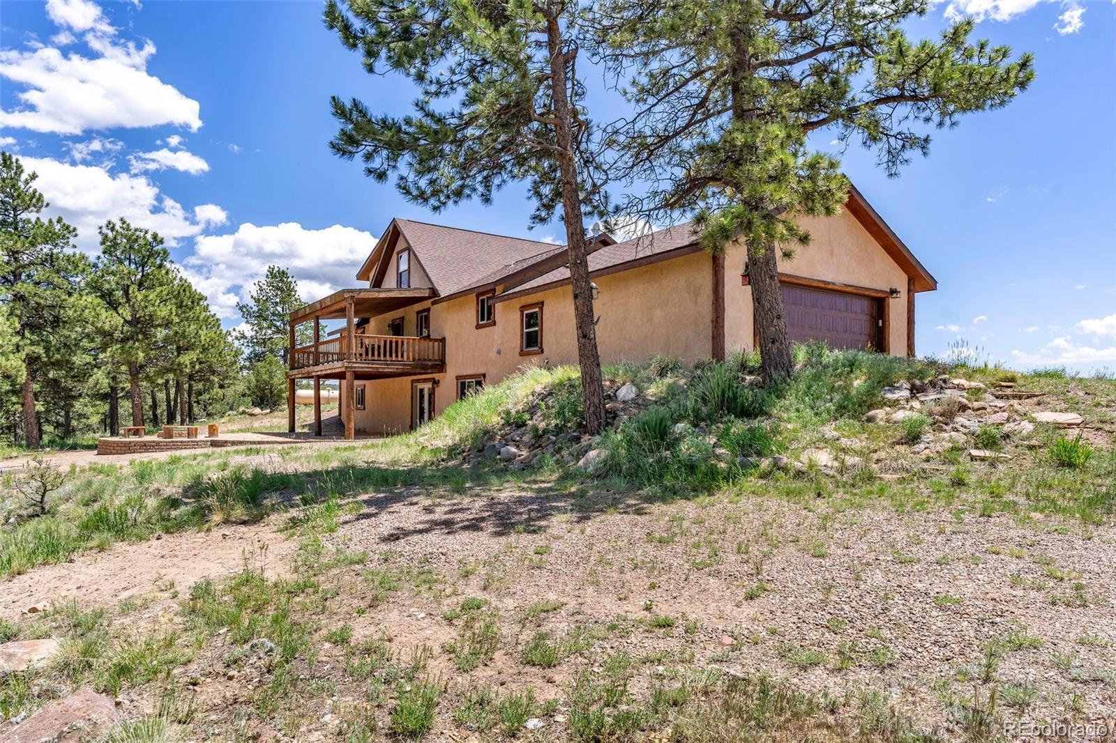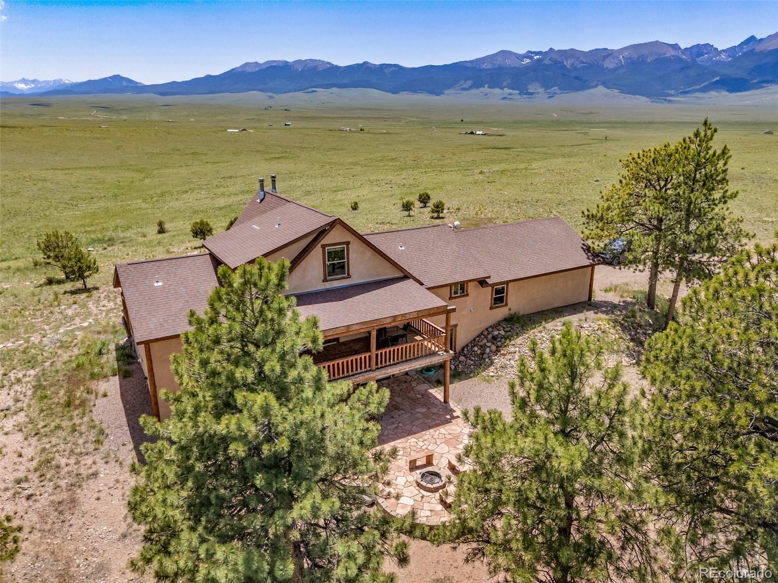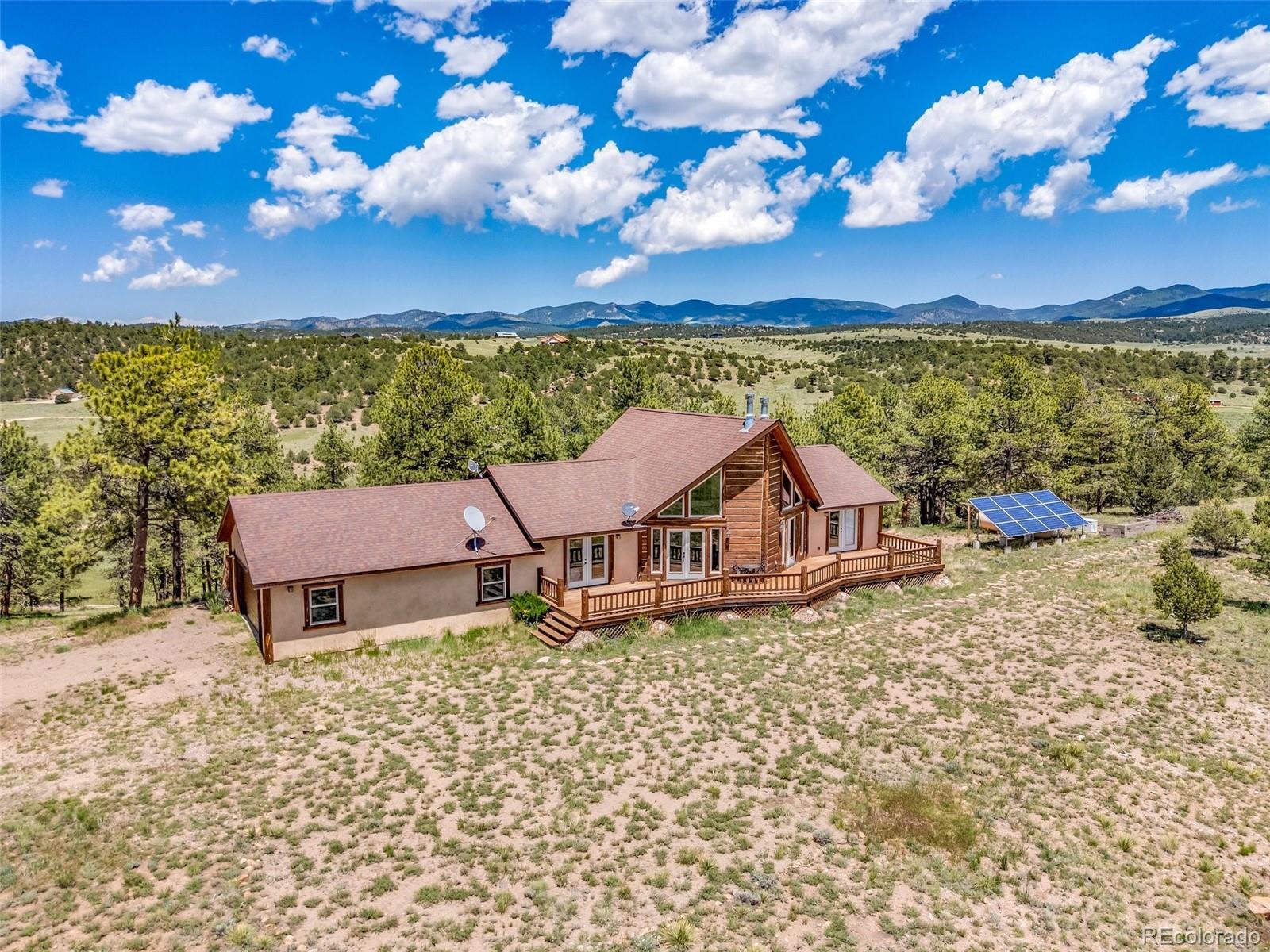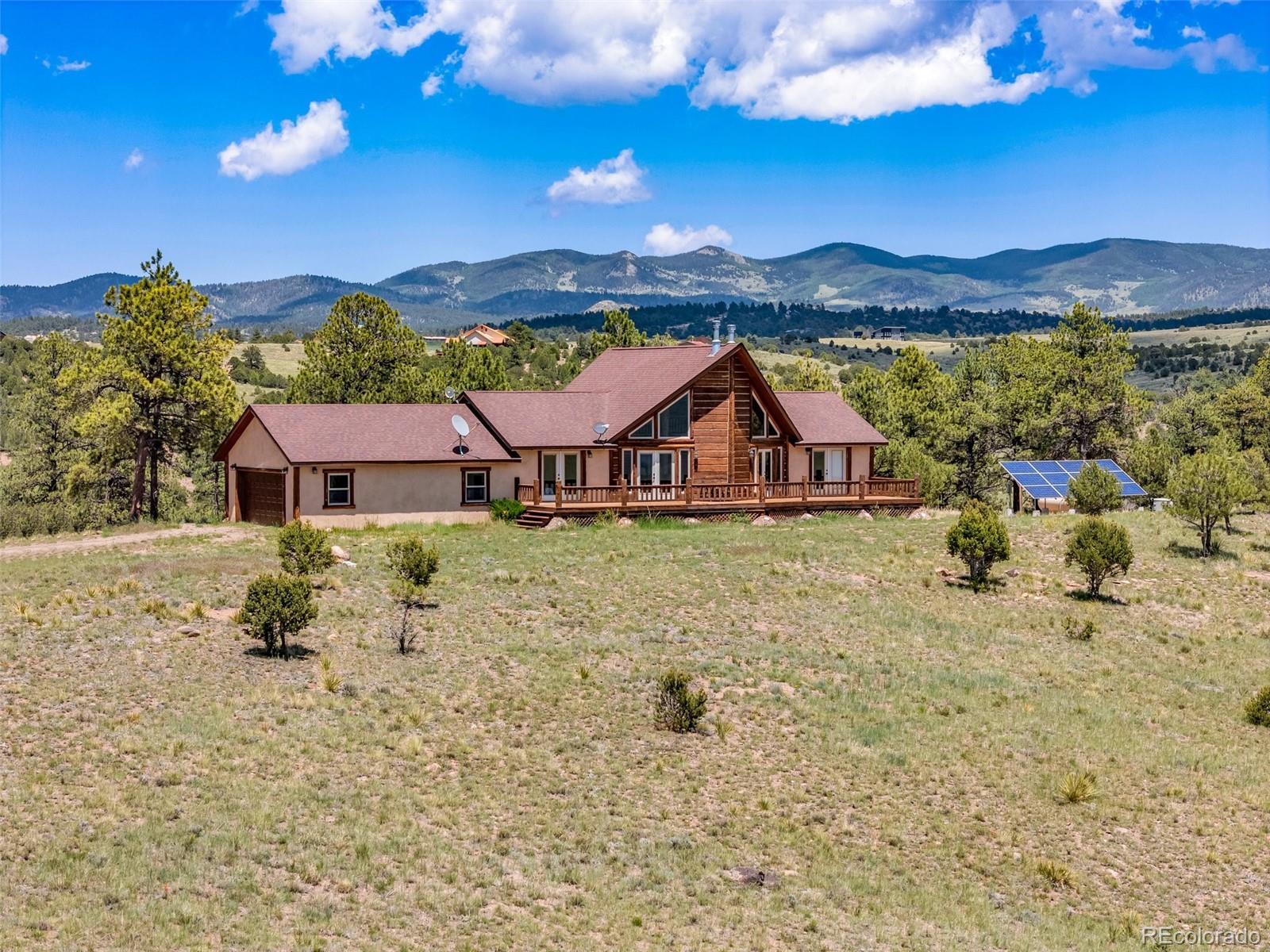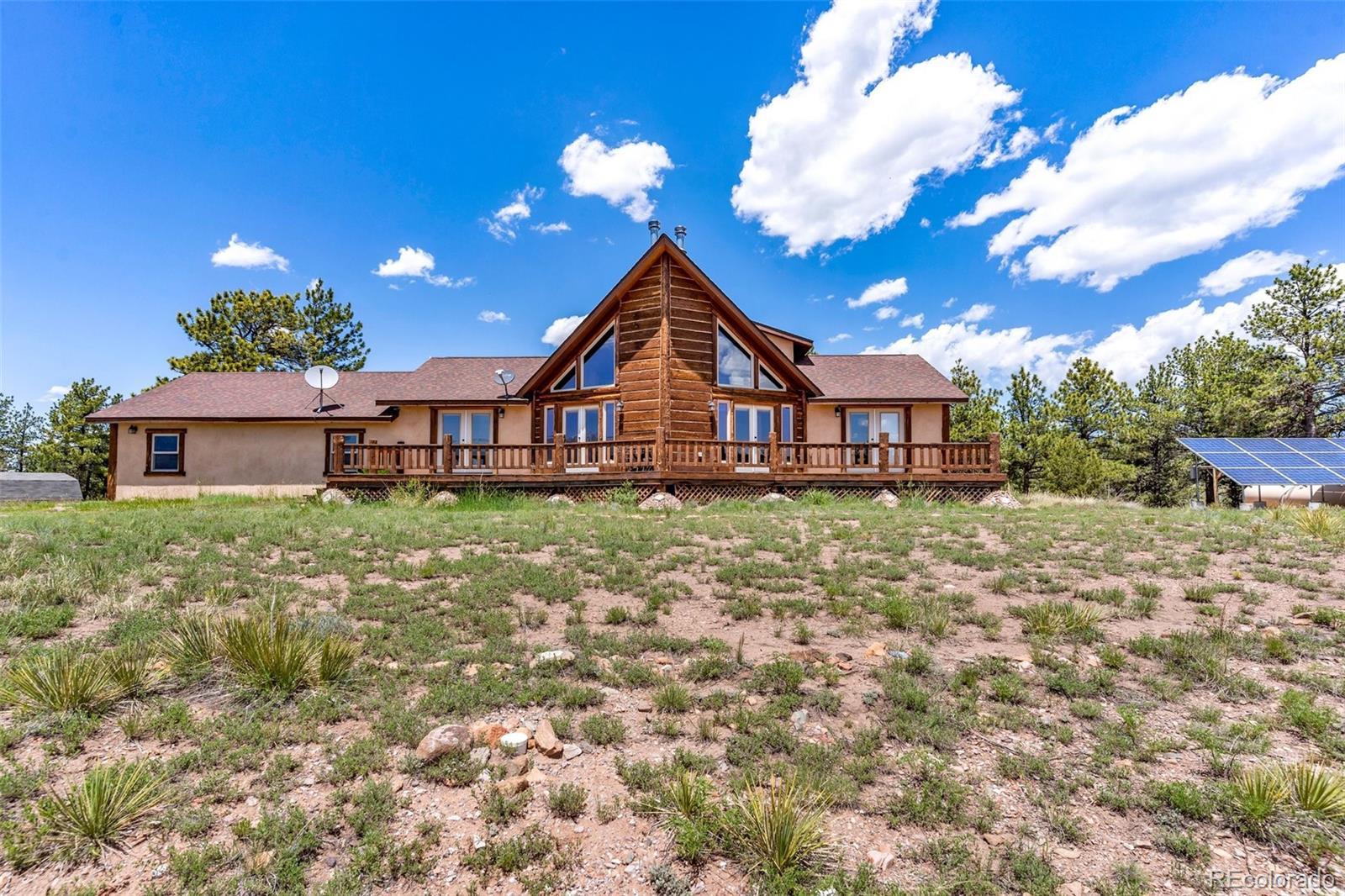 Discover this exceptional custom-built 3-bedroom, 4-bathroom home on 35 private, partially treed acres with breathtaking, unobstructed views of the Sangre de Cristo Mountains. Blending rustic mountain charm with modern comforts, this property offers an ideal retreat for those seeking privacy, natural beauty, and a true Colorado lifestyle. The main level features soaring vaulted ceilings, a dramatic floor-to-ceiling stone fireplace, and expansive windows that flood the home with natural light while framing panoramic mountain views. Live edge wood accents add warmth and character. Two spacious main-level bedrooms include a luxurious primary suite with ensuite bath and deck access — perfect for sunrise coffee or sunset relaxation. The open kitchen offers ample cabinetry, generous prep space, and a layout designed for entertaining. Upstairs, a versatile loft works beautifully as an office, reading nook, or studio. The full walk-out basement provides a massive second living or recreation space, plus a private third bedroom with ensuite bath. Step outside to enjoy a lower patio, elevated deck, and a secluded fire pit area tucked into the trees. With 35 acres, this property offers endless possibilities — from keeping horses to simply enjoying the peace and privacy. Solar power adds energy efficiency, and the location is just minutes from the vibrant mountain town of Westcliffe, known for its shops, restaurants, and Dark Sky stargazing. Experience Colorado mountain living at its finest.