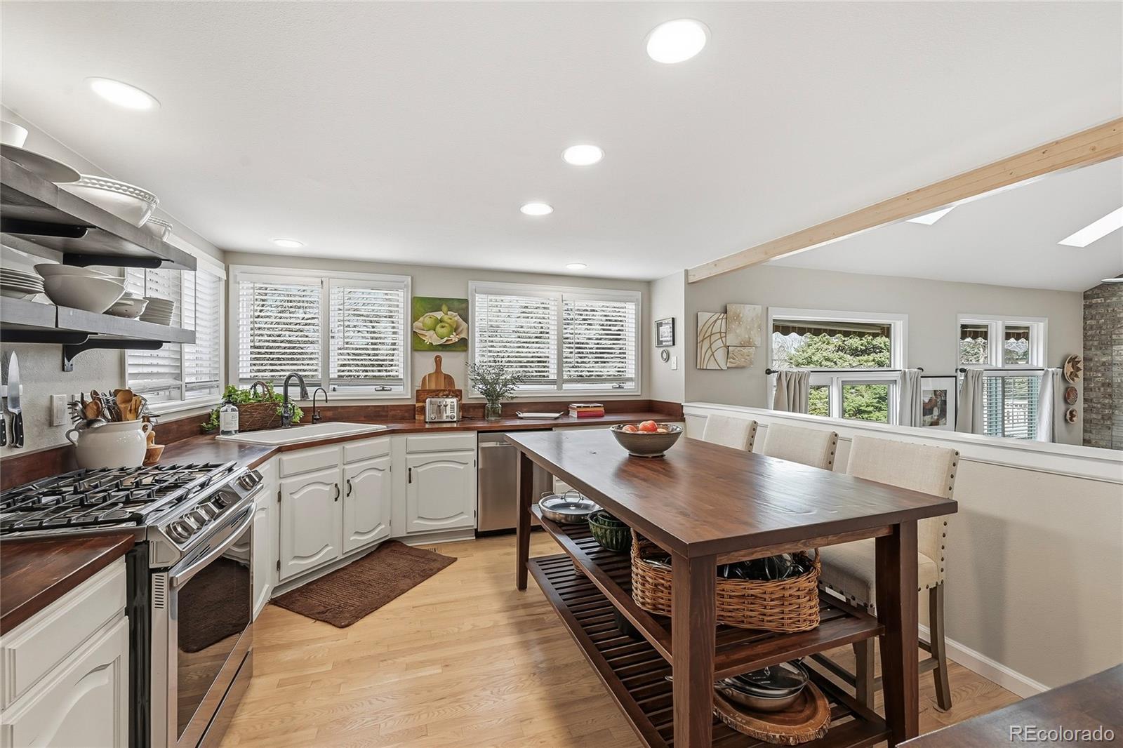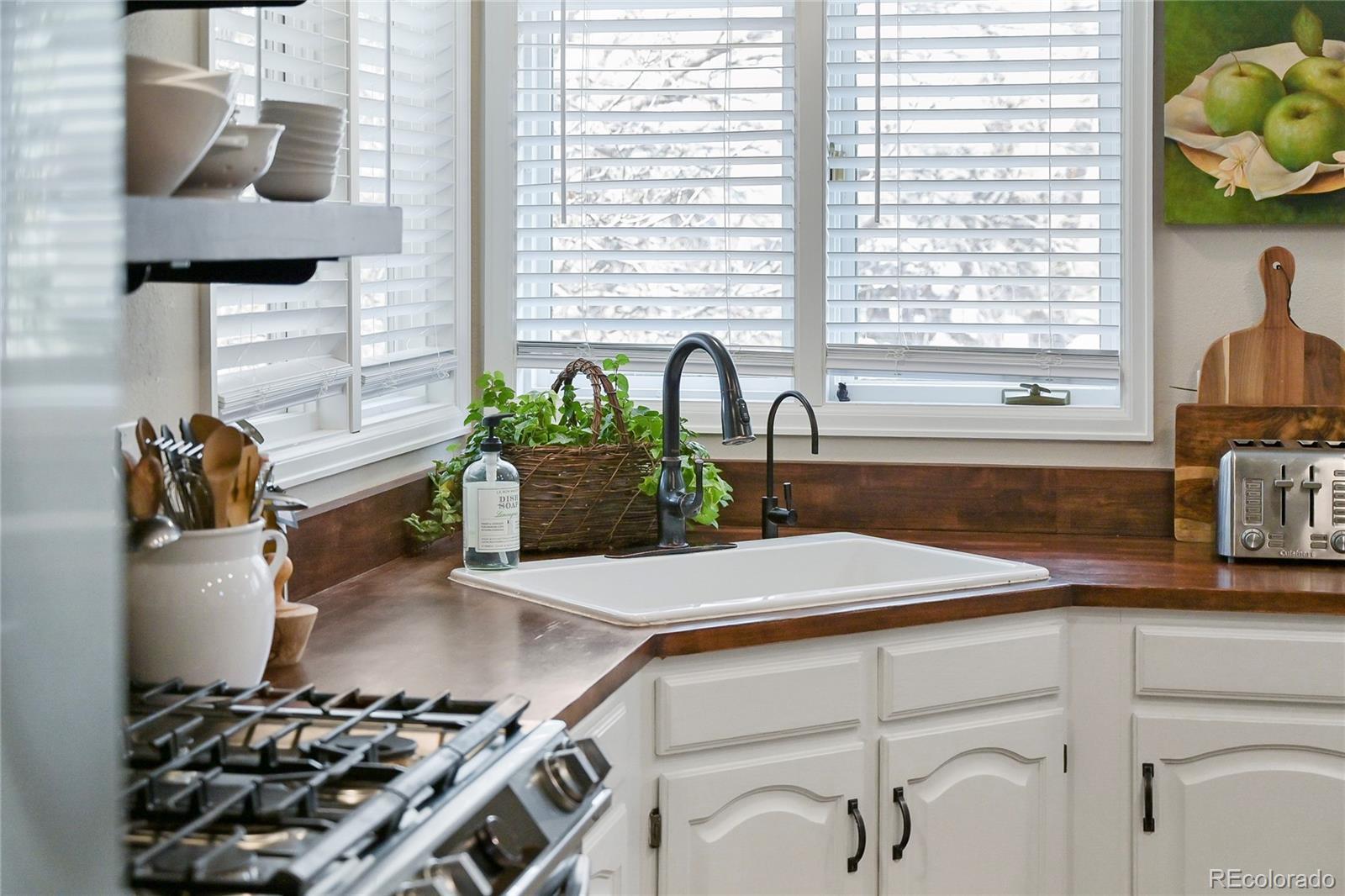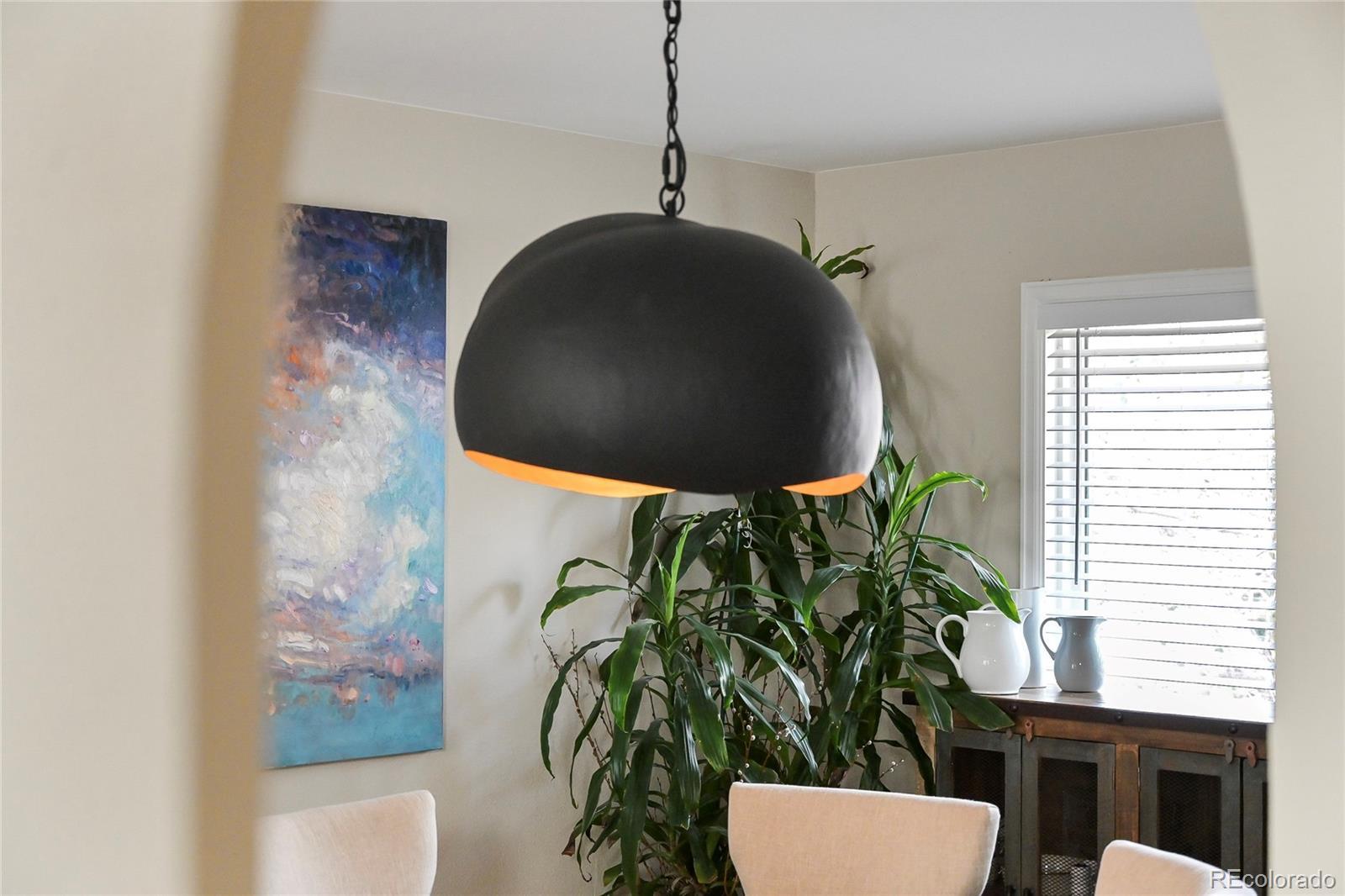 A thoughtfully reimagined designer home curated by an interior design artist and architect, where every detail reflects intention, craftsmanship, and soul. This is not a quick remodel — it is a true labor of love, evident throughout. From the moment you enter, soaring two-story ceilings, striking architectural lines, and a warm, elevated aesthetic create a lasting impression. Sightlines lead to a stunning dining room fixture handcrafted from sheet metal, setting the tone for the home’s artistic character. The kitchen features new appliances, white cabinetry, open shelving, and butcher block countertops that blend function and charm. The family room is a showstopper with dramatic height, beautiful brickwork, and custom built-ins. Upstairs offers three bedrooms, including a private primary suite on its own level with soaring ceilings and a spa-inspired ensuite featuring a freestanding tub, oversized glass shower, marble counters, and tile flooring. A remodeled secondary bath serves the additional bedrooms. An office/loft overlooking the living room adds flexibility and architectural interest. The finished light filled walk-out basement works well as a private guest space, in-law, or rental space with an open living/sleeping area, ¾ bath, dining space, and a fully equipped kitchen. Outdoors, organic gardens create a peaceful escape. A 319-sq-ft weatherproof storage area offers valuable space similar to third-car garage storage. Located in Highlands Ranch with access to award-winning Douglas County schools including the neighborhood EL Designated Fox Creek Elementary, beautiful parks, greenbelts, walking trails, and four state-of-the-art recreation centers with full gyms, courts, and indoor + outdoor pools.