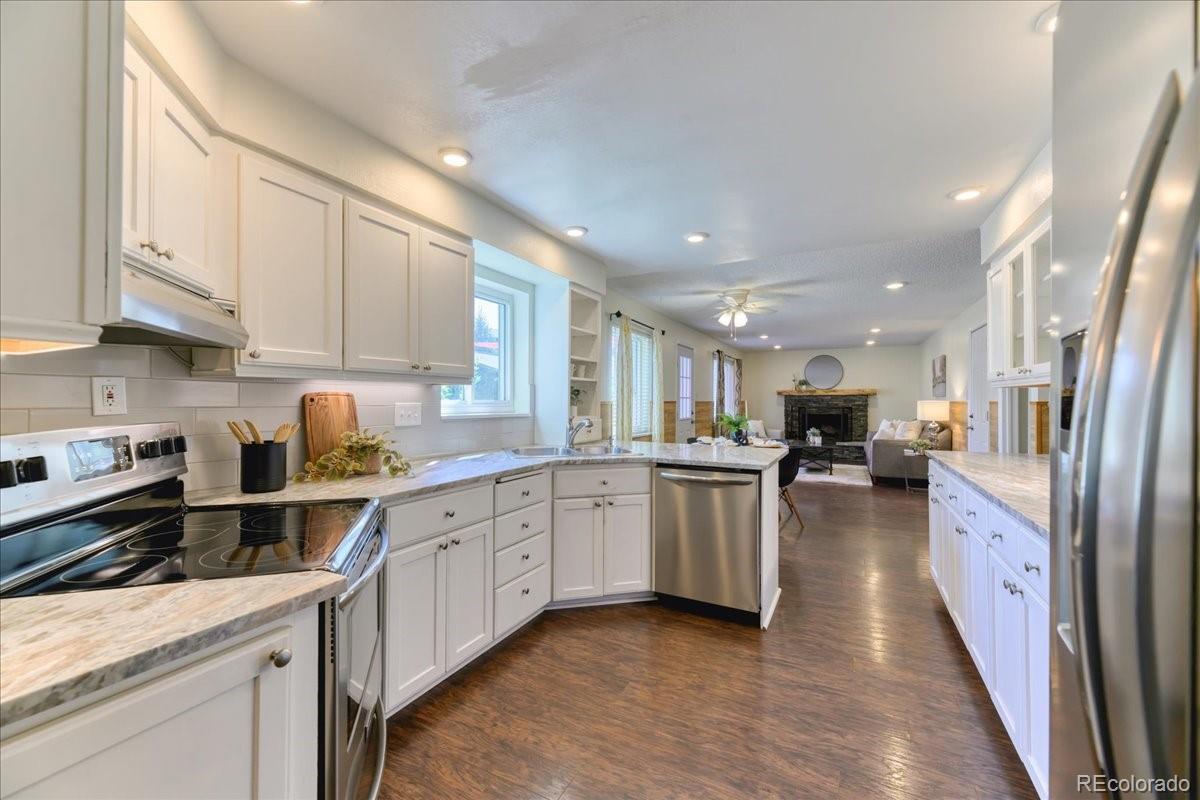 Wake up to open space views, step directly onto the Ralston Creek Trail, and enjoy the kind of privacy that’s hard to find on the west side. This move-in ready Ralston Valley home backs directly to Gibbs Community Park, offering a rare connection to nature while remaining close to everything Arvada has to offer. Inside, an open and functional floor plan is enhanced by fresh paint, warm wood accents, and abundant natural light from newer windows installed in 2018. The spacious eat-in kitchen features ample cabinetry, granite-style counters, a built-in buffet with glass-front cabinets, and direct access to the backyard deck and hot tub overlooking open space. The inviting family room centers around a stone fireplace with a wood mantle, creating a comfortable gathering space. All bathrooms have been updated, and the finished basement adds exceptional flexibility with a large bonus or game room, a non-conforming bedroom, an updated three-quarter bath, and a generous laundry room with excellent storage and counter space. Outdoor living shines with RV parking, a fully fenced backyard, a storage shed, a covered storage area attached to the home, and expansive views that create a private retreat for relaxing or entertaining. With thoughtful updates, flexible living areas, and unbeatable proximity to parks, trails, schools, and everyday amenities, this home offers the best of Colorado living.