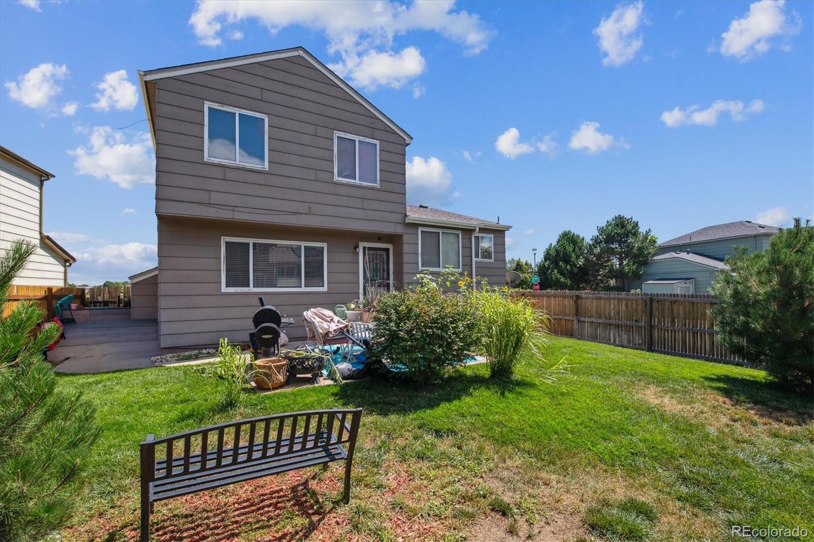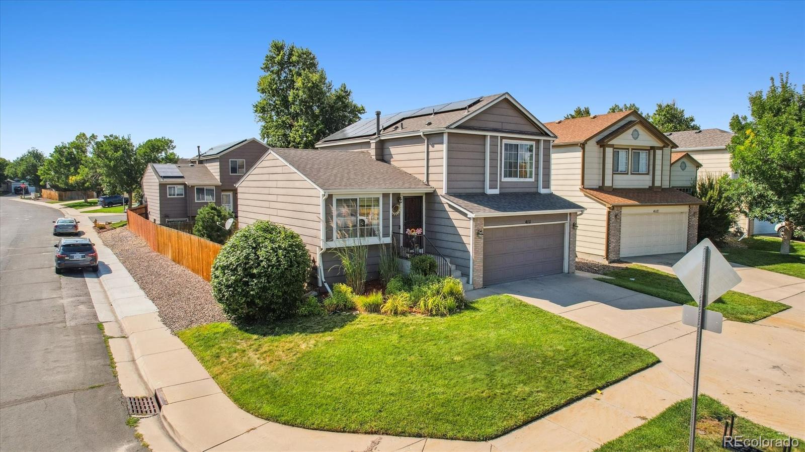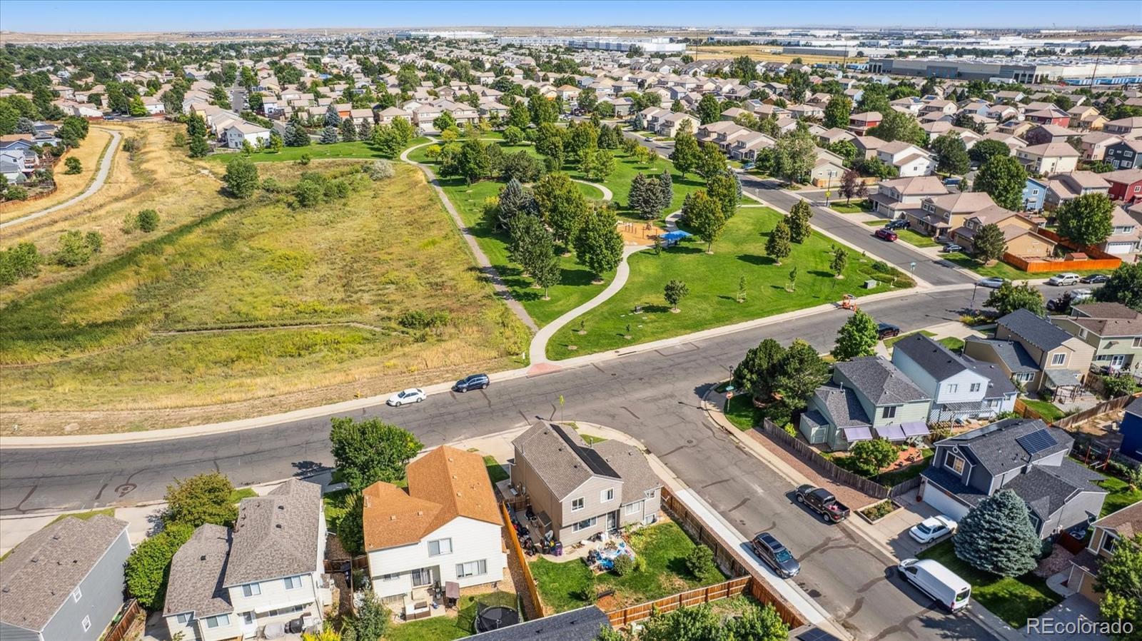 A Charming 3 Bed + 2 Bath Home on a Corner Lot, Across from Lovely Ensenada Park ** Great location close to Shopping, Public Transportation, Trails, Parks and Schools ** The main floor welcomes you with a spacious open living room, complete with a large window at the front of the home and wood floors ** Home flows into the updated, open eat-in kitchen, with granite counters, pantry and newer appliances ** Step down to a family room with a fireplace for cozy gatherings and covenient access to the patio and fenced in yard ** Upstairs are three bedrooms - the primary includes a large walk-in closet and an ensuite bath with walk-in shower and roomy vanity ** Two additional bedrooms share a full bath and could be perfect for children, guests or for use as an office, exercise or craft space ** This home has an unfinished basement with laundry hook ups ** Assessment information for the Master Homeowners Association for Green Valley Ranch is in MLS supplements ** Convenient access in minutes from E-470, I-70, Tower Road and DIA and The Highline Canal Trail is about 3 blocks to the west ** Recent updates on this home include: Roof (2024), Solar (2024), A/C, Updated Kitchen and Baths, Expanded Patio ** This property deserves a look - set your showing today!