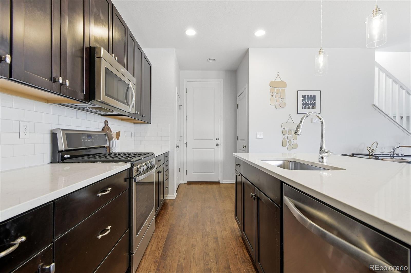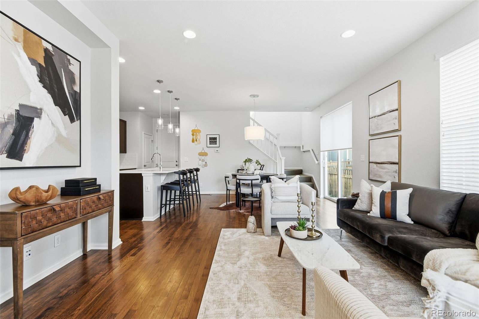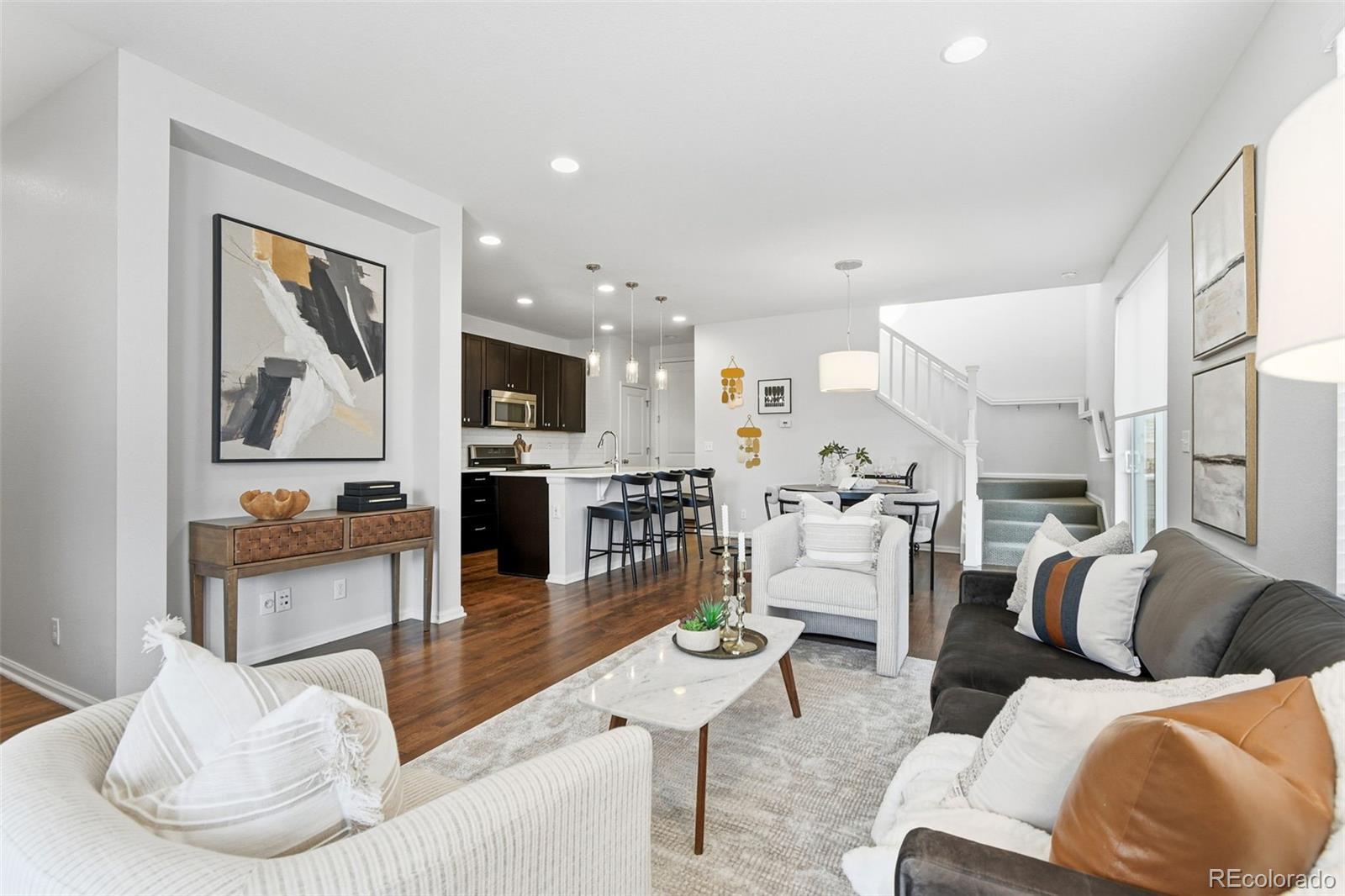 Welcome to this thoughtfully upgraded home, where custom design details meet a spacious, functional floor plan. The main level features real hardwood floors and an open, light-filled living room that flows seamlessly into the dining area and eat-in kitchen, complete with a quartz island, subway tile backsplash, and stainless-steel appliances. The layout is ideal for everyday living and entertaining, extending out to a deck and fenced yard with sunny southwest exposure. Upstairs, a generous loft offers flexible space for a cozy family room or home office. Two secondary bedrooms with western views share a full bath, while the primary suite serves as a comfortable retreat with a ¾ ensuite bath featuring a custom surround and quartz counters. Two large closets and an adjacent laundry area add everyday convenience. Custom finishes throughout bring a cohesive, elevated feel to the home. The open, unfinished basement provides a blank canvas - perfect for a gym, an entertainment area or future finished living space - along with ample storage. A two-car attached garage and extended driveway offer plenty of off-street parking. The location is equally appealing. Just a stone's throw from the newly opened Bluff Lake Center, you’ll have easy access to trails and open space, as well as the dining and shopping options at Eastbridge Town Center and Stanley Marketplace, plus convenient Light Rail and I-70 access. Whether it’s a stroll through the courtyard, a quick grocery run, or time outdoors on nearby paths and parks, this home is well positioned for everyday living.