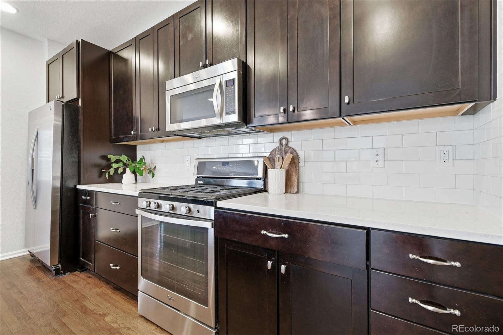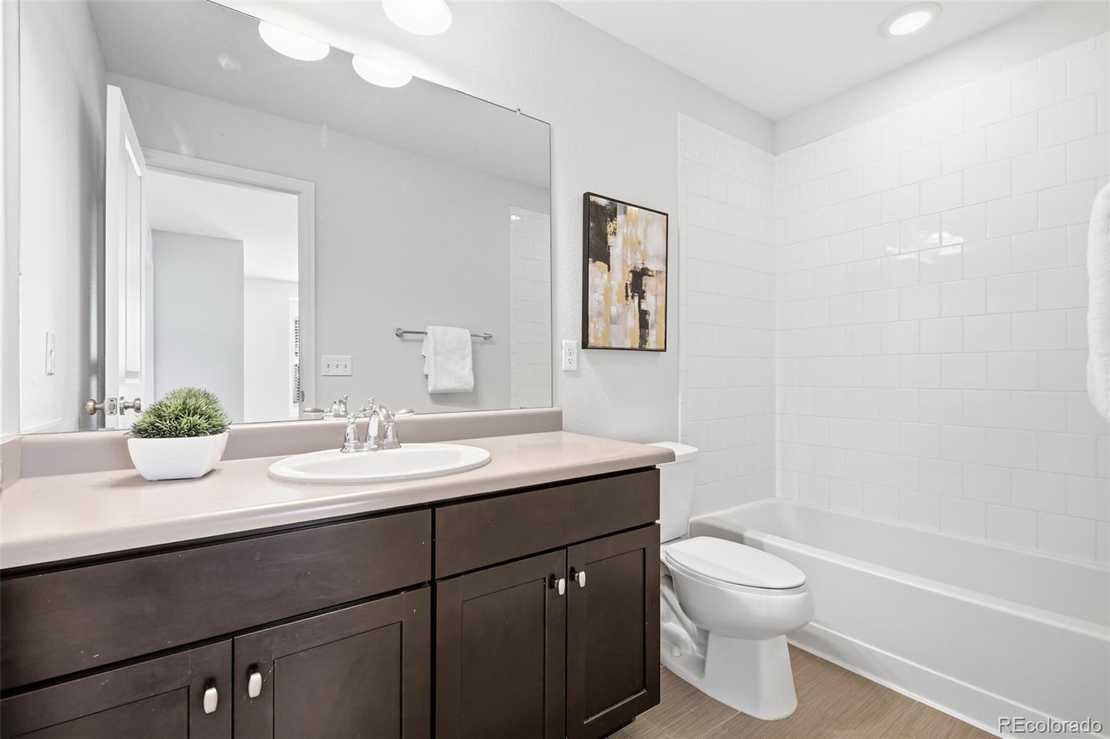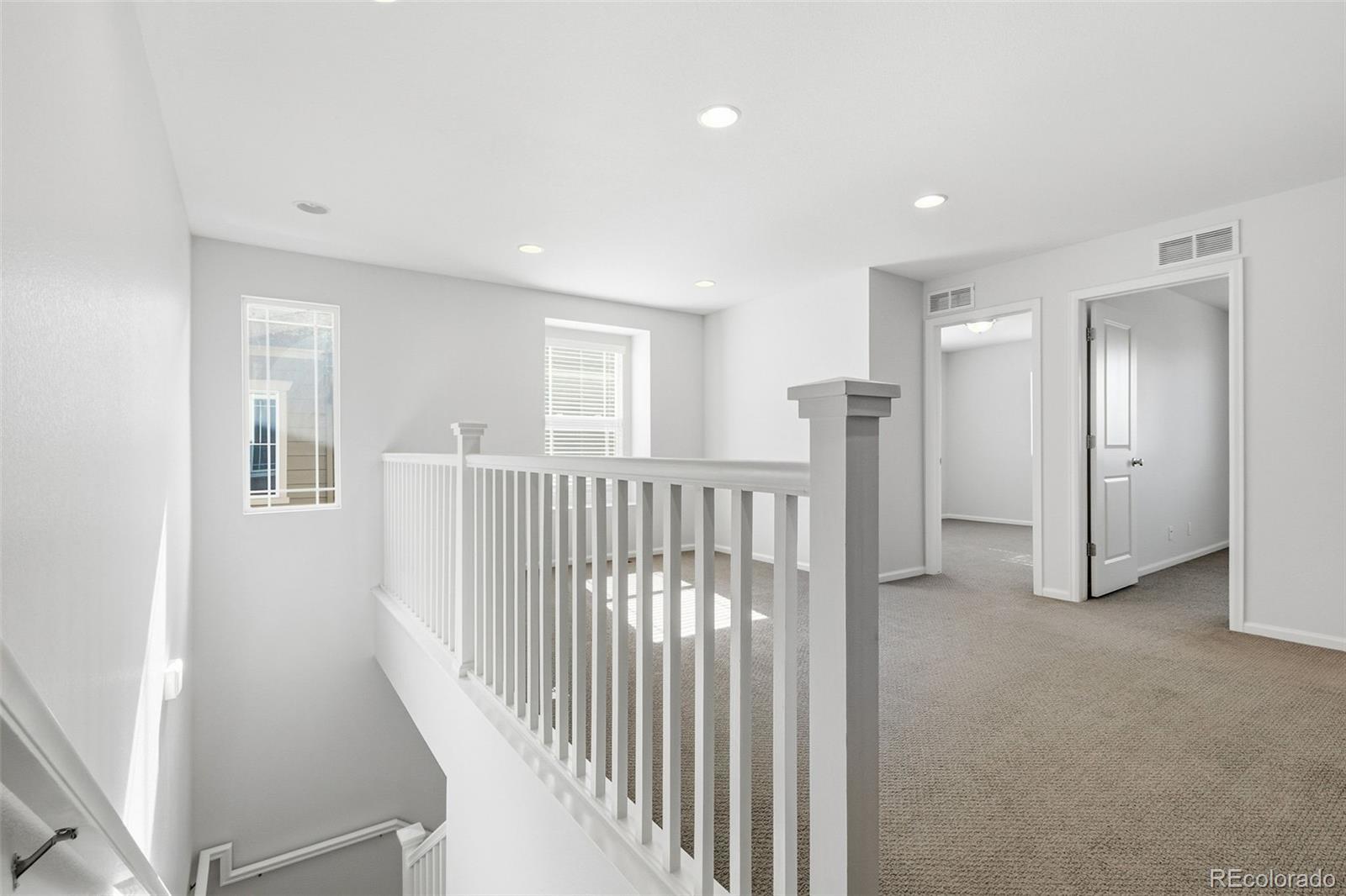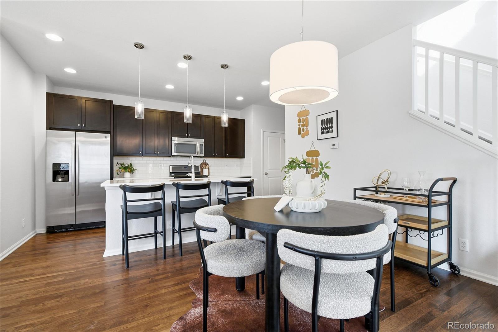 Welcome to this thoughtfully upgraded home, where custom design details meet a spacious, functional floor plan. The main level features real hardwood floors and an open, light-filled living room that flows seamlessly into the dining area and eat-in kitchen, complete with a quartz island, subway tile backsplash, and stainless-steel appliances. The layout is ideal for everyday living and entertaining, extending out to a deck and fenced yard with sunny southwest exposure. Upstairs, a generous loft offers flexible space for a cozy family room or home office. Two secondary bedrooms with western views share a full bath, while the primary suite serves as a comfortable retreat with a ¾ ensuite bath featuring a custom surround and quartz counters. Two large closets and an adjacent laundry area add everyday convenience. Custom finishes throughout bring a cohesive, elevated feel to the home. The open, unfinished basement provides a blank canvas - perfect for a gym, an entertainment area or future finished living space - along with ample storage. A two-car attached garage and extended driveway offer plenty of off-street parking. The location is equally appealing. Just a stone's throw from the newly opened Bluff Lake Center, you’ll have easy access to trails and open space, as well as the dining and shopping options at Eastbridge Town Center and Stanley Marketplace, plus convenient Light Rail and I-70 access. Whether it’s a stroll through the courtyard, a quick grocery run, or time outdoors on nearby paths and parks, this home is well positioned for everyday living.