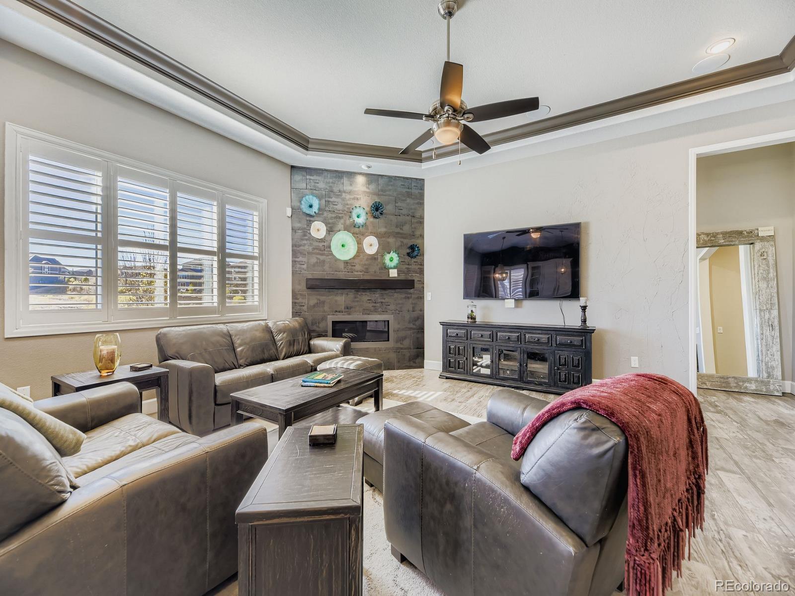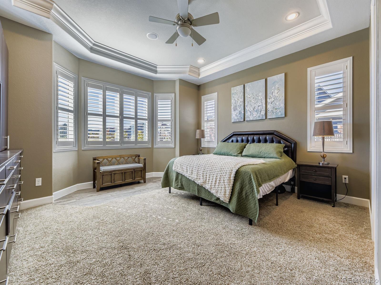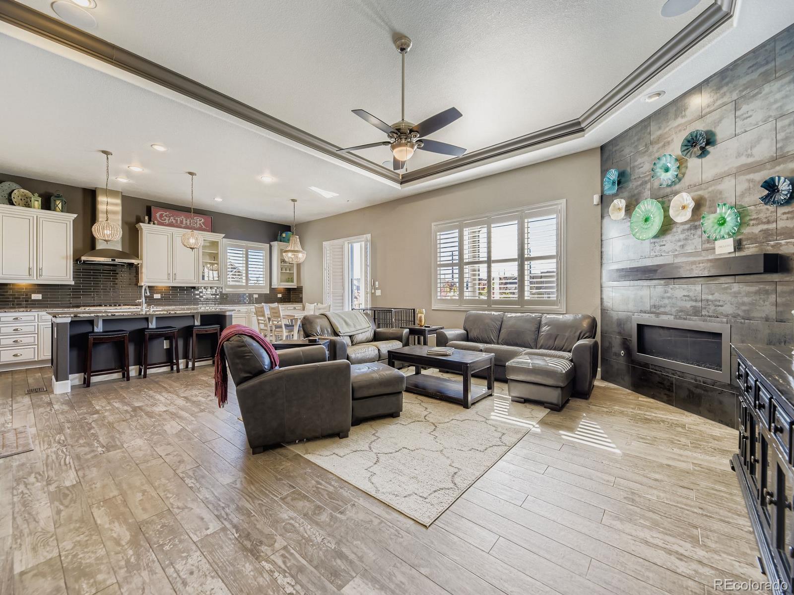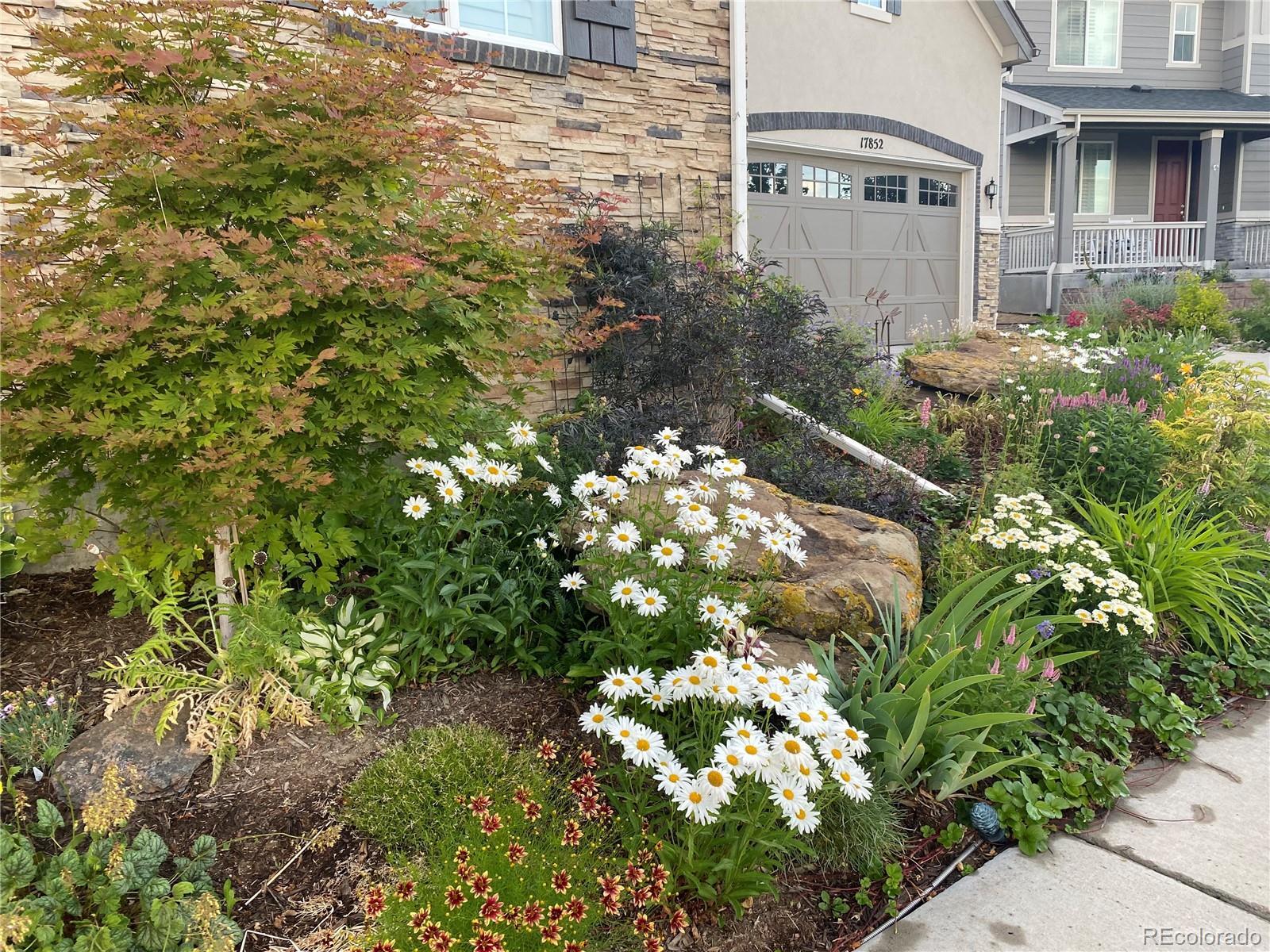 This captivating ranch-style home is located in Overlook at Cherry Creek with over 3600 sf finished. The upgrades in this home are unbelievable. As you enter the home the high ceilings and neutral paint make for a grand entrance to the large great room. Gas Fireplace, tiled floors, plantation shutters throughout home including garages. Tons of cabinetry, granite counter tops. SS appliances, gas stove, large walk-in pantry. Also, a tech area with lots of cabinetry and Corian countertops. Audio system throughout the home. The primary bedroom is large with built in dresser/cabinets. Large 5-piece master bathroom with a huge walk-in closet. The study has French doors with a wall of built in shelves. Two more large bedrooms, full bathroom and large laundry room (washer/dryer included). The Basement, WOW, over 1300 sf finished. A must see this incredible custom Bar with floating LED shelves, LED under bar and in ceiling, double drawer dishwasher, oven, 3 tap kegerator, ice maker, 2 under counter fridges, custom lighting over the bar. Large workout room equipment will stay. Dart board area. Shuffleboard included. mounted TV. The wine cellar, WOW, custom 547+ wine rack, all furniture stays in wine room. Custom angled track and swivel barn door heading to upper level. One more large bedroom and full bathroom in garden level basement. Over 1000 unfinished area in basement. Two car garage with custom floor coating, plantation shutters and third car garage with custom floor coating and plantation shutters. You must see the outdoor back custom covered deck with Trex flooring, with custom electric 3-sided blinds floor to ceiling, dry below deck so you can sit below, back yard is turf dog friendly. Front yard is xeriscape. Culligan water softener, Radon installed. New roof 2022 when deck was done. Super close to all that Downtown Parker has to offer. Great location to view 4th of July fireworks. Closet access to I25/470.