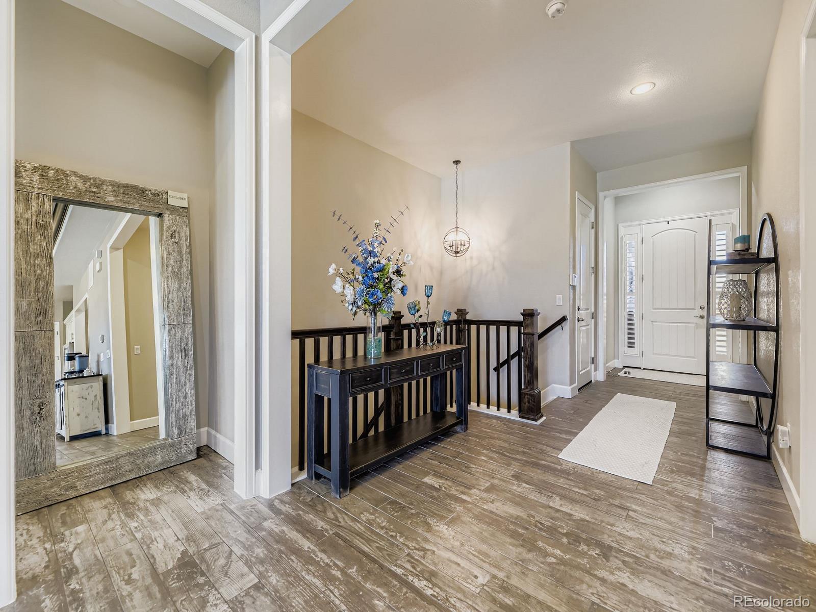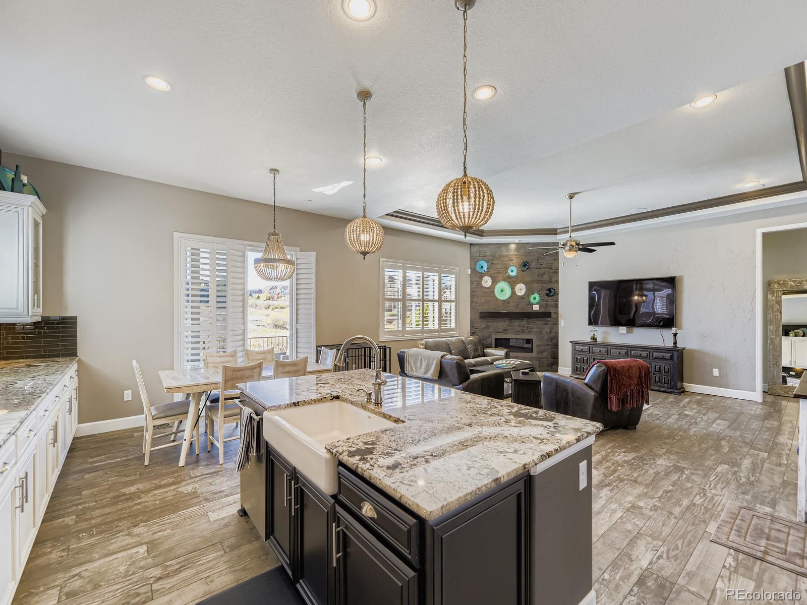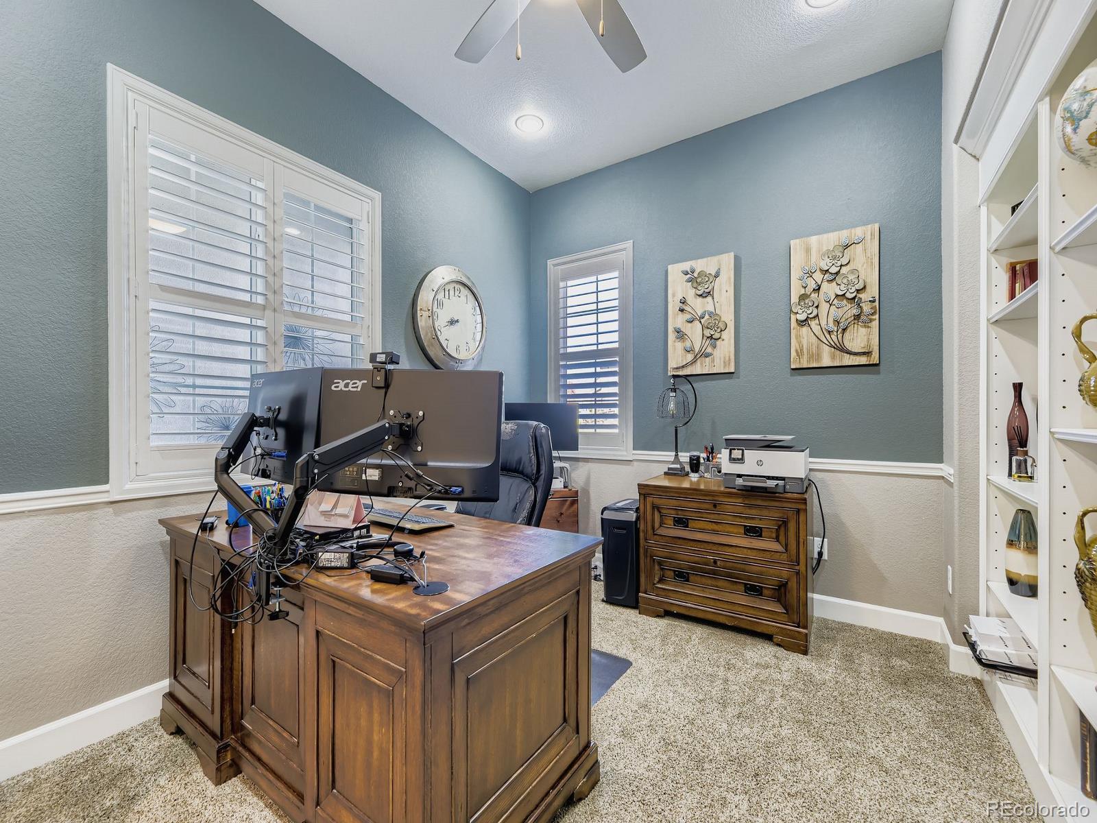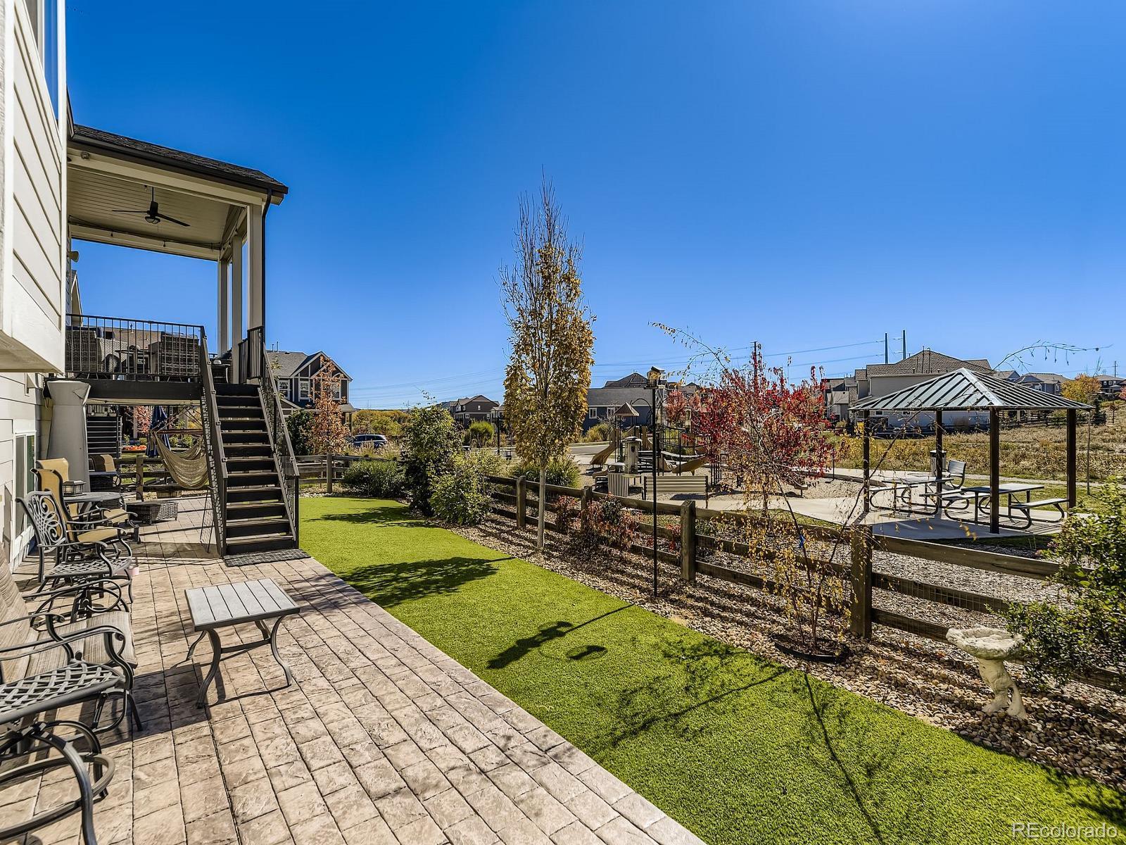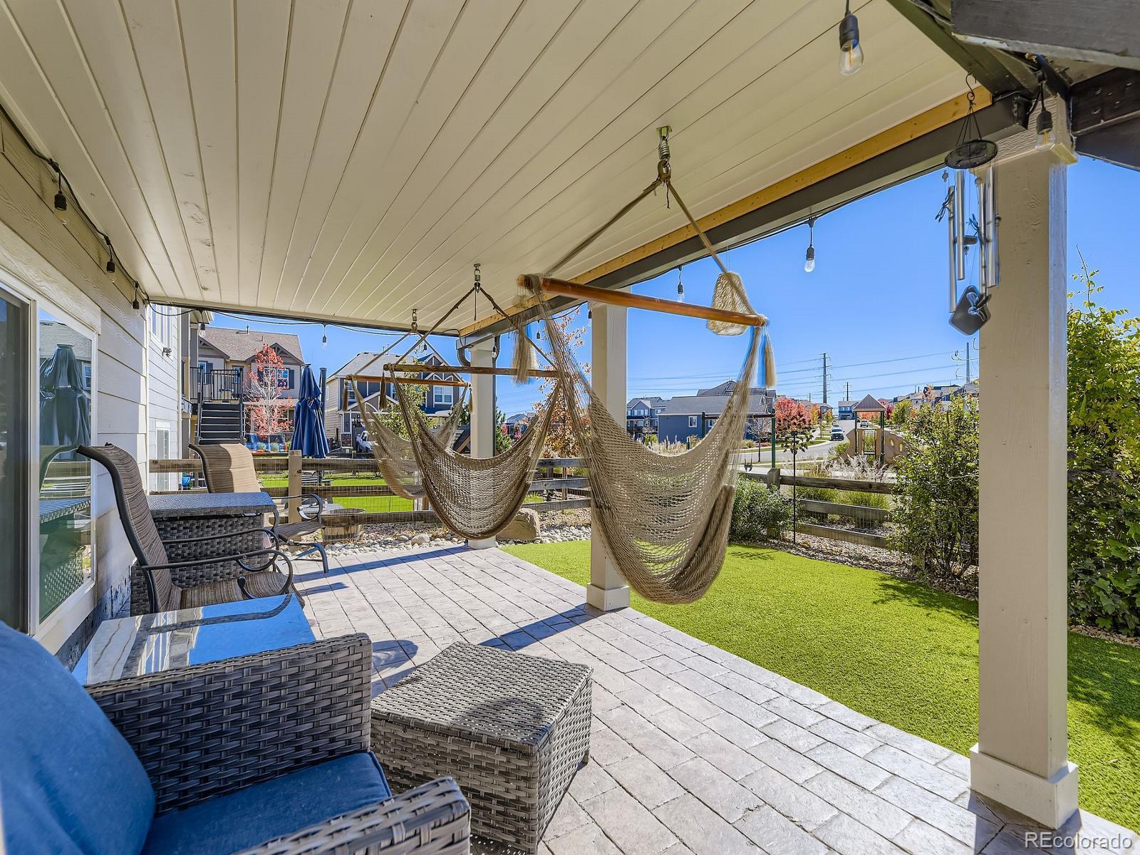 This captivating ranch-style home is located in Overlook at Cherry Creek with over 3600 sf finished. The upgrades in this home are unbelievable. As you enter the home the high ceilings and neutral paint make for a grand entrance to the large great room. Gas Fireplace, tiled floors, plantation shutters throughout home including garages. Tons of cabinetry, granite counter tops. SS appliances, gas stove, large walk-in pantry. Also, a tech area with lots of cabinetry and Corian countertops. Audio system throughout the home. The primary bedroom is large with built in dresser/cabinets. Large 5-piece master bathroom with a huge walk-in closet. The study has French doors with a wall of built in shelves. Two more large bedrooms, full bathroom and large laundry room (washer/dryer included). The Basement, WOW, over 1300 sf finished. A must see this incredible custom Bar with floating LED shelves, LED under bar and in ceiling, double drawer dishwasher, oven, 3 tap kegerator, ice maker, 2 under counter fridges, custom lighting over the bar. Large workout room equipment will stay. Dart board area. Shuffleboard included. mounted TV. The wine cellar, WOW, custom 547+ wine rack, all furniture stays in wine room. Custom angled track and swivel barn door heading to upper level. One more large bedroom and full bathroom in garden level basement. Over 1000 unfinished area in basement. Two car garage with custom floor coating, plantation shutters and third car garage with custom floor coating and plantation shutters. You must see the outdoor back custom covered deck with Trex flooring, with custom electric 3-sided blinds floor to ceiling, dry below deck so you can sit below, back yard is turf dog friendly. Front yard is xeriscape. Culligan water softener, Radon installed. New roof 2022 when deck was done. Super close to all that Downtown Parker has to offer. Great location to view 4th of July fireworks. Closet access to I25/470.