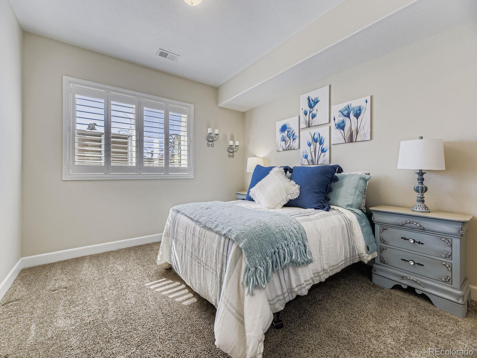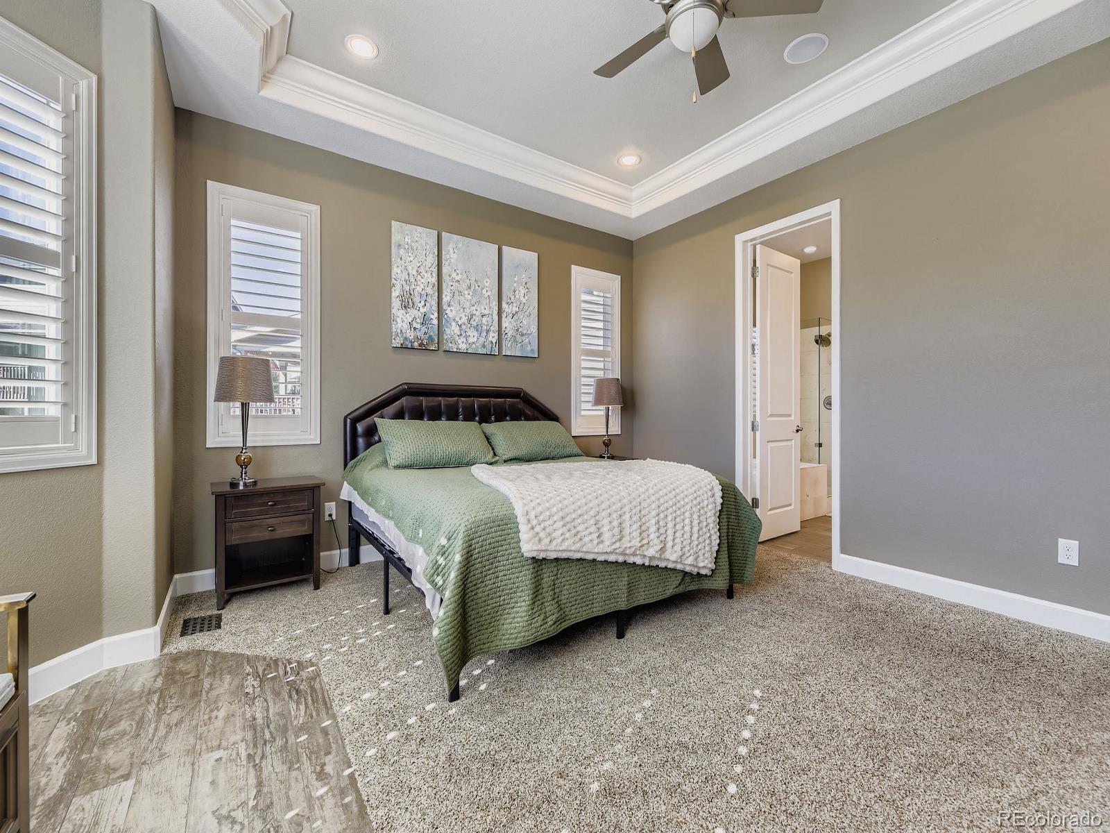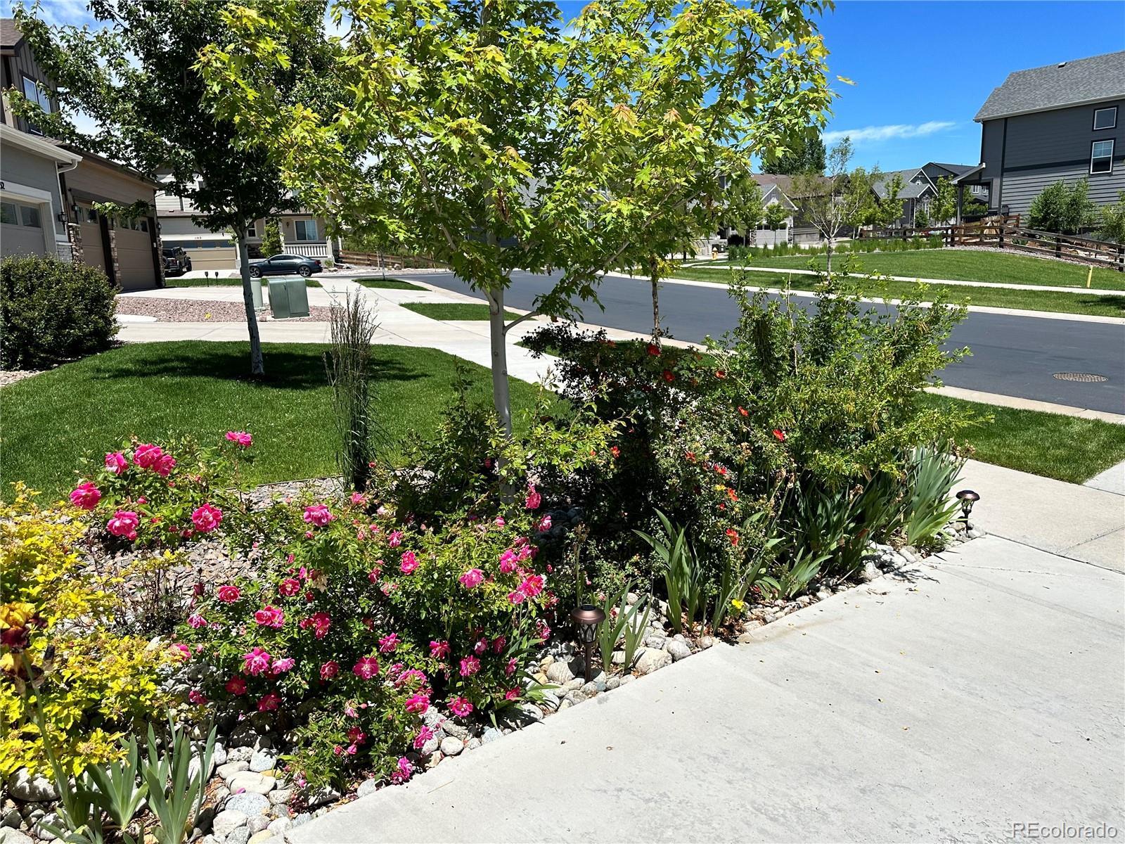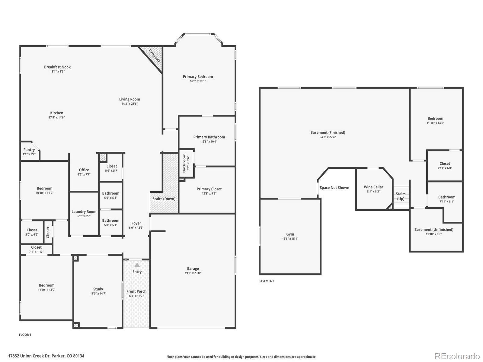 This captivating ranch-style home is located in Overlook at Cherry Creek with over 3600 sf finished. The upgrades in this home are unbelievable. As you enter the home the high ceilings and neutral paint make for a grand entrance to the large great room. Gas Fireplace, tiled floors, plantation shutters throughout home including garages. Tons of cabinetry, granite counter tops. SS appliances, gas stove, large walk-in pantry. Also, a tech area with lots of cabinetry and Corian countertops. Audio system throughout the home. The primary bedroom is large with built in dresser/cabinets. Large 5-piece master bathroom with a huge walk-in closet. The study has French doors with a wall of built in shelves. Two more large bedrooms, full bathroom and large laundry room (washer/dryer included). The Basement, WOW, over 1300 sf finished. A must see this incredible custom Bar with floating LED shelves, LED under bar and in ceiling, double drawer dishwasher, oven, 3 tap kegerator, ice maker, 2 under counter fridges, custom lighting over the bar. Large workout room equipment will stay. Dart board area. Shuffleboard included. mounted TV. The wine cellar, WOW, custom 547+ wine rack, all furniture stays in wine room. Custom angled track and swivel barn door heading to upper level. One more large bedroom and full bathroom in garden level basement. Over 1000 unfinished area in basement. Two car garage with custom floor coating, plantation shutters and third car garage with custom floor coating and plantation shutters. You must see the outdoor back custom covered deck with Trex flooring, with custom electric 3-sided blinds floor to ceiling, dry below deck so you can sit below, back yard is turf dog friendly. Front yard is xeriscape. Culligan water softener, Radon installed. New roof 2022 when deck was done. Super close to all that Downtown Parker has to offer. Great location to view 4th of July fireworks. Closet access to I25/470.
