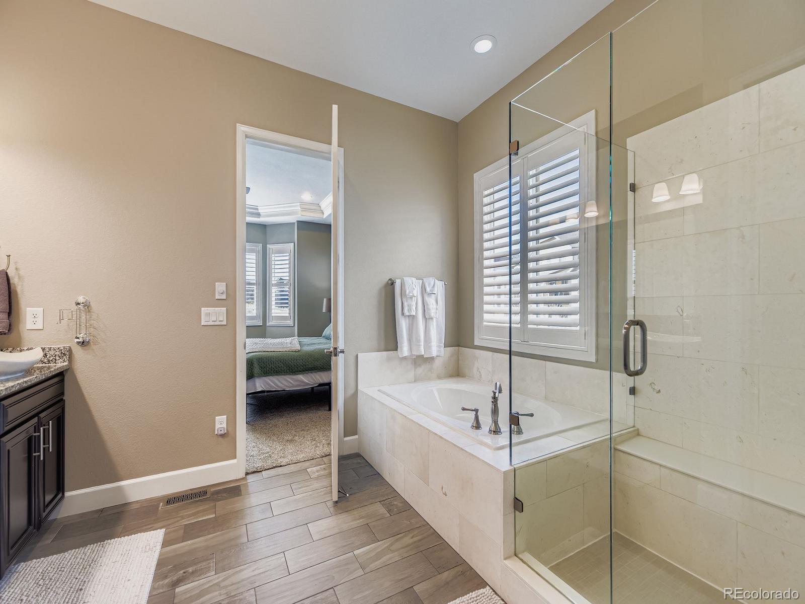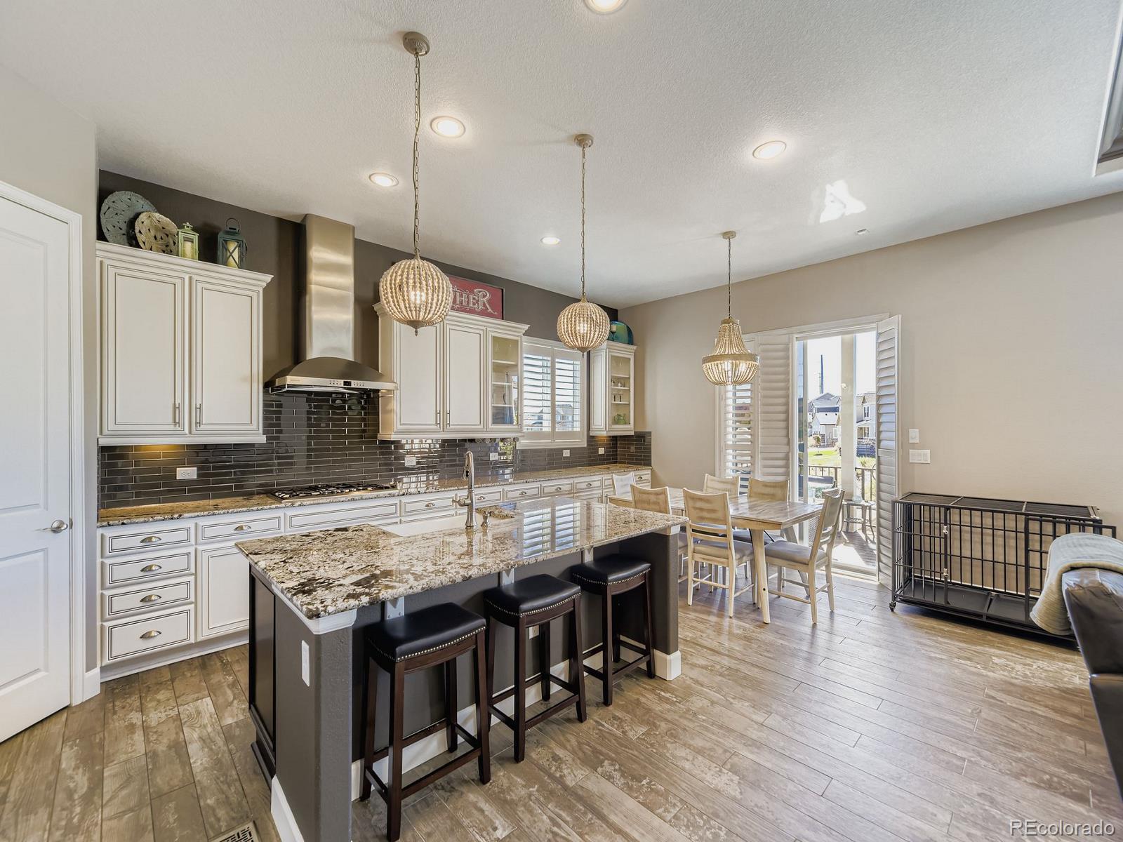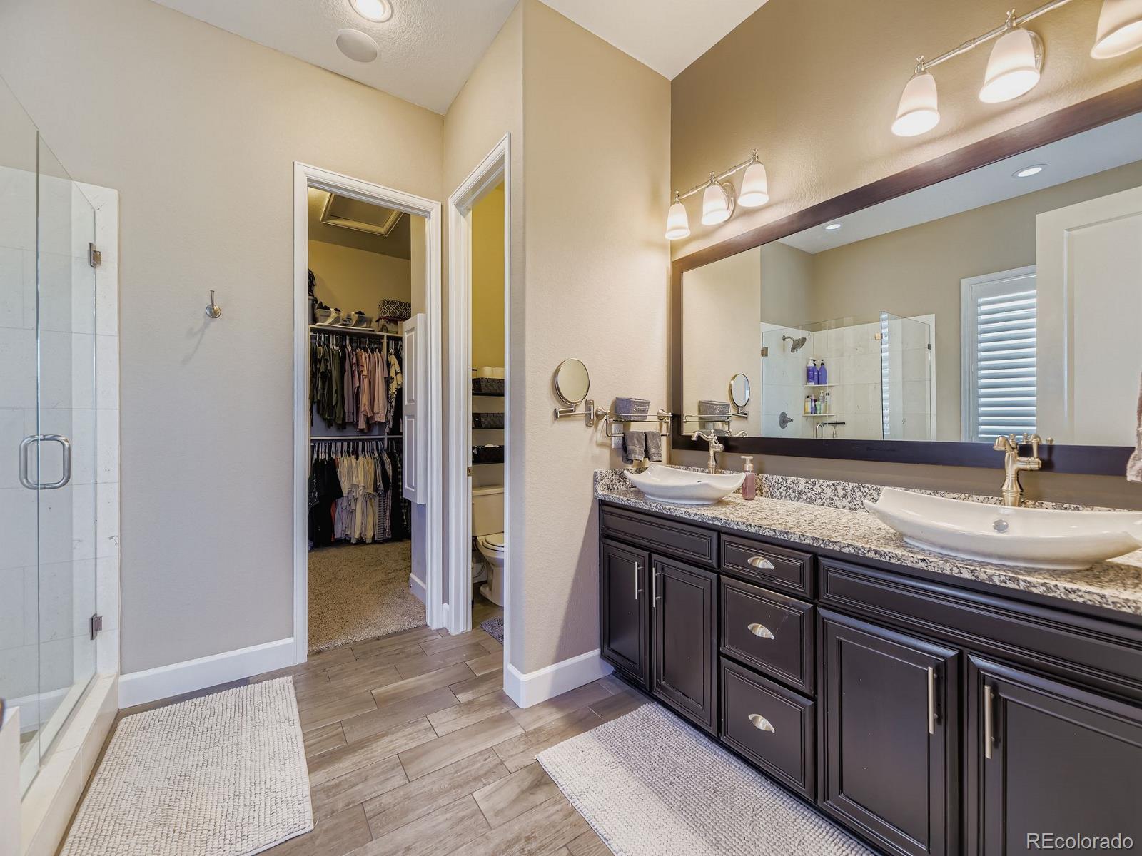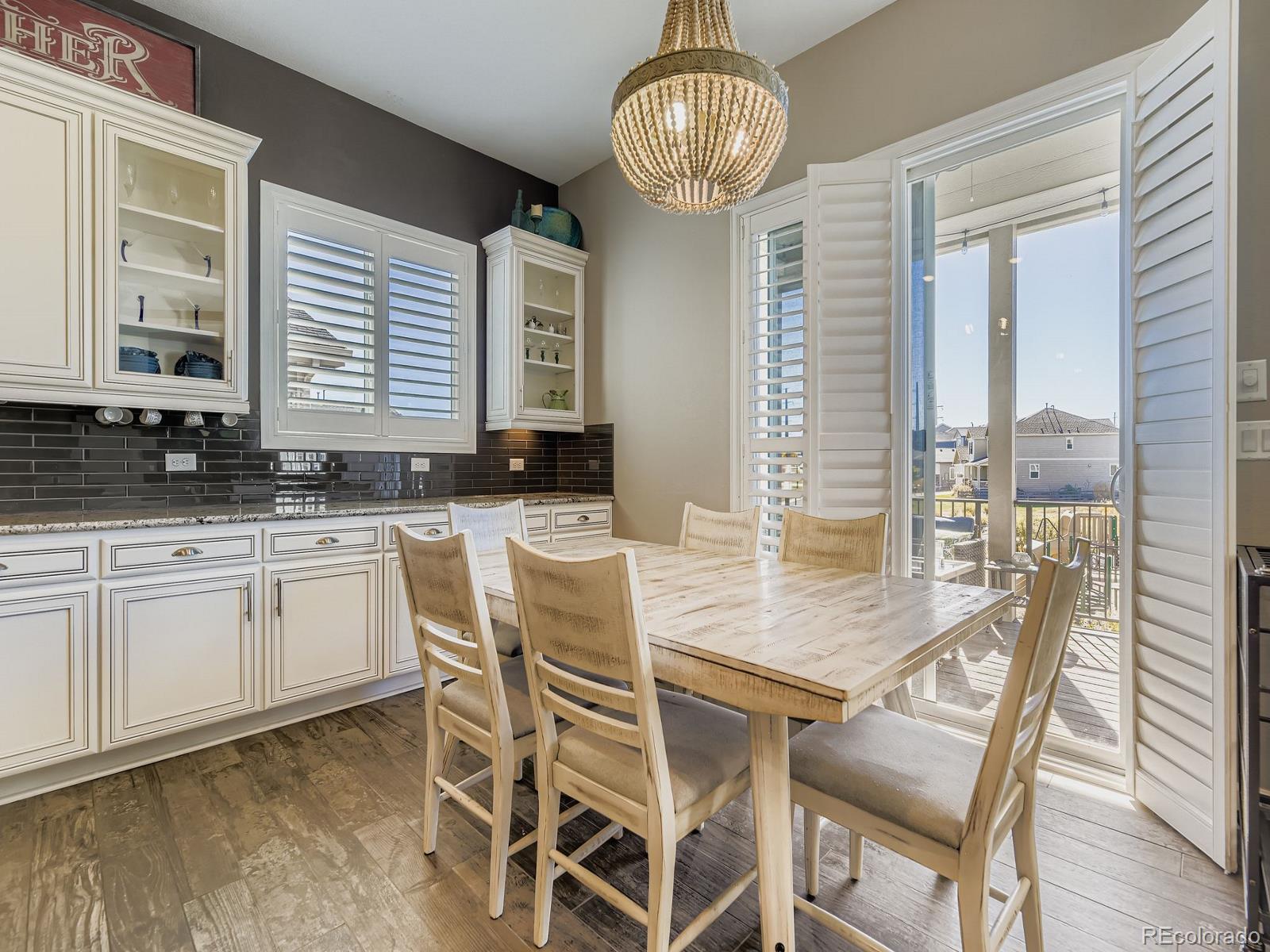 This captivating ranch-style home is located in Overlook at Cherry Creek with over 3600 sf finished. The upgrades in this home are unbelievable. As you enter the home the high ceilings and neutral paint make for a grand entrance to the large great room. Gas Fireplace, tiled floors, plantation shutters throughout home including garages. Tons of cabinetry, granite counter tops. SS appliances, gas stove, large walk-in pantry. Also, a tech area with lots of cabinetry and Corian countertops. Audio system throughout the home. The primary bedroom is large with built in dresser/cabinets. Large 5-piece master bathroom with a huge walk-in closet. The study has French doors with a wall of built in shelves. Two more large bedrooms, full bathroom and large laundry room (washer/dryer included). The Basement, WOW, over 1300 sf finished. A must see this incredible custom Bar with floating LED shelves, LED under bar and in ceiling, double drawer dishwasher, oven, 3 tap kegerator, ice maker, 2 under counter fridges, custom lighting over the bar. Large workout room equipment will stay. Dart board area. Shuffleboard included. mounted TV. The wine cellar, WOW, custom 547+ wine rack, all furniture stays in wine room. Custom angled track and swivel barn door heading to upper level. One more large bedroom and full bathroom in garden level basement. Over 1000 unfinished area in basement. Two car garage with custom floor coating, plantation shutters and third car garage with custom floor coating and plantation shutters. You must see the outdoor back custom covered deck with Trex flooring, with custom electric 3-sided blinds floor to ceiling, dry below deck so you can sit below, back yard is turf dog friendly. Front yard is xeriscape. Culligan water softener, Radon installed. New roof 2022 when deck was done. Super close to all that Downtown Parker has to offer. Great location to view 4th of July fireworks. Closet access to I25/470.