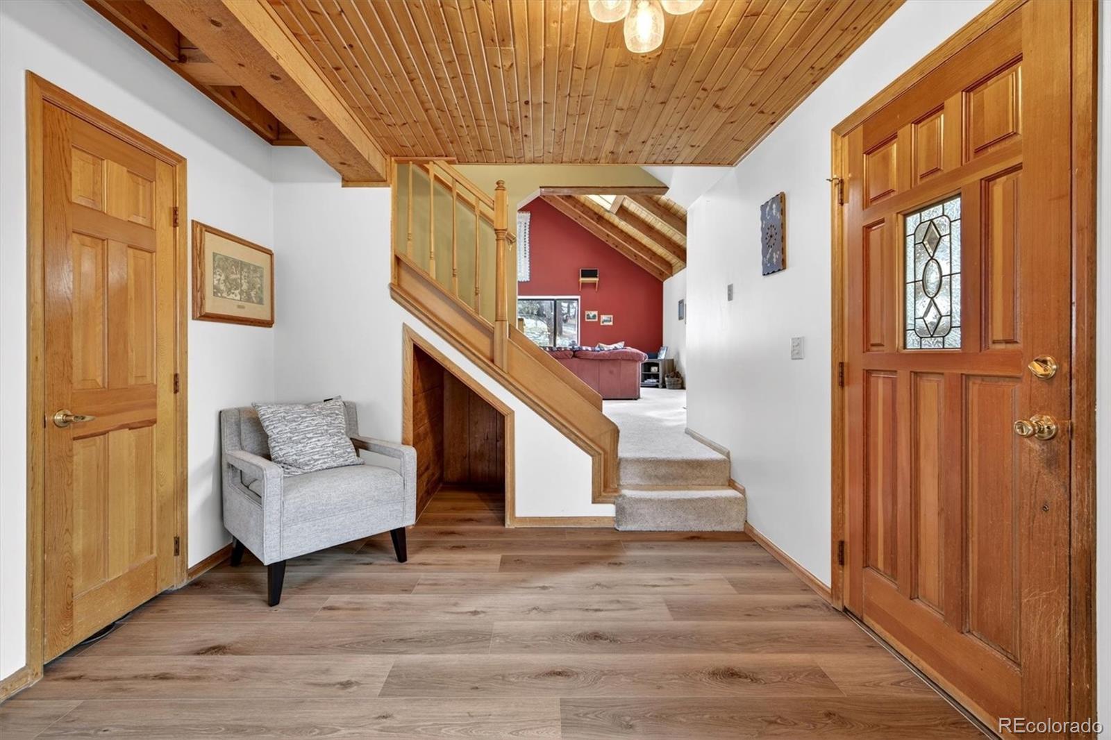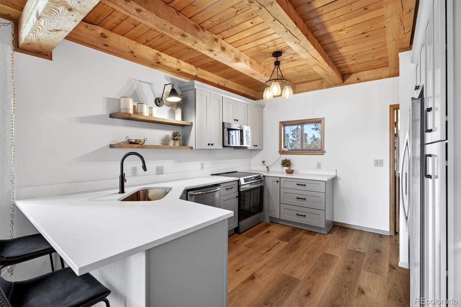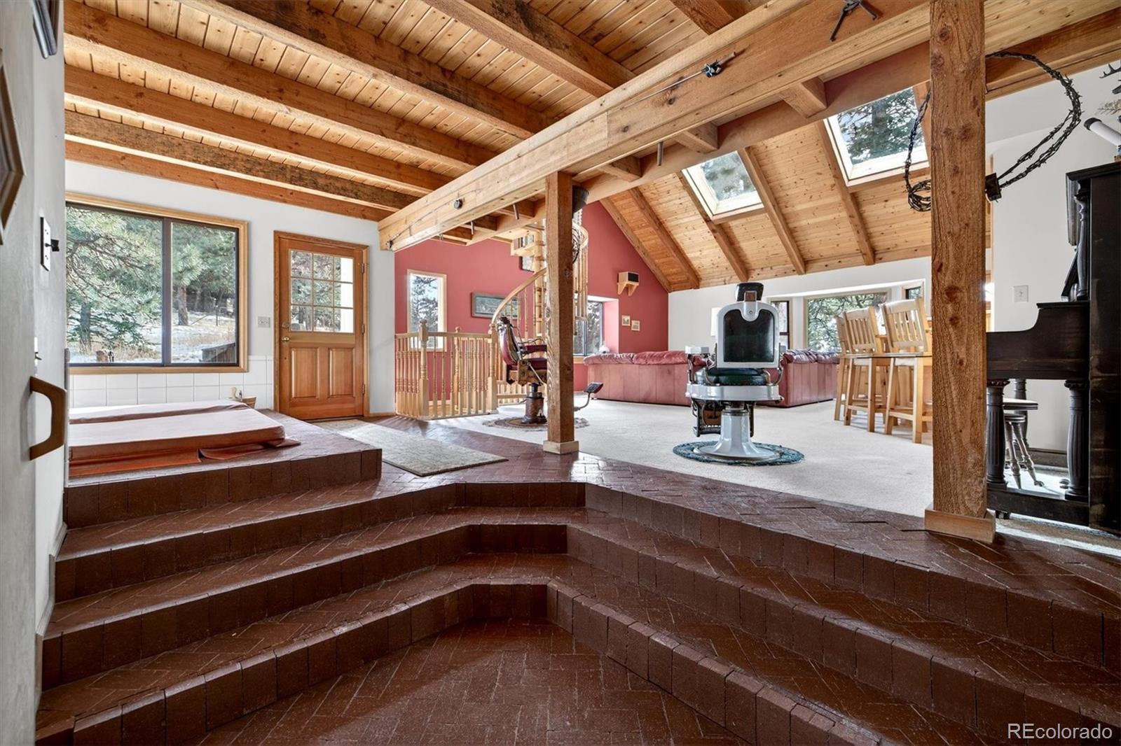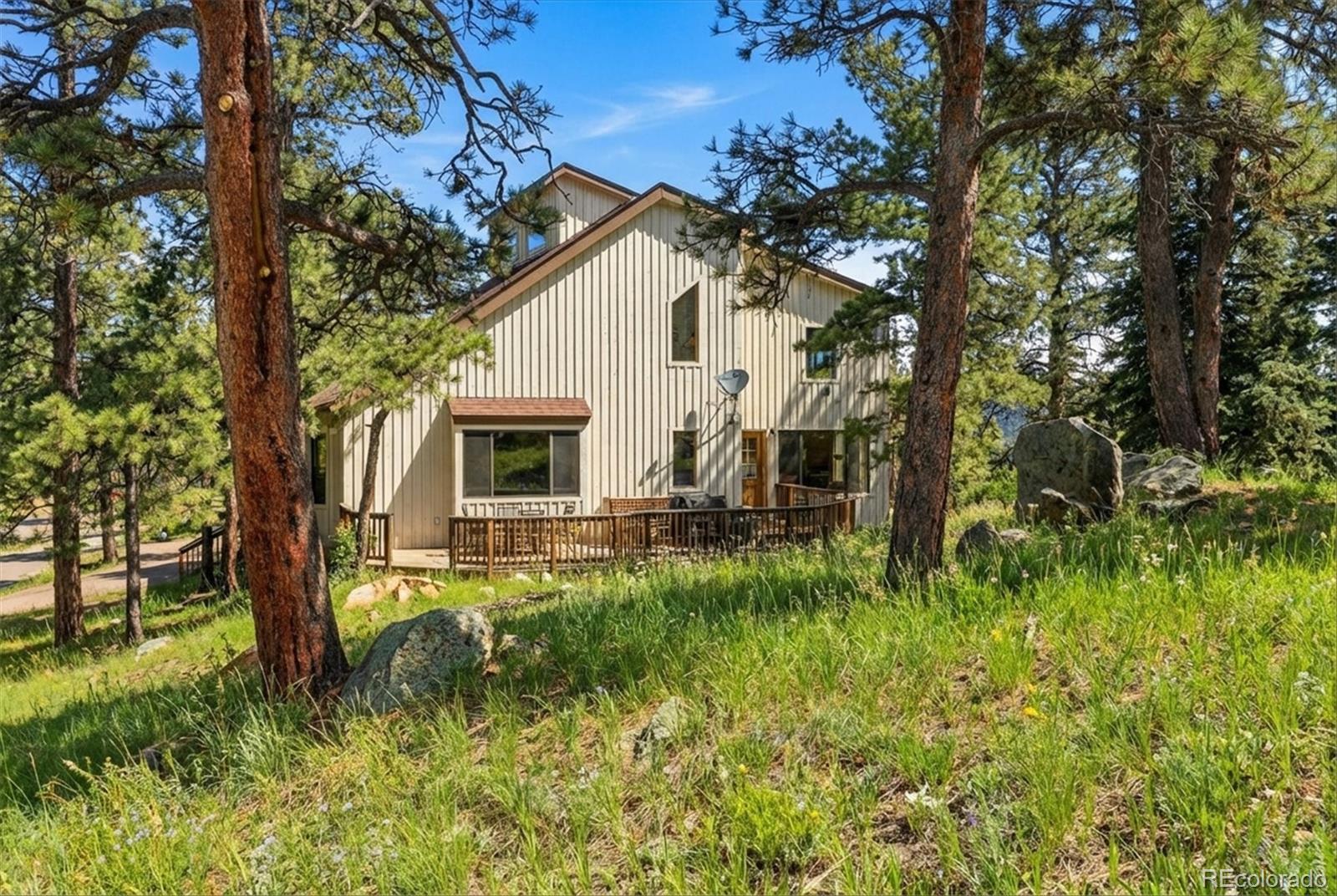 **Stunning mountain retreat with sweeping views and exceptional privacy.** This light-filled home features an open floor plan designed to capture the scenery from every angle. The kitchen and dining area are anchored by a charming wood-burning stove and feature durable, stylish LVP flooring that flows through the kitchen, dining space, and remodeled main-floor bathroom creating a cohesive and low-maintenance living area. The remodeled kitchen showcases stainless steel appliances, quartz countertops, and modern finishes, while the updated main-floor bathroom adds both style and convenience. The expansive living room offers a dramatic entertainment area complete with a wet bar perfect for hosting gatherings or relaxing after a day outdoors. The primary suite includes a private deck to take in the peaceful surroundings and breathtaking sunsets. Enjoy spa-like amenities with a hot tub and sauna, plus upstairs washer and dryer hookups for added flexibility. The home also offers excellent potential to add one or two additional bedrooms, making it ideal for future expansion. Recent improvements include a new well pump and piping. A $7,500 carpet allowance and $7,500 deck allowance allow buyers to personalize the space to their taste. Surrounded by abundant wildlife and close to miles of hiking trails, this private setting feels worlds away while remaining just 10 minutes from Home Depot and Walmart and only 15 minutes to Lakewood. A rare blend of tranquility, views, and convenience this is Colorado living at its best. **Some photos AI enhanced. Some photos are AI generated to show possible additional bedroom configuration. Buyers are advised to independently verify all information, including but not limited to; sq. ft., features, specs, condition, inclusions, taxes, utilities, lot size, permits, zoning requirements, and any specific use considerations.