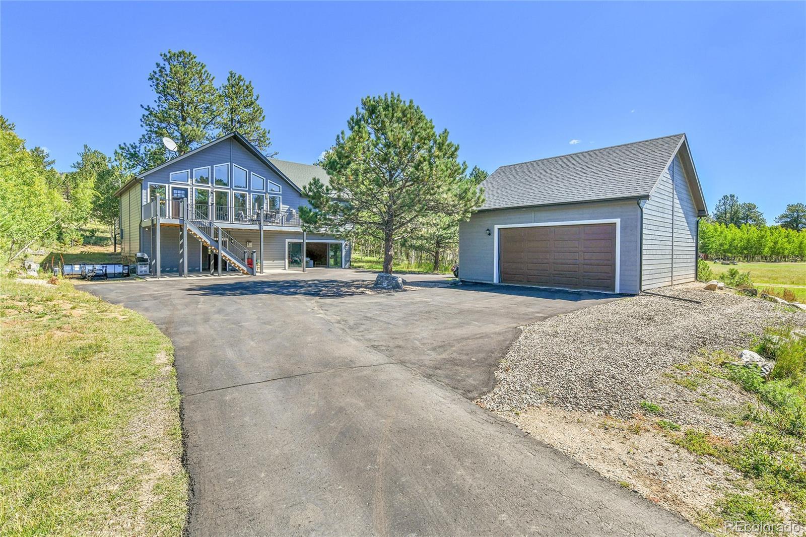 Welcome home to this raised ranch in sought-after Elk Creek Highlands! This exceptional 3-bed, 3-bath home features a spacious main floor primary suite with a five-piece bathroom and a large walk-in closet. The open and inviting living, dining, and kitchen areas showcase tall vaulted ceilings, large windows framing mountain views, and recently refinished oak floors. The brand-new kitchen is a showstopper, complete with new cabinets, new quartz countertops, and a waterfall island. A second family room provides plenty of space for entertaining and endless light with large sliding glass doors. The exterior complements a brand-new oversized 2-car garage. Step outside onto either of your two decks—one bathed in sunlight at the front, and another overlooking an Aspen grove in the backyard. Additional perks include two sheds for storage and community amenities such as horse stables and a stocked lake. Experience mountain living at its finest, with numerous nearby hikes and easy access to the national forest. Make this Elk Creek Highlands home your sanctuary!