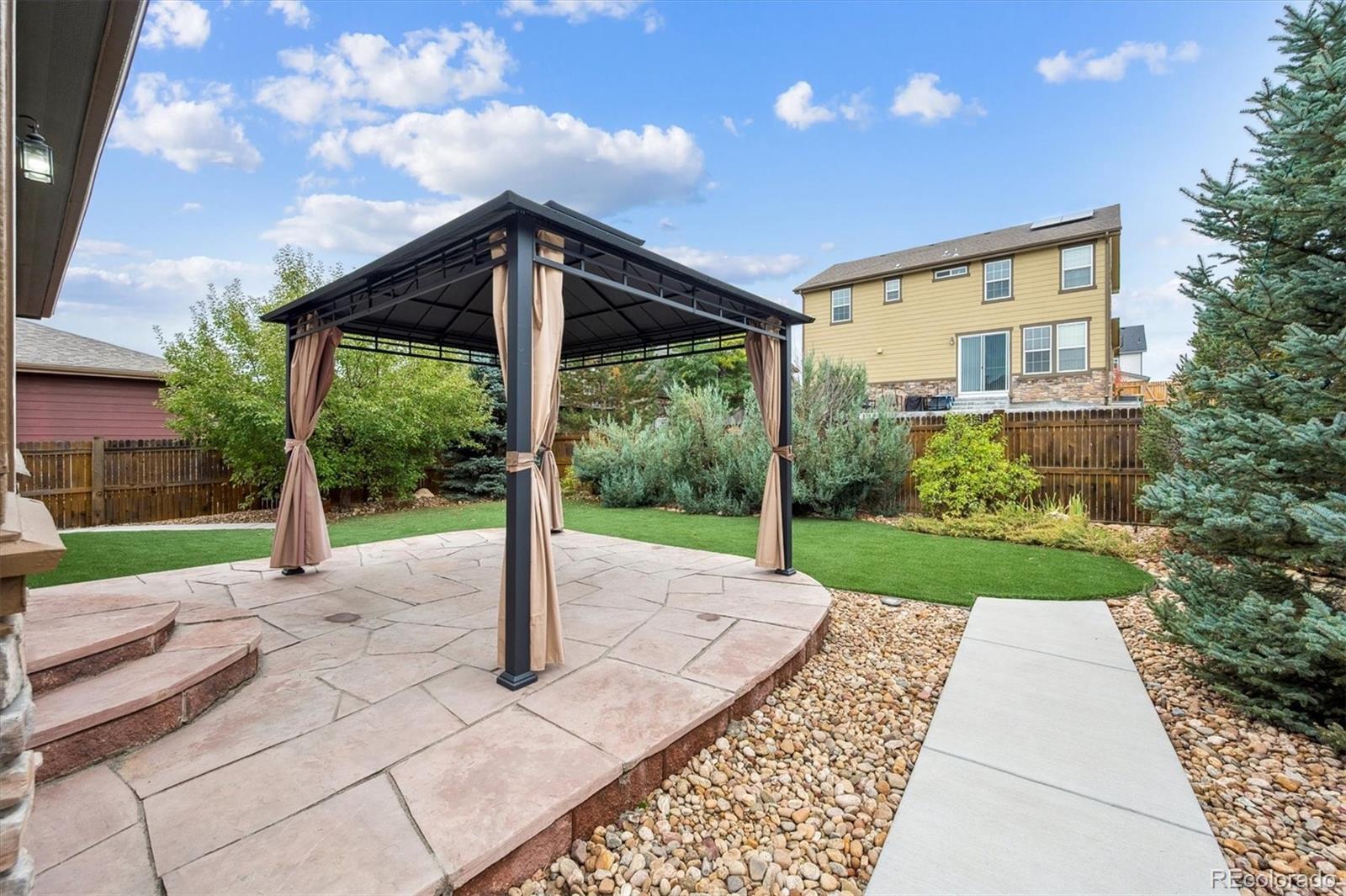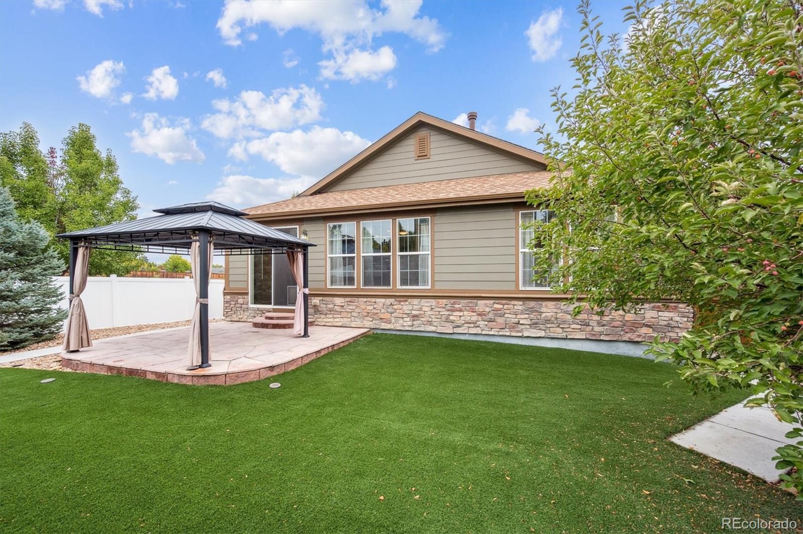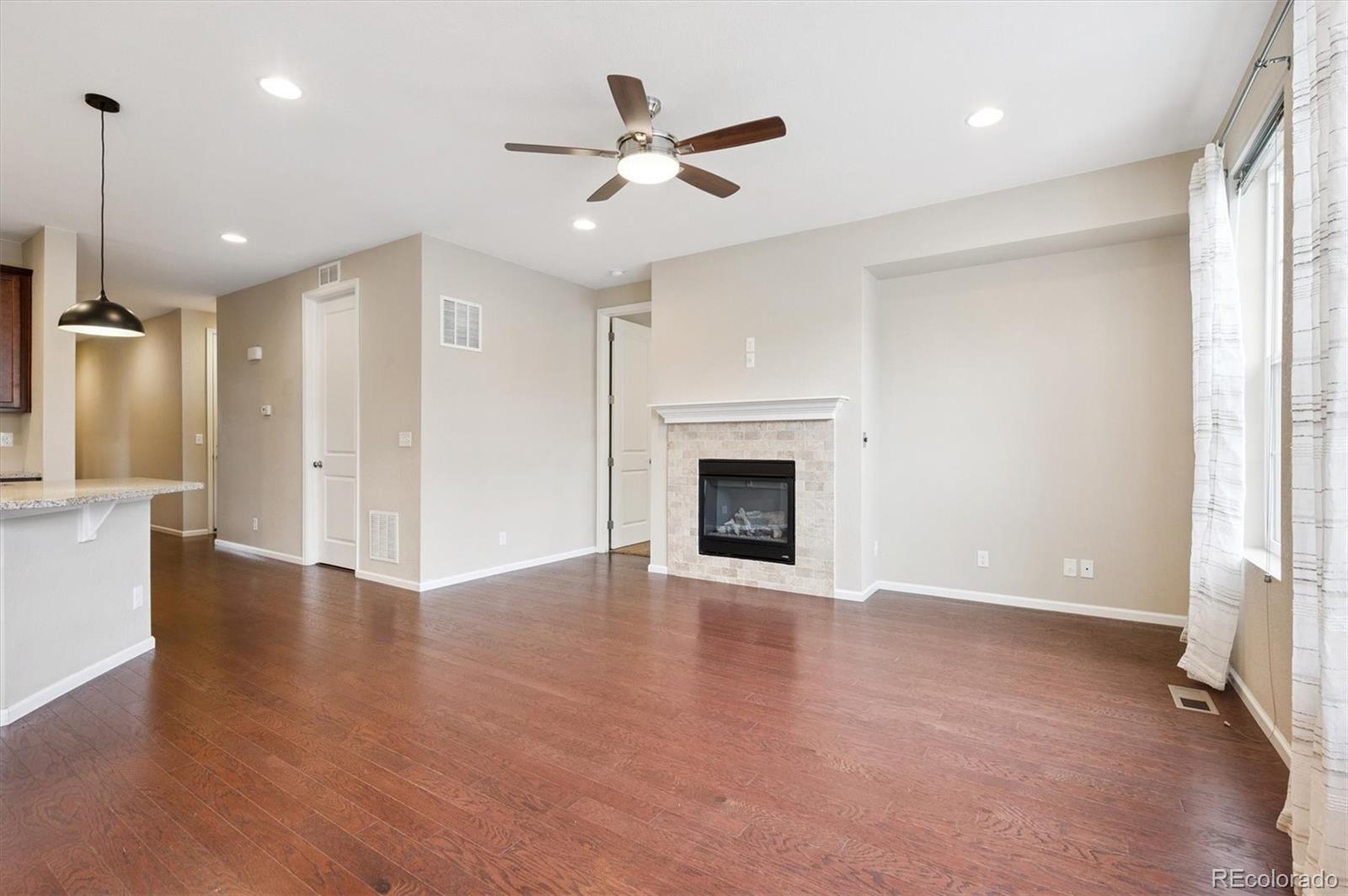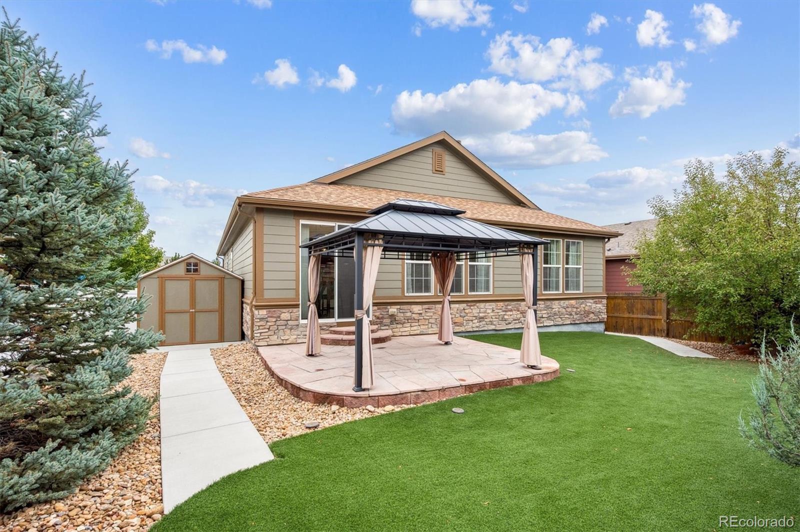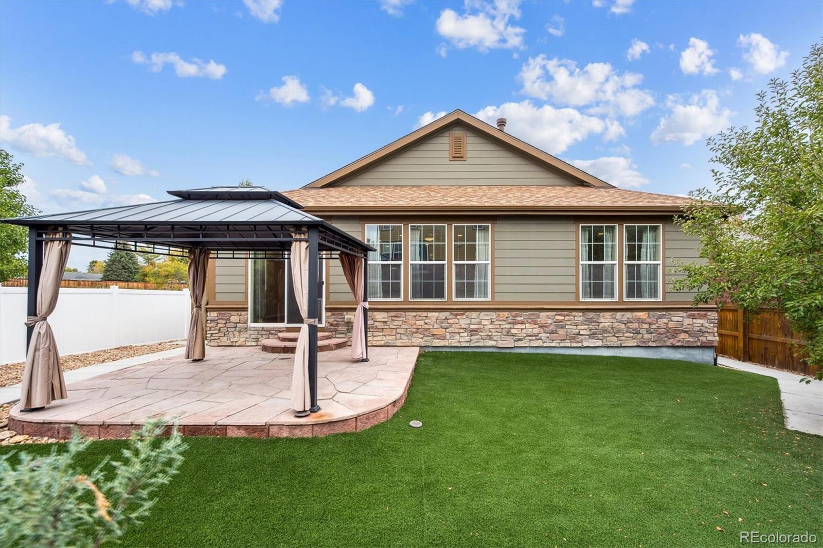 Welcome to this beautifully maintained ranch-style home in the desirable Iliff Commons neighborhood of Aurora — ideally located near Buckley AFB and just minutes from Tower Road for convenient access to shopping, dining, and major routes. Step inside to discover high ceilings and hardwood flooring flowing throughout the main living areas. The living room is filled with natural light and features a cozy fireplace with a mantel, creating a warm and inviting atmosphere. The kitchen is a true highlight with a gas stove, recessed lighting, an eat-in island, a pantry, and updated light fixtures, offering both style and functionality for the home chef. The primary bedroom serves as a private retreat with soft carpet flooring, a standing glass shower, dual-sink vanity, linen closet, and a walk-in closet. The secondary bedrooms also feature cozy carpet and plenty of natural light, ideal for guests, family, or a home office. The unfinished basement with 9-foot ceilings provides endless potential for future expansion — perfect for a gym, rec room, or additional living space. Outside, enjoy a professionally landscaped, fully fenced backyard featuring low-maintenance turf and a pergola, perfect for outdoor entertaining and relaxation. Additional highlights include paid-off solar panels for energy efficiency, a newer roof for peace of mind, and updated fixtures throughout. Home inclusions feature the washer and dryer, security cameras, and a front doorbell camera for added convenience and safety. This home perfectly combines comfort, charm, and modern living in a prime Iliff Commons location close to parks, trails, and key commuter routes.