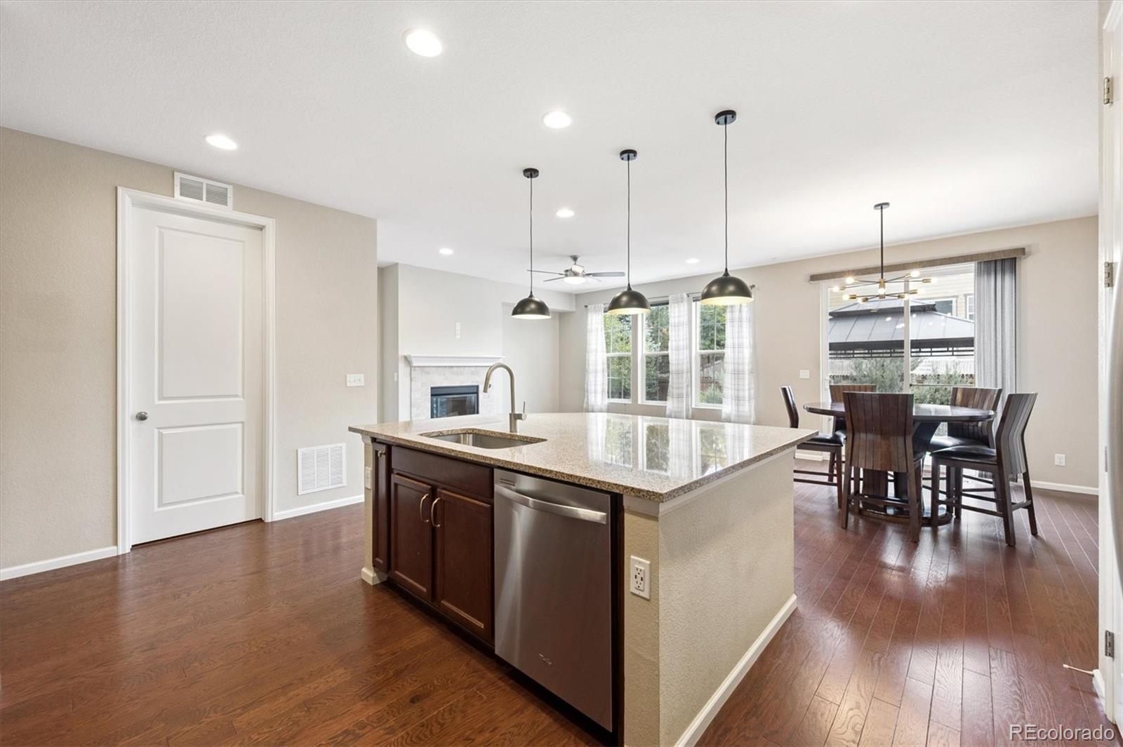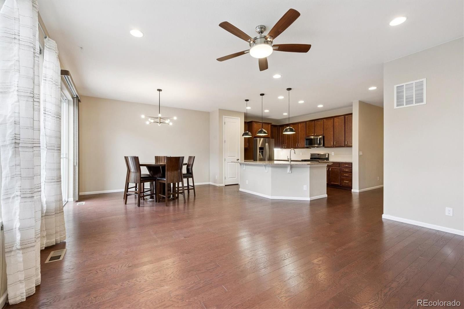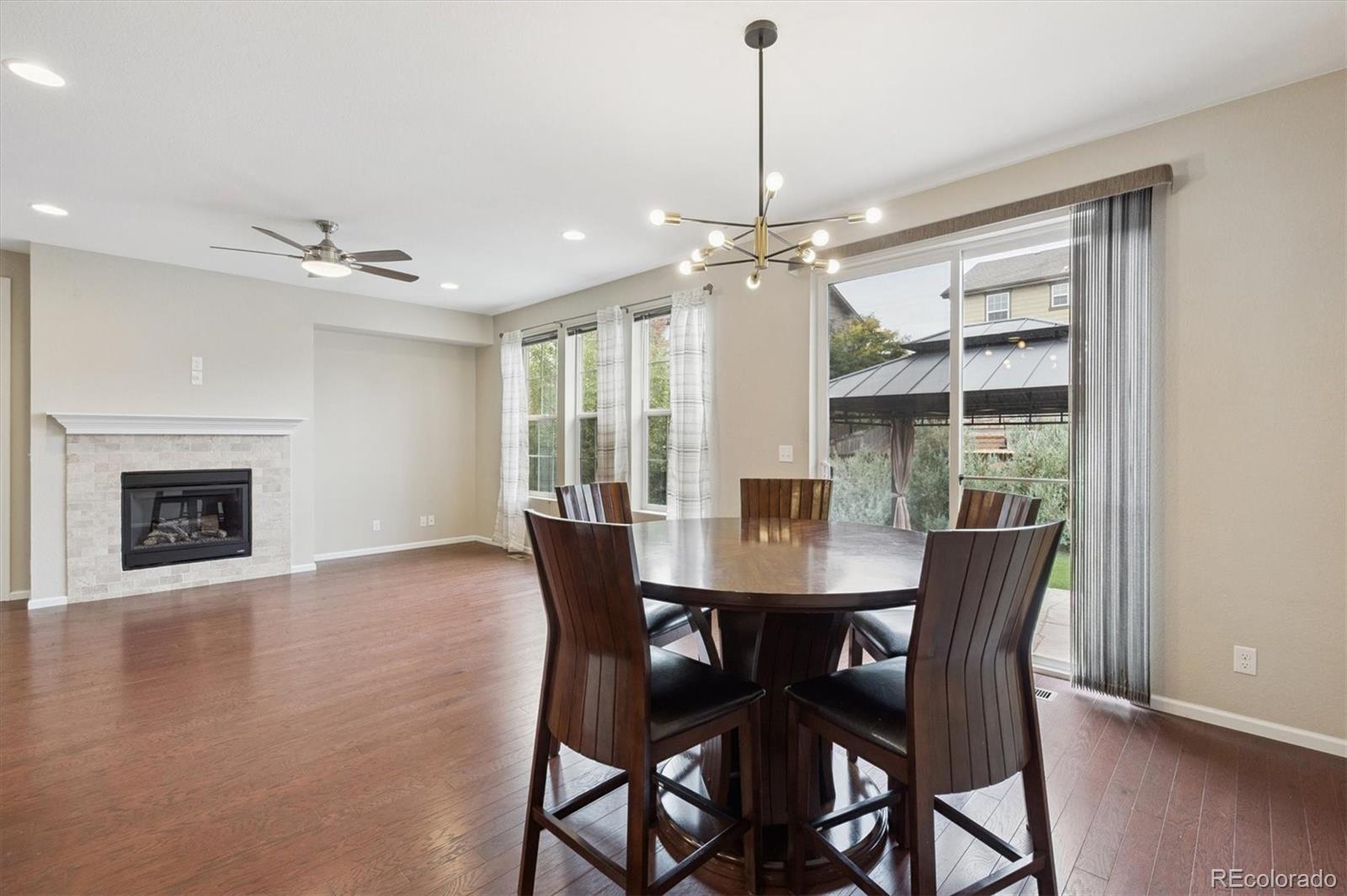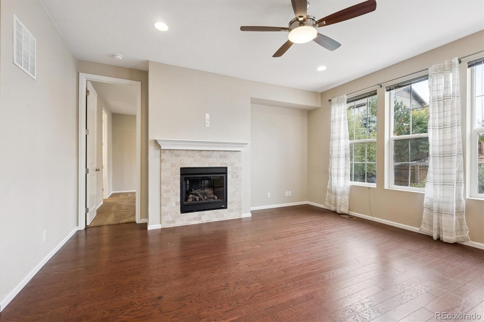 Welcome to this beautifully maintained ranch-style home in the desirable Iliff Commons neighborhood of Aurora — ideally located near Buckley AFB and just minutes from Tower Road for convenient access to shopping, dining, and major routes. Step inside to discover high ceilings and hardwood flooring flowing throughout the main living areas. The living room is filled with natural light and features a cozy fireplace with a mantel, creating a warm and inviting atmosphere. The kitchen is a true highlight with a gas stove, recessed lighting, an eat-in island, a pantry, and updated light fixtures, offering both style and functionality for the home chef. The primary bedroom serves as a private retreat with soft carpet flooring, a standing glass shower, dual-sink vanity, linen closet, and a walk-in closet. The secondary bedrooms also feature cozy carpet and plenty of natural light, ideal for guests, family, or a home office. The unfinished basement with 9-foot ceilings provides endless potential for future expansion — perfect for a gym, rec room, or additional living space. Outside, enjoy a professionally landscaped, fully fenced backyard featuring low-maintenance turf and a pergola, perfect for outdoor entertaining and relaxation. Additional highlights include paid-off solar panels for energy efficiency, a newer roof for peace of mind, and updated fixtures throughout. Home inclusions feature the washer and dryer, security cameras, and a front doorbell camera for added convenience and safety. This home perfectly combines comfort, charm, and modern living in a prime Iliff Commons location close to parks, trails, and key commuter routes.