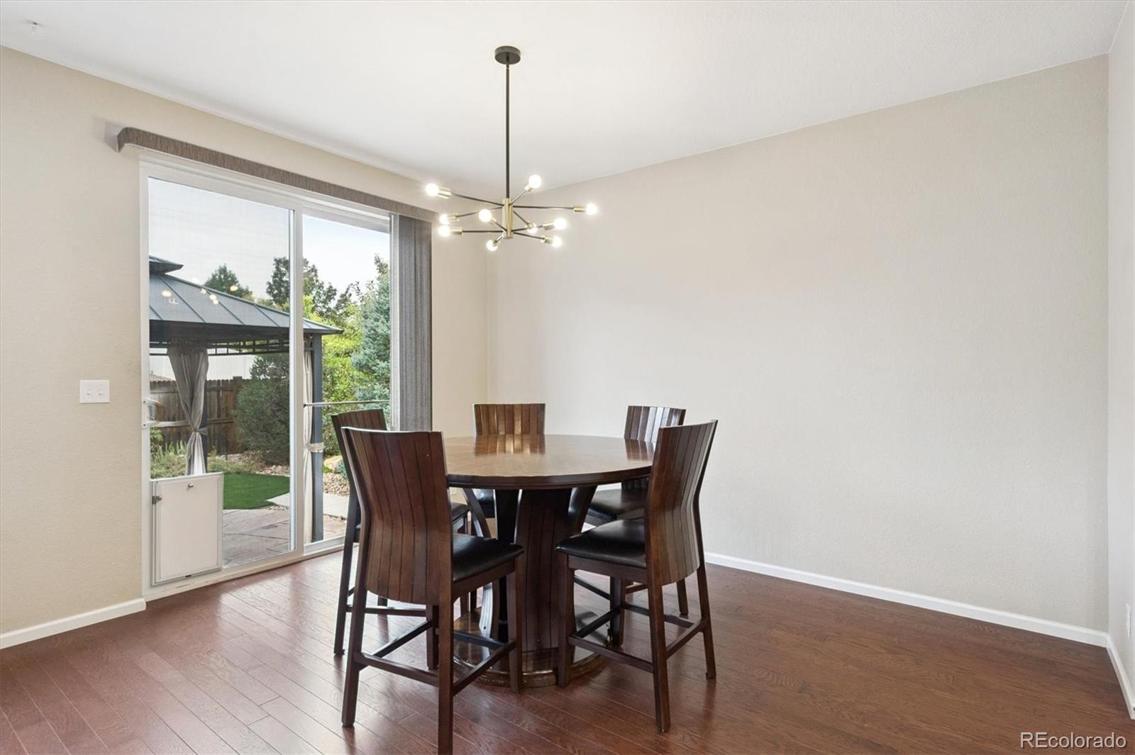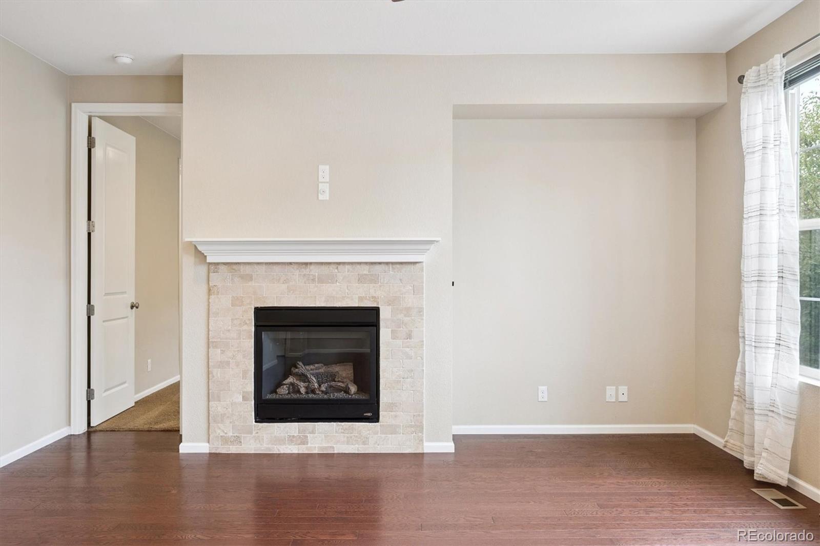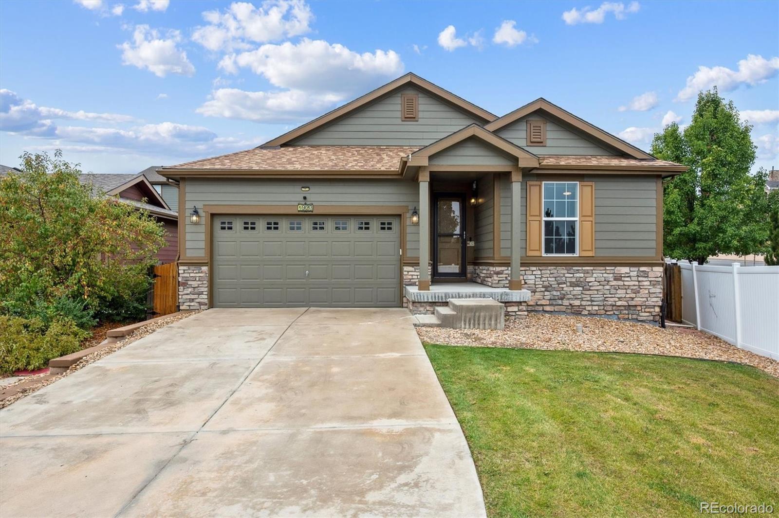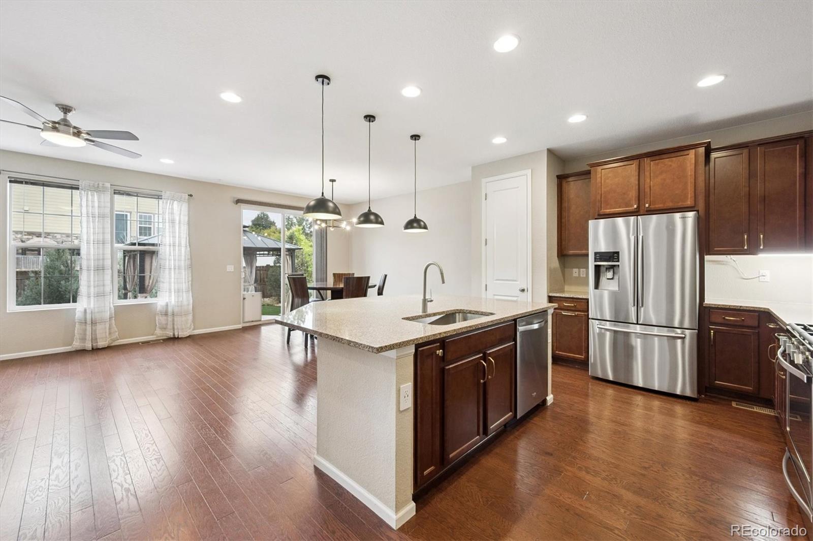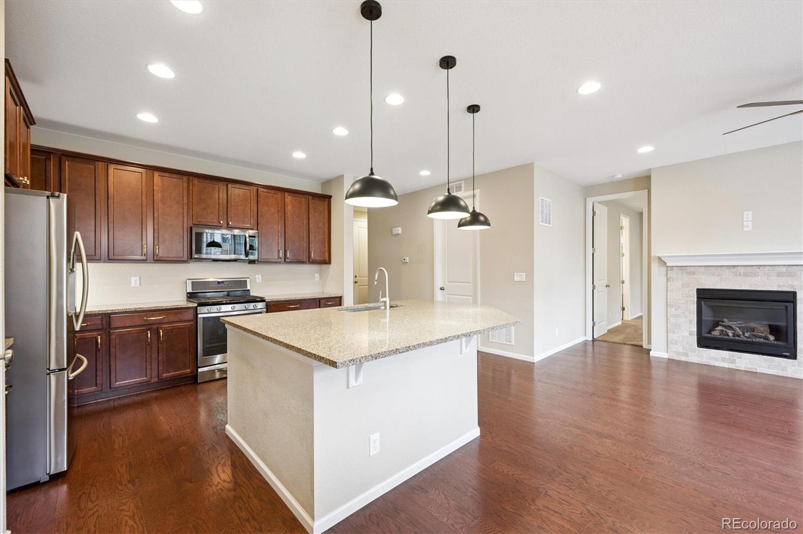 Welcome to this beautifully maintained ranch-style home in the desirable Iliff Commons neighborhood of Aurora — ideally located near Buckley AFB and just minutes from Tower Road for convenient access to shopping, dining, and major routes. Step inside to discover high ceilings and hardwood flooring flowing throughout the main living areas. The living room is filled with natural light and features a cozy fireplace with a mantel, creating a warm and inviting atmosphere. The kitchen is a true highlight with a gas stove, recessed lighting, an eat-in island, a pantry, and updated light fixtures, offering both style and functionality for the home chef. The primary bedroom serves as a private retreat with soft carpet flooring, a standing glass shower, dual-sink vanity, linen closet, and a walk-in closet. The secondary bedrooms also feature cozy carpet and plenty of natural light, ideal for guests, family, or a home office. The unfinished basement with 9-foot ceilings provides endless potential for future expansion — perfect for a gym, rec room, or additional living space. Outside, enjoy a professionally landscaped, fully fenced backyard featuring low-maintenance turf and a pergola, perfect for outdoor entertaining and relaxation. Additional highlights include paid-off solar panels for energy efficiency, a newer roof for peace of mind, and updated fixtures throughout. Home inclusions feature the washer and dryer, security cameras, and a front doorbell camera for added convenience and safety. This home perfectly combines comfort, charm, and modern living in a prime Iliff Commons location close to parks, trails, and key commuter routes.