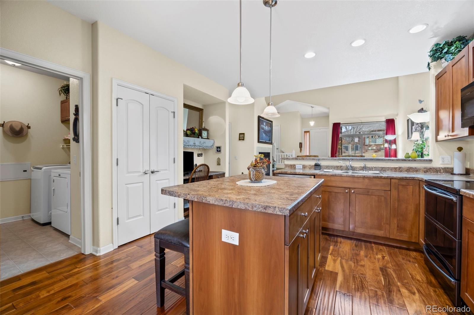 Meticulously cared for home in the coveted Gold Peak community of Highlands Ranch. This gated, resort-style neighborhood offers an exceptional lifestyle, and this home delivers charm, comfort, and thoughtful upgrades throughout. The inviting living room showcases a dramatic 20-foot cathedral ceiling, creating a bright, open, and welcoming atmosphere. Features include hand-scraped hardwood flooring, custom window coverings and draperies, and a cozy fireplace with tile surround—perfect for relaxing or entertaining. The chef’s kitchen is well-appointed with 42" alder cabinetry, a center island with pendant lighting and additional storage, a breakfast bar, planning station, and black and stainless appliances, including a newer range and microwave, refrigerator, and dishwasher. Convenient main-level laundry includes garage access, washer and dryer, overhead lighting, and a folding station. Upstairs, you’ll find two spacious bedrooms, a five-piece bath with chrome fixtures, alder cabinetry, soaking tub, separate shower, and vanity lighting. A versatile loft overlooks the living room and is complemented by a hobby room ideal for a home office, storage, or craft space. A rare and highly desirable feature, this property includes one of only thirty-two detached garages within the community, offering added convenience, security, and valuable additional storage. Enjoy gated, resort-style living with outstanding amenities including fitness facilities, basketball, tennis, pickleball, pools and hot tubs, locker rooms, HIIT room, racquetball, volleyball, baseball diamond, dog park, putting green, resident café, and more. Please visit our virtual tours for details: https://www.tourfactory.com/3234858. Call Ben for a private tour of the home and community. 720-232-0035.