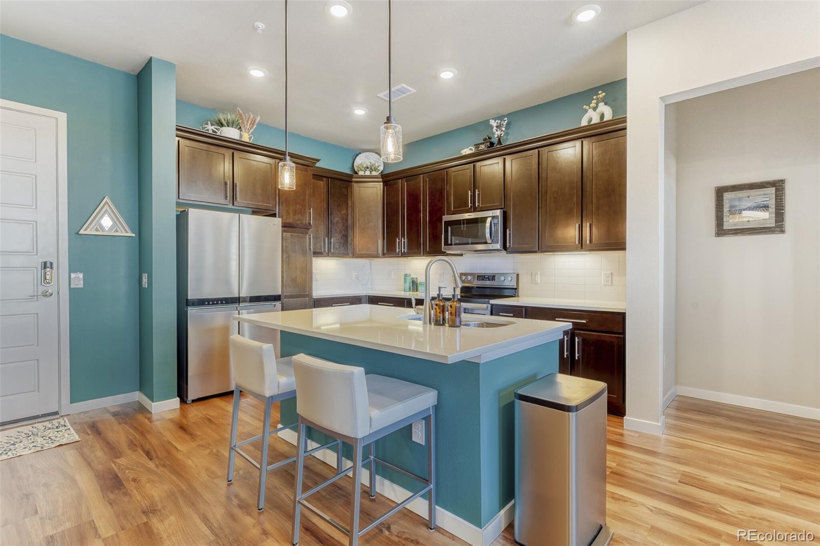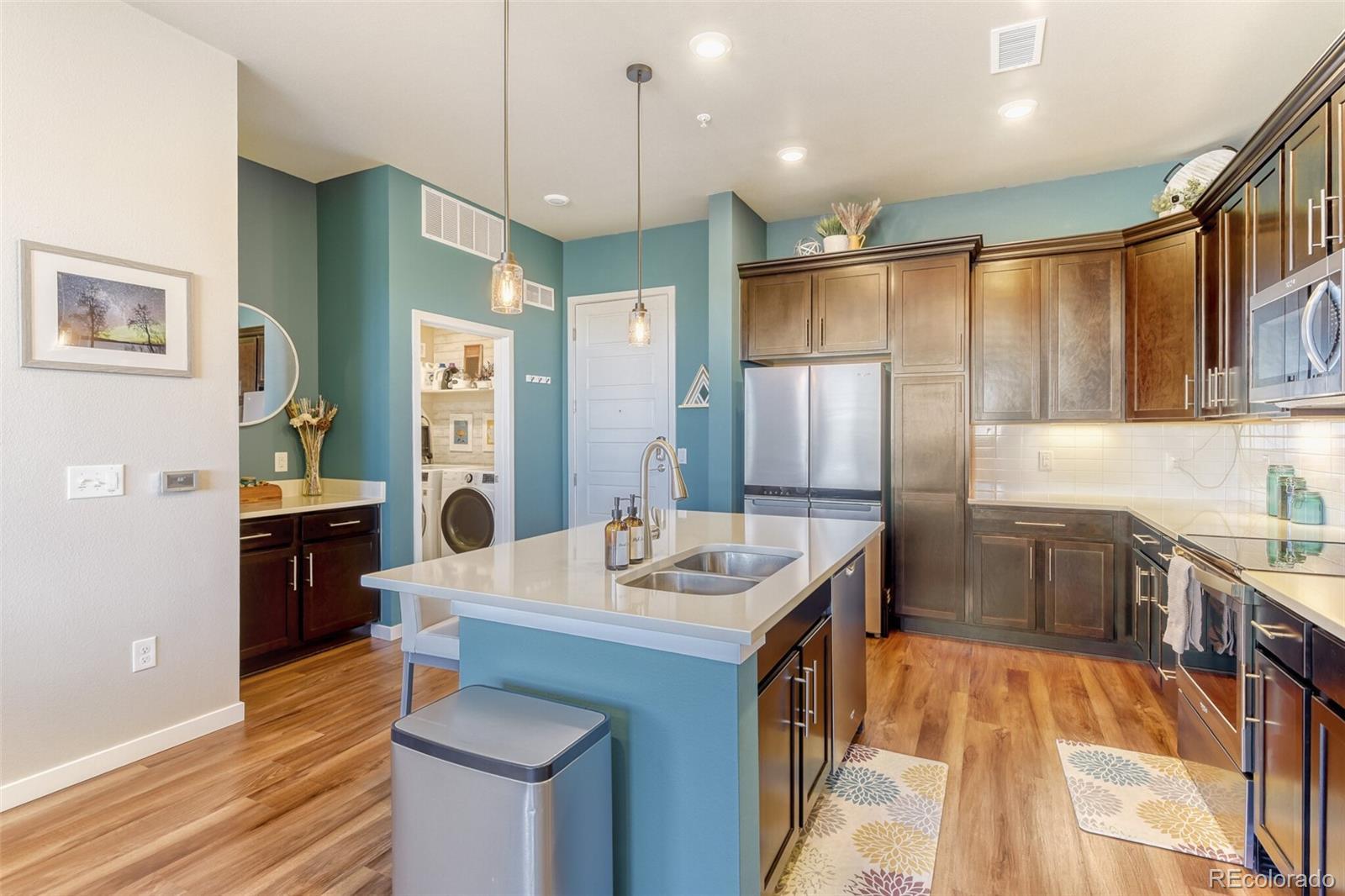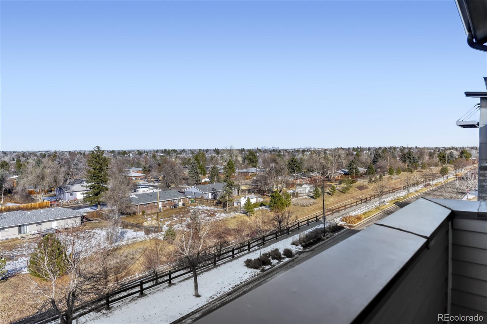 OPEN HOUSE SATURDAY 1/31 from 11AM–3PM. Welcome to Unit 407 - where space, light, and 180-degree views take center stage. Perched on the top floor with soaring 10-foot ceilings, this home offers dramatic vertical space you will notice the moment you walk in. Closets rise vertically and rooms feel expansive. The showstopper: incredible 180-degree views from every room and your private balcony. Take in the Front Range, Downtown Denver, and DTC skyline views — all from a north-facing unit that delivers breathtaking scenery. The kitchen strikes the perfect balance between refined and functional, featuring rich dark wood cabinetry, quartz countertops, stainless steel appliances, and abundant storage. Elegant cabinet crown molding adds a polished finish, while the open layout makes the space equally suited for both living and entertaining. New carpet makes this home truly move-in ready. Bathrooms feature custom mirror framing, and the layout flows effortlessly. This community also offers the convenience of a private on-site fitness center, making it easy to stay active without ever leaving home. Enjoy a deeded underground parking space, providing secure, weather-protected parking with easy access to your condominium. Location seals the deal - direct access to Downtown Denver or DTC, making this an ideal home base for work, play, and everything in between. The enclave you are in includes a park and restaurants (Bar Louie, Social, and Starbucks)! Your new home also provides access to walking and biking trails to High Line Canal. This is not just a condominium — it is a front-row seat to Colorado living. Come see it yourself! This condo also has its own Instagram profile so you can see more of that 180-degree view! Check it out: https://www.instagram.com/420efremont_407?igsh=djZ0ZTVpZ2NhcmMx