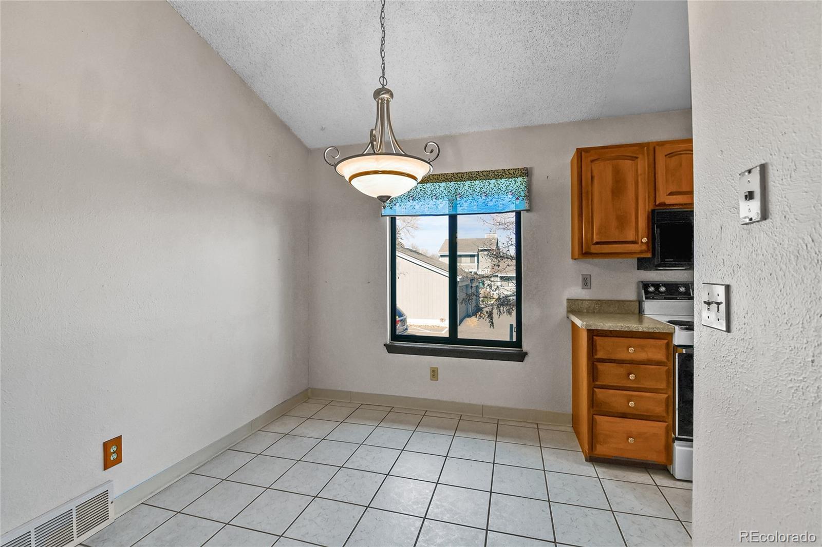 Lovingly cared for ranch-style end unit featuring a spacious, open floor plan with light-filled vaulted ceilings. This 3-bedroom, 2-bath home offers a rare combination of a private fenced yard, stamped concrete patio, detached garage, and an additional reserved parking space. Enjoy summer evenings overlooking the beautifully maintained greenbelt ideal for grilling, relaxing, and entertaining. The large kitchen includes abundant upgraded cabinetry, a pantry, all appliances, and a sunny breakfast nook. A formal dining room with a dramatic bay window opens to the bright living room featuring a cozy gas fireplace and vaulted ceilings. The generous primary suite includes a private bath, and the secondary bedrooms are nicely sized. The full, open basement provides exceptional space to expand or finish to your liking. A large laundry/utility room adds convenience and storage. This well-kept community offers extensive green space, a clubhouse, outdoor pool, tennis courts, playground, paved walking paths, and beautifully landscaped grounds surrounded by open space. Superb location with easy access to Standley Lake, schools, parks, trails, golf courses, shopping, dining, the Westminster Town Center, transit, and the mountains. Additional updates include a newer electrical panel and sewer line.