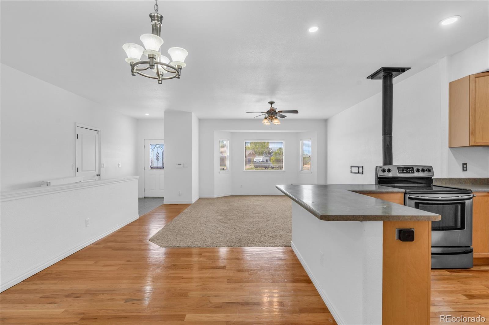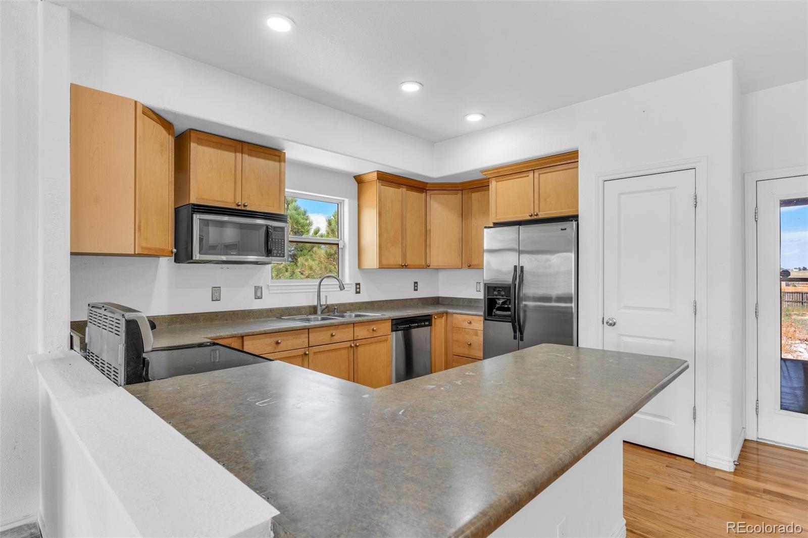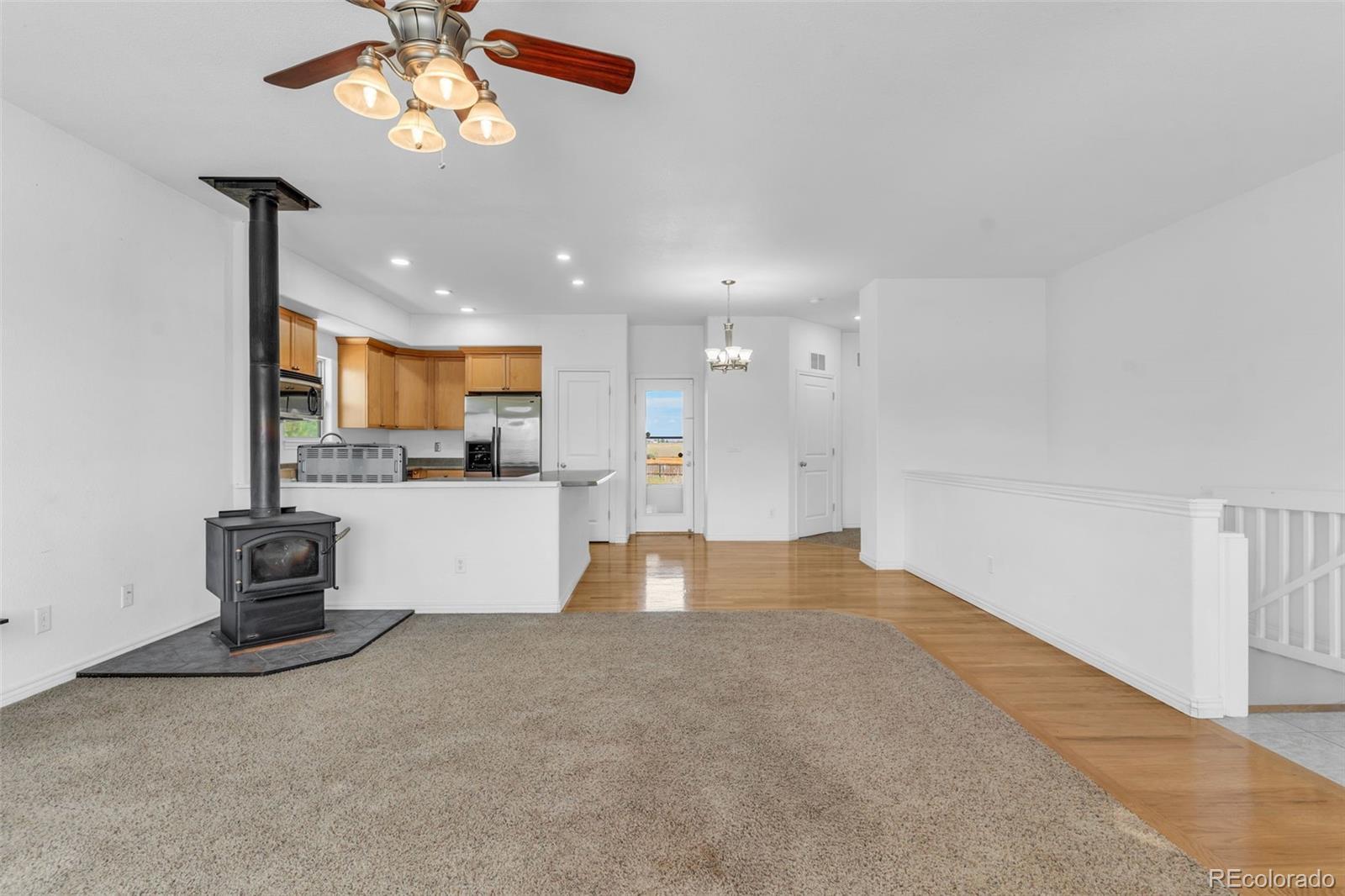 Spacious and inviting, this 4-bedroom, 3-bath ranch sits on a 1-acre corner lot and features a completely finished basement for added living space. The open-concept kitchen, dining, and living areas showcase beautiful wood floors and create a perfect flow for everyday living or entertaining. The main-level master suite offers comfort and convenience, while the fully fenced backyard is ideal for animals and outdoor enjoyment. A covered patio provides the perfect spot to relax, and parking is never an issue with the attached 3-car garage plus a massive 56x30 Cleary shop for vehicles, toys, or projects. Conveniently located near shopping and restaurants with easy access to I-25, this property offers both privacy and accessibility for commuters.