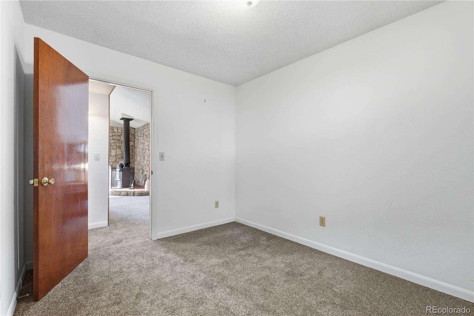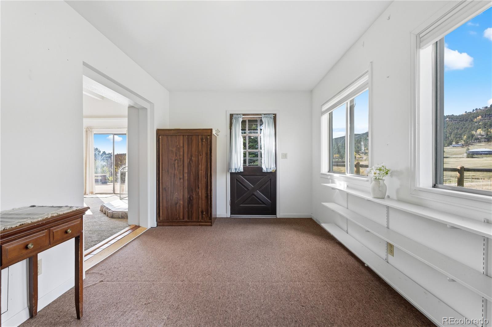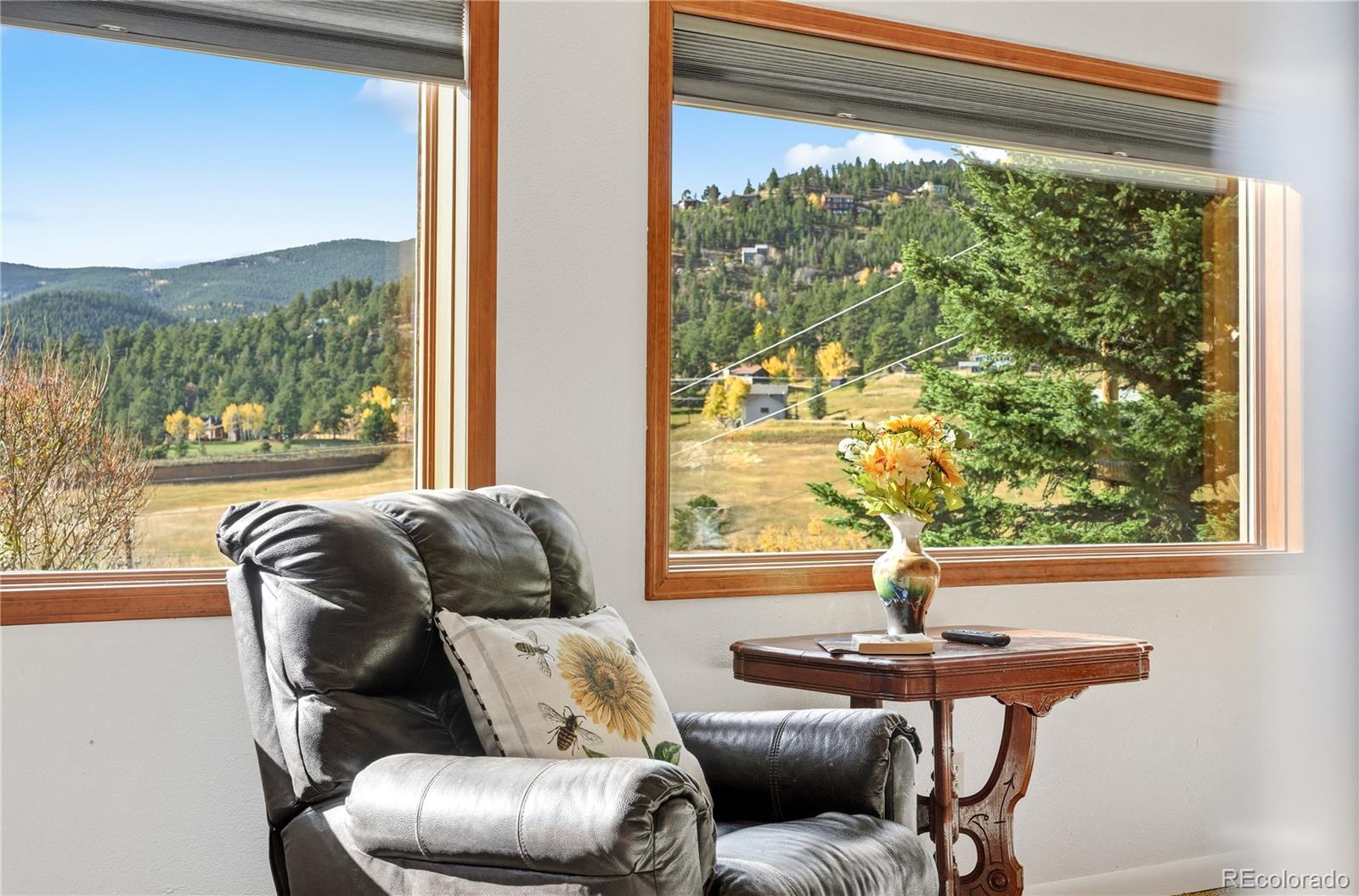 Great Location so close to I-70, very near to the top of Floyd Hill. Beat the traffic to the ski area's! Only 45 minutes to Loveland Skiing. Great for commuters too! Only 22 minutes to Golden. Highly desired Main floor living! Comfortable & spacious 1,360 sq.ft. 3 bedroom, 2 bath, plus large den and lots of storage on a gently sloping nearly one acre. Large grassed fenced dog run for your furry friends. Lots of windows to take in the views of the rolling treed foothills! Enter the home from the front full length trex deck that's great for entertaining! Step into the newly carpeted extended dining/ living room combo with attractive woodstove for cozy warmth on those snowy days. Or, enter at the Den entry to unload from a busy day. Galley Kitchen offers double oven range, portable dishwasher, refrigerator with an extra wall of cabinets nearby in the dining room plus a very large pantry for all your cooking needs! Primary bedroom has a newly updated 3/4 bath! Then ramble down the hallway to a 2nd spacious full bathroom and two more bedrooms, plus the main floor Laundry/utility room. This home is energy efficient being built partially into the hill; called a berm home, southern exposure, passive solar, sun drenched! Front windows are triple pane! Saves on heating and cooling! Step up only a couple feet onto the roof from the back of the home. Guys and gals! You can do all the extra projects you dream up in the detached oversized 2 car garage with plenty of workspace! Walking distance to Open Space for hiking! 10 minute convenience to Evergreen shopping & dining for all your needs!