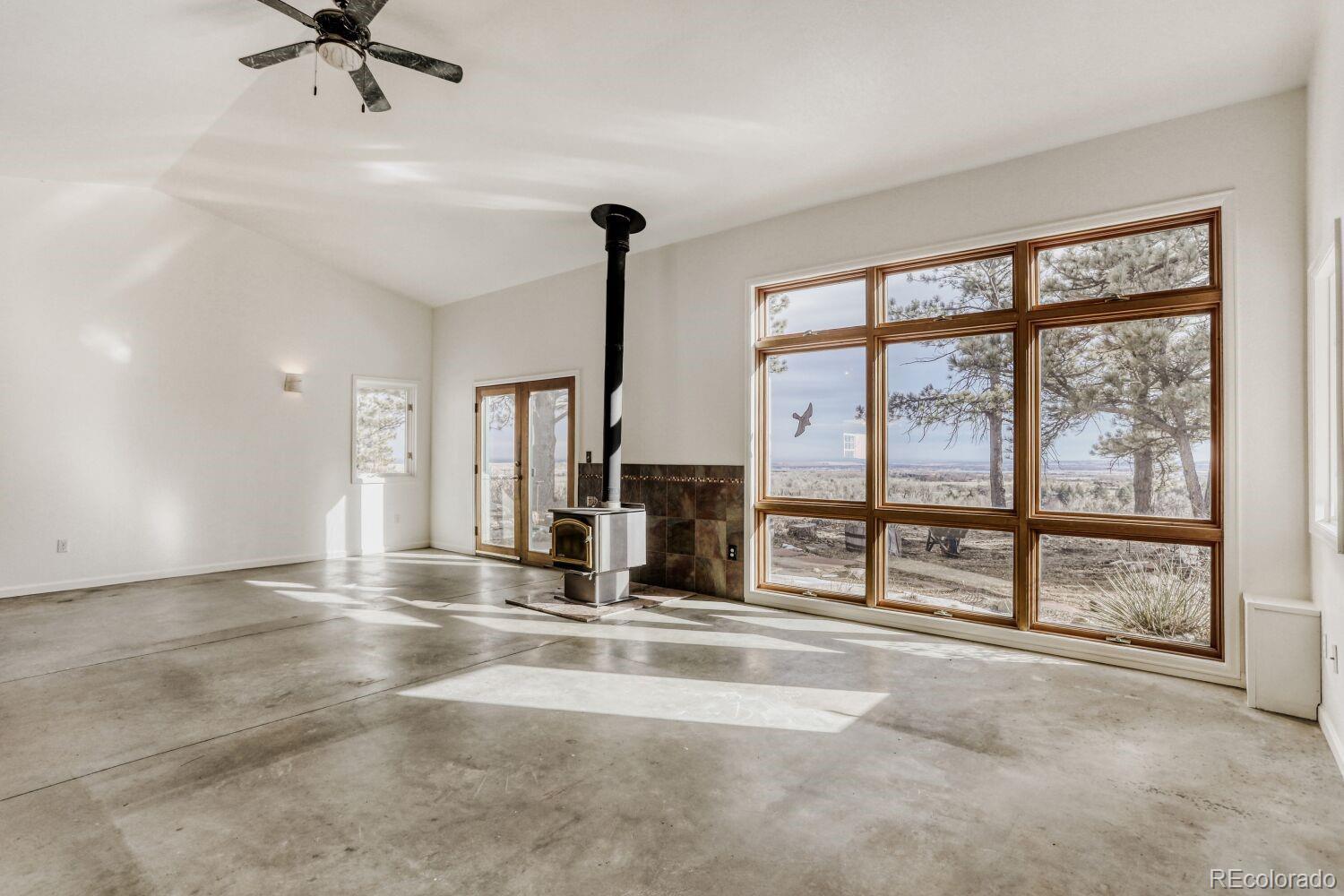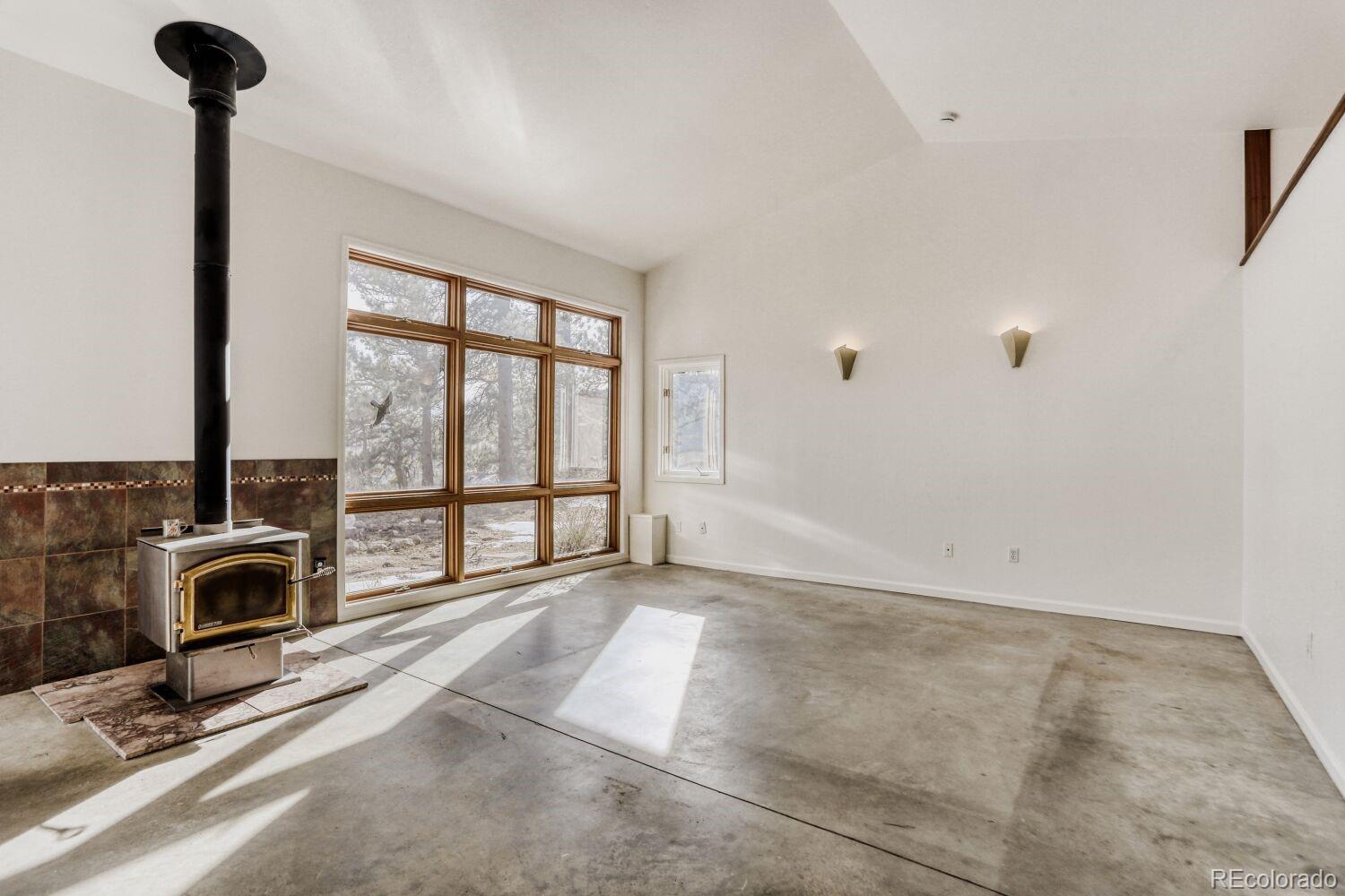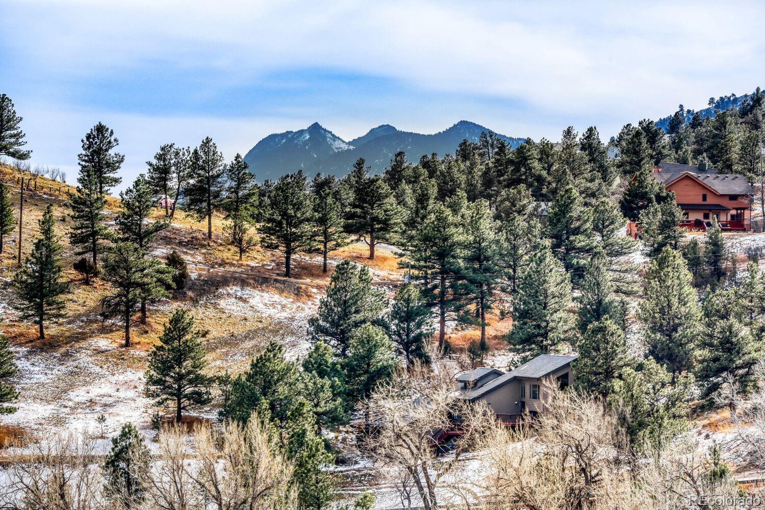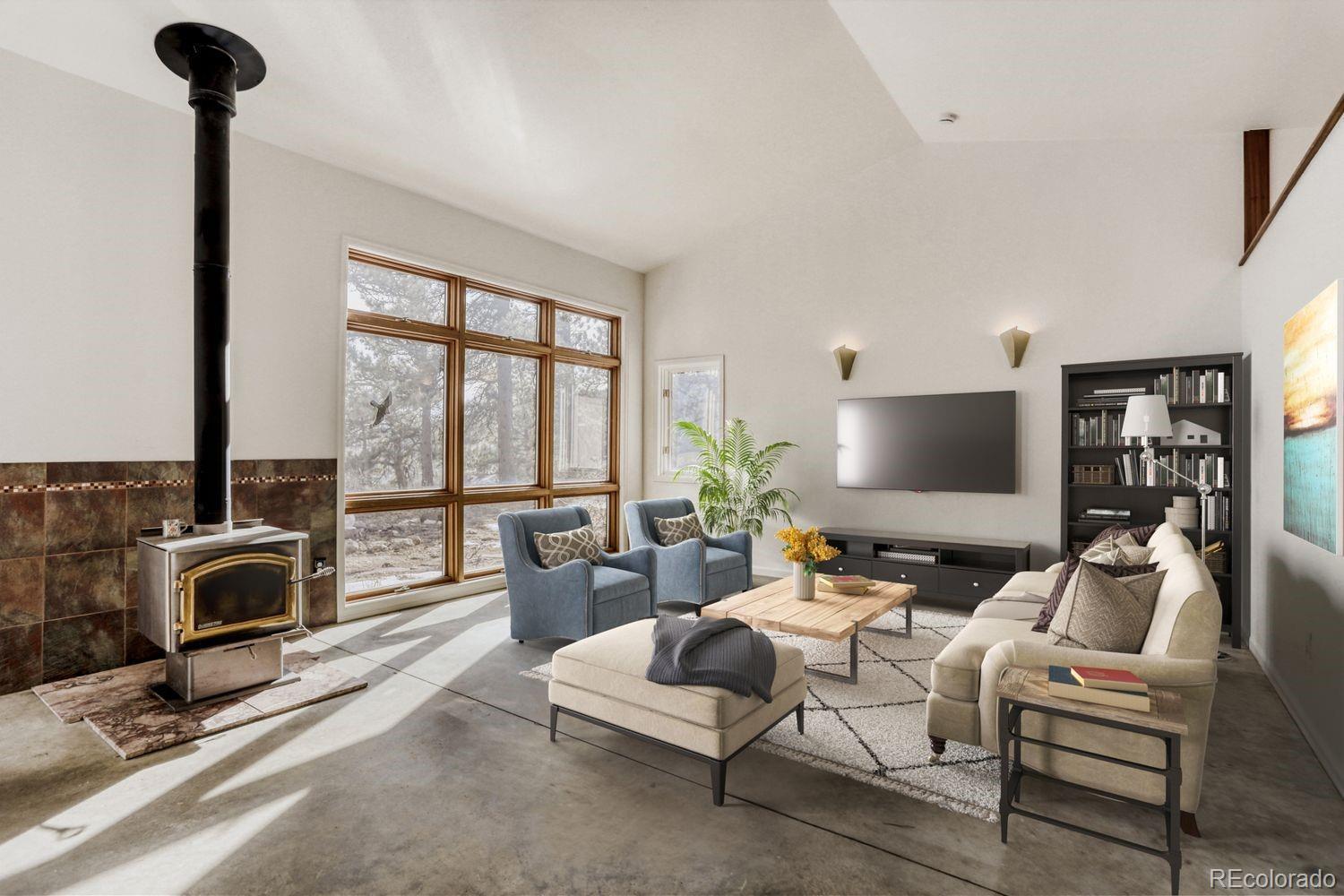 Perched at the top of a private driveway, this rare property offers unobstructed, sweeping views of the Front Range plains, foothills, and iconic Flatirons. South-facing and thoughtfully designed, the home captures abundant natural light and benefits from passive solar warmth, beautifully complemented by modern concrete flooring throughout. An open floor plan with vaulted ceilings enhances the airy feel, while the centrally located wood-burning stove adds cozy warmth and charm to the main living space. Step outside to the south-facing flagstone patio and take in the captivating, ever-changing views—perfect for relaxing or entertaining. Recent updates include a new septic tank, fresh paint, and other improvements, making this home move-in ready. With solid construction and potential to expand, this is a truly special opportunity in an exceptional setting.